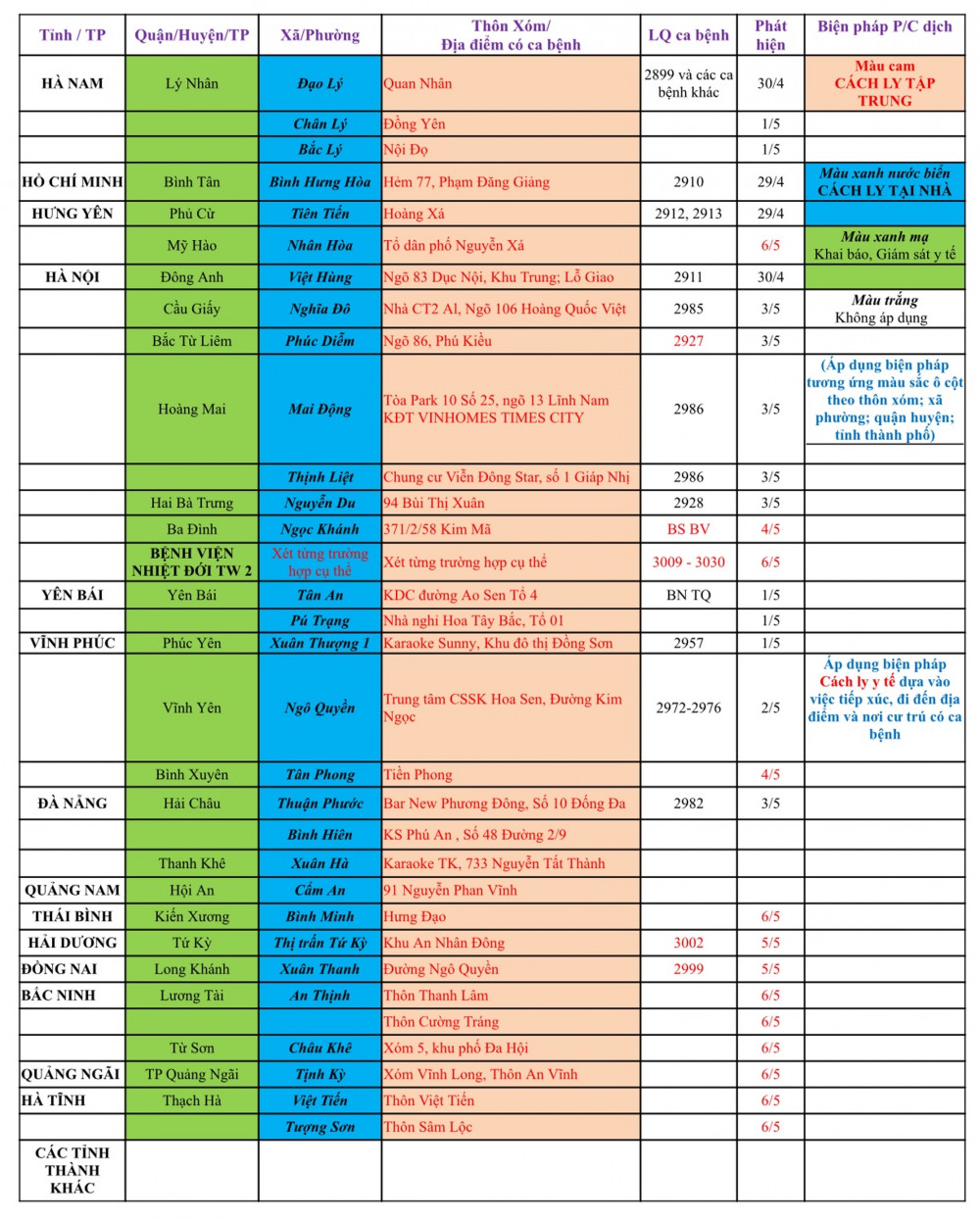 Cách ly tập trung theo MÀU CAM, Cách ly tại nhà theo MÀU XANH NƯỚC BIỂN, Khai báo, giám sát y tế theo MÀU XANH MẠ, Không áp dụng các biện pháp cách ly y tế theo MÀU TRẮNG; Tương ứng với thôn xóm; xã phường; quận huyện; tỉnh thành phố.