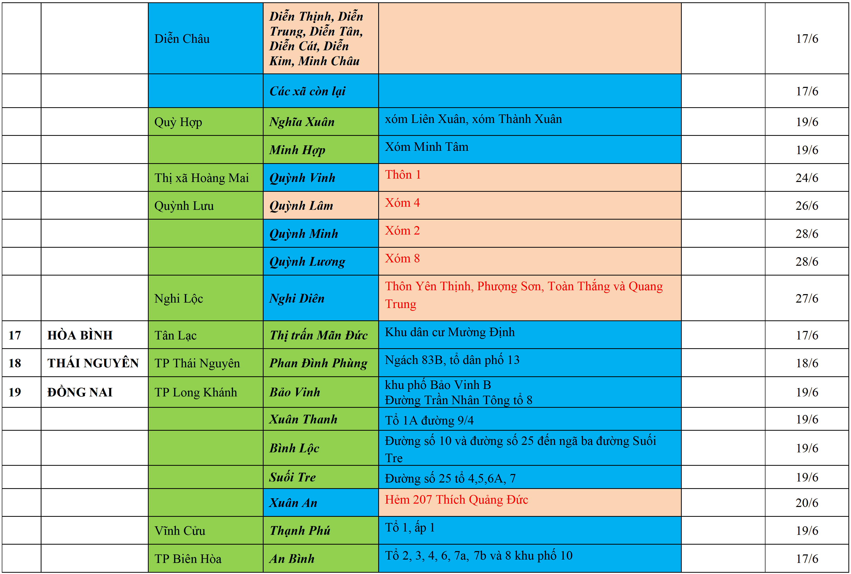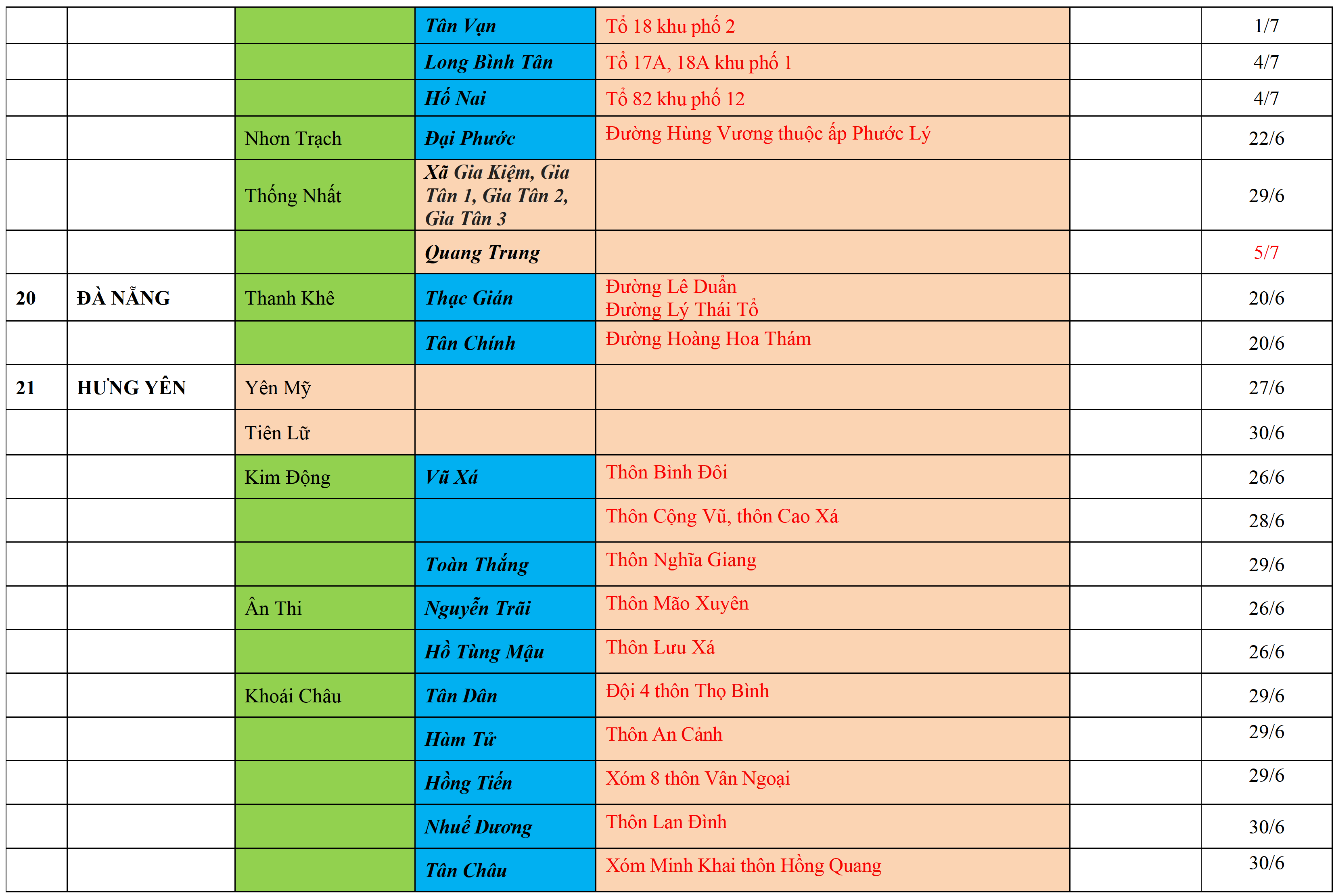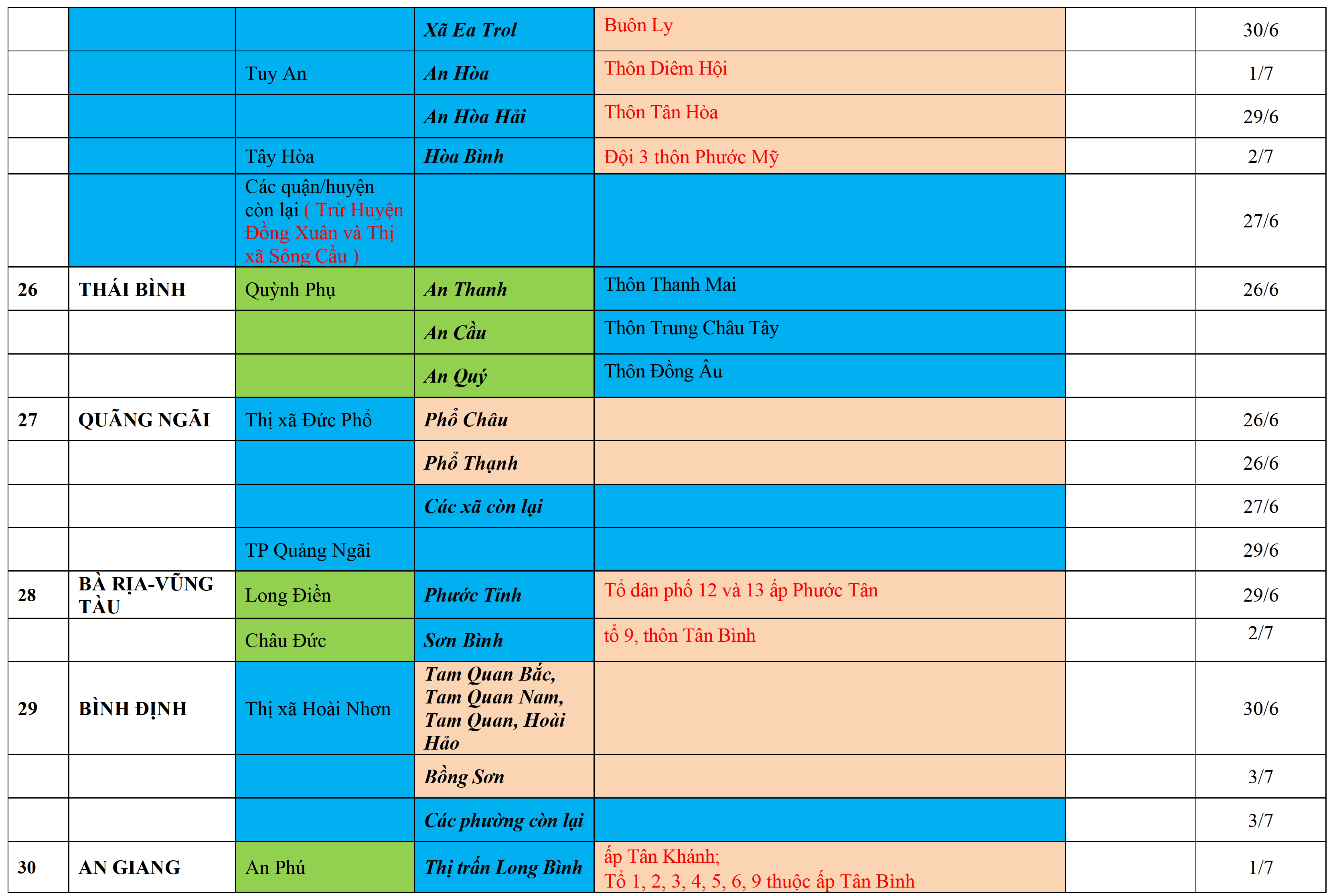 . Áp dụng biện pháp tương ứng màu sắc ô cột theo thôn xóm; xã phường; quận huyện; tỉnh thành phố. Cách ly y tế dựa vào việc tiếp xúc, đi đến địa điểm và nơi cư trú có ca bệnh, theo Thông báo của Bộ Y tế, các tỉnh thành phố.