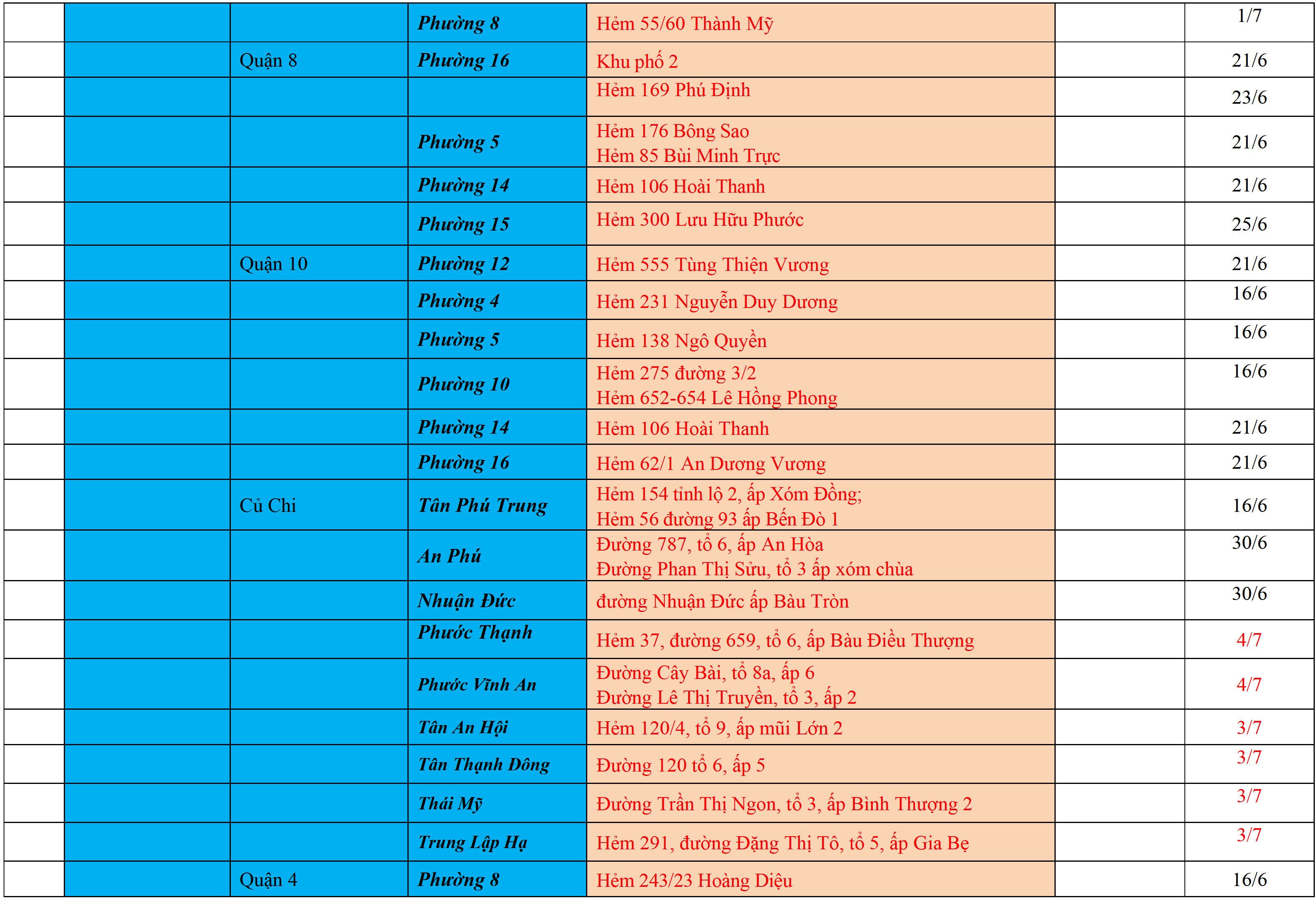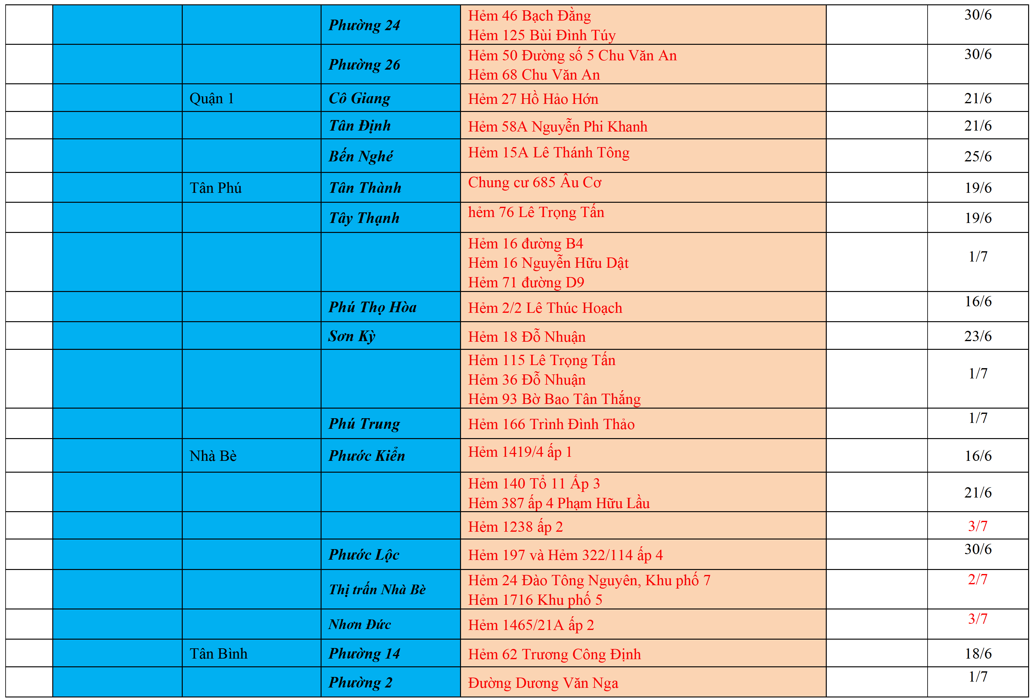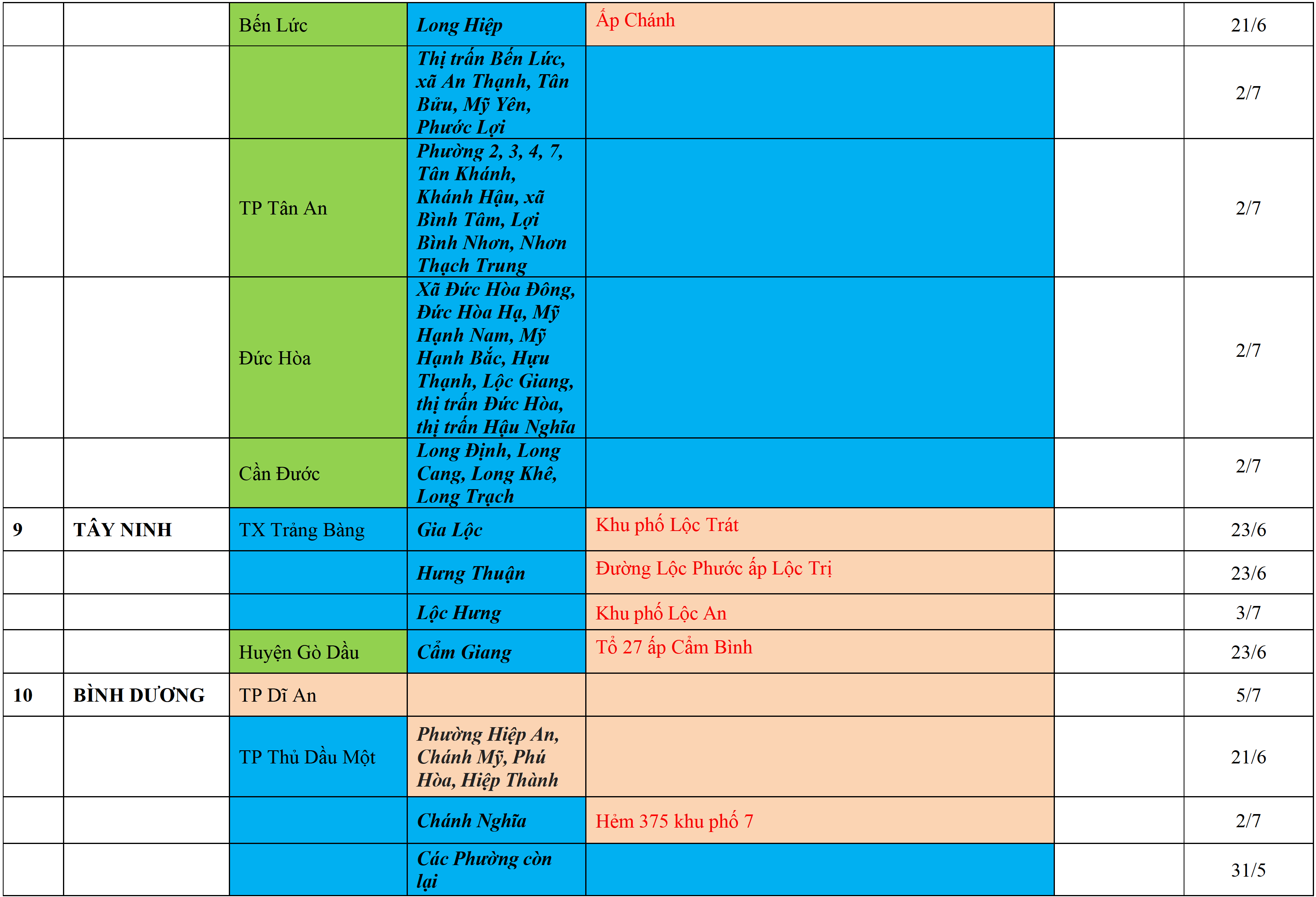 . Áp dụng biện pháp tương ứng màu sắc ô cột theo thôn xóm; xã phường; quận huyện; tỉnh thành phố. Cách ly y tế dựa vào việc tiếp xúc, đi đến địa điểm và nơi cư trú có ca bệnh, theo Thông báo của Bộ Y tế, các tỉnh thành phố.
