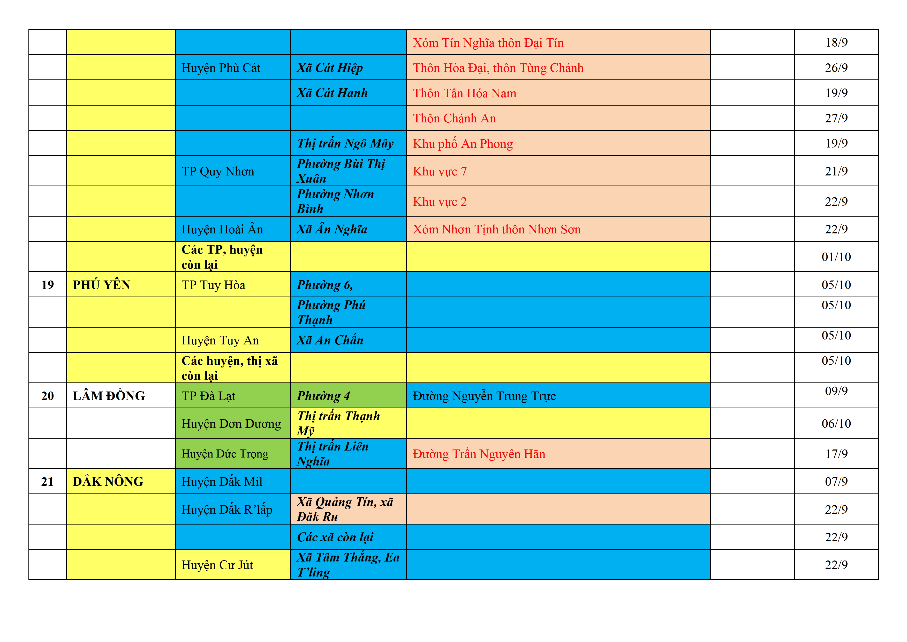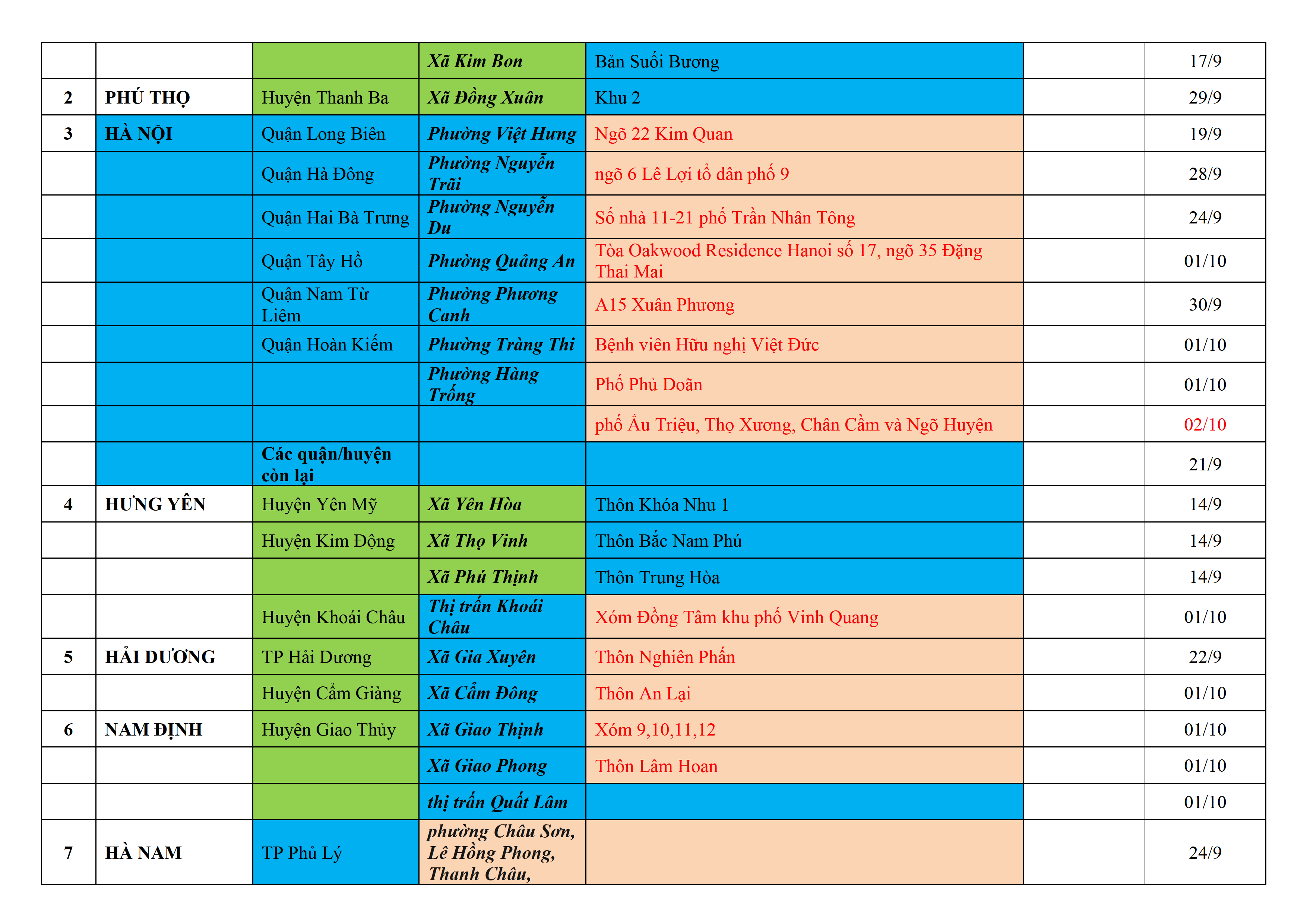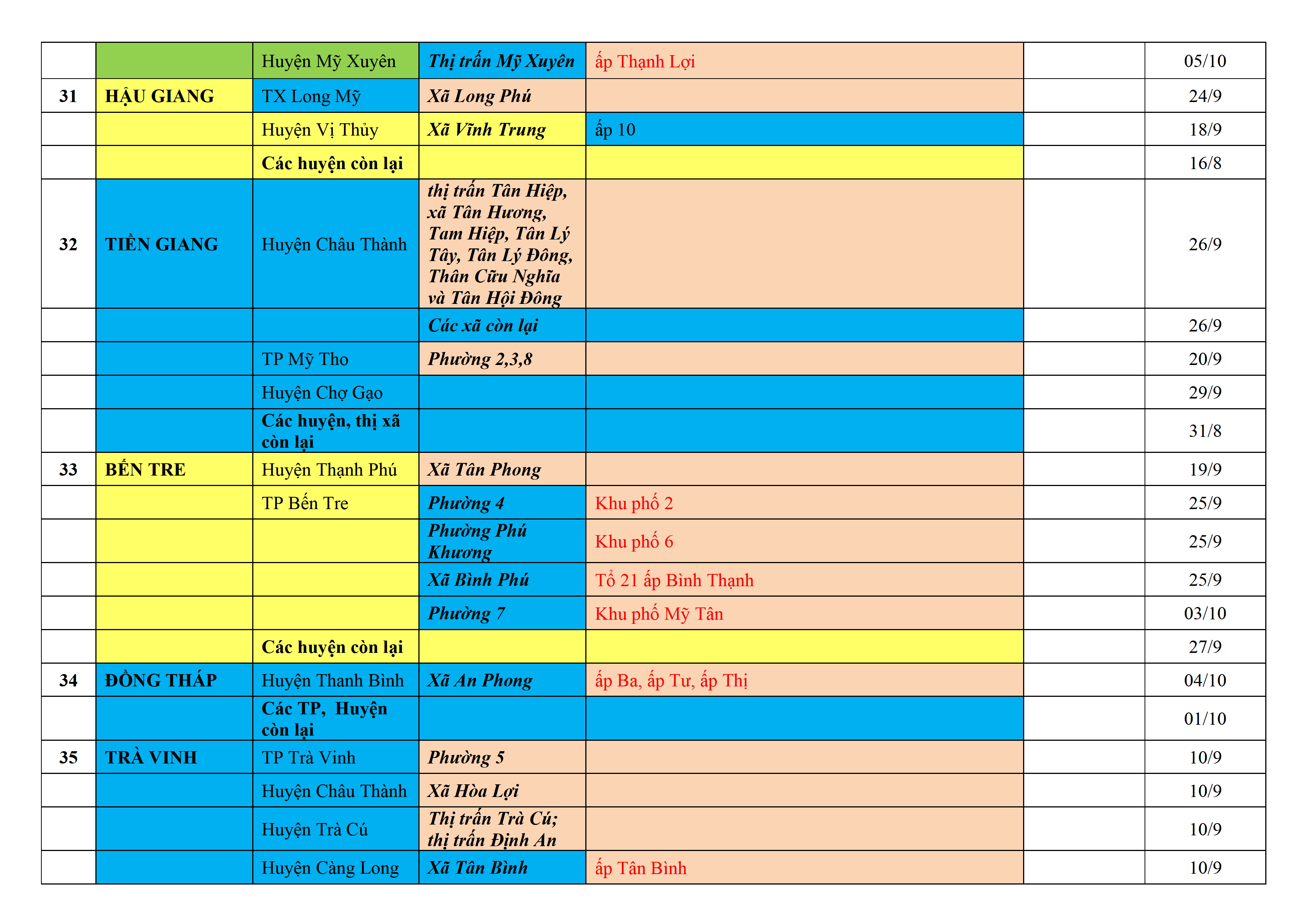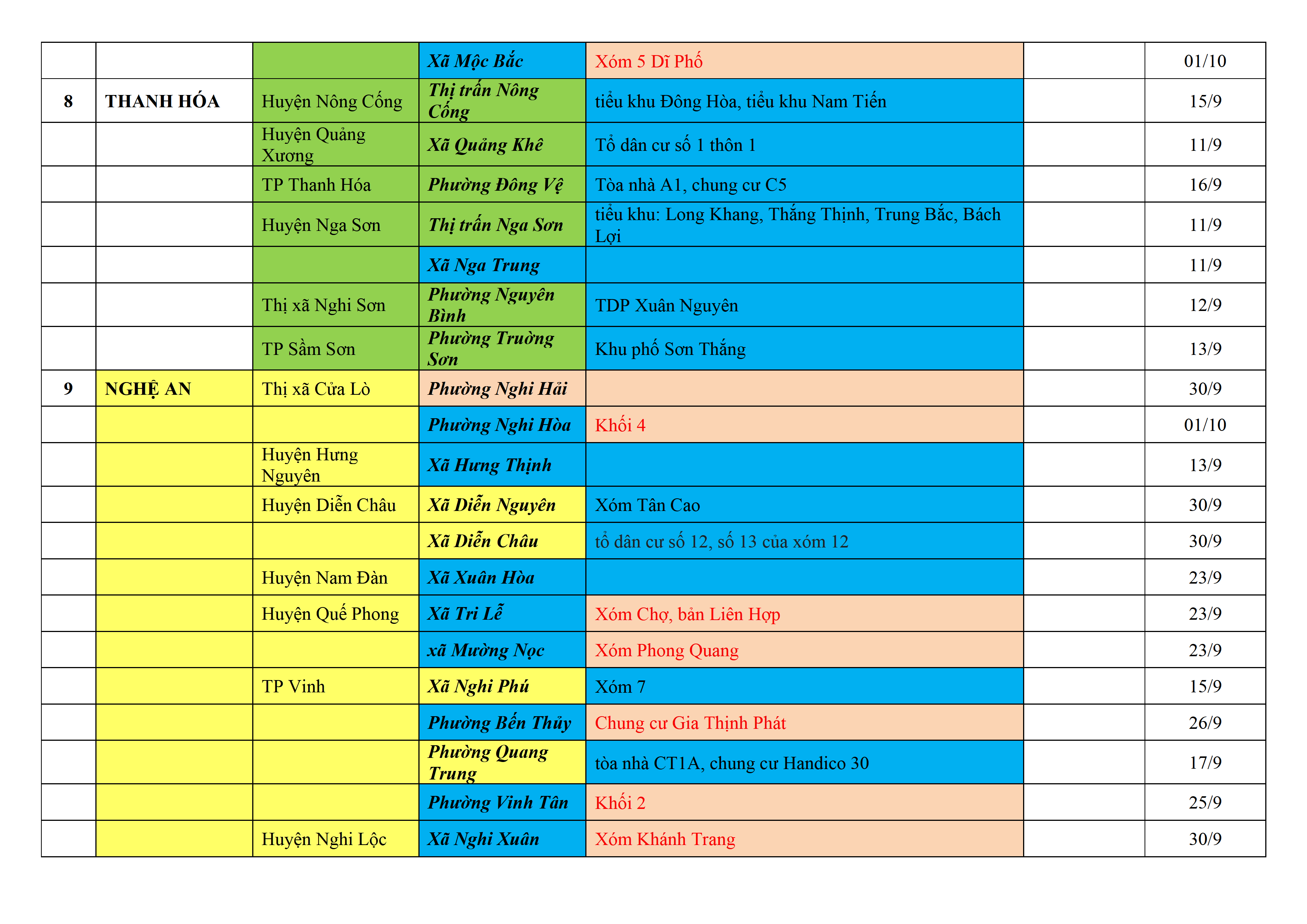 Biện pháp phòng, chống dịch COVID-19: Áp dụng biện pháp tương ứng màu sắc ô cột theo thôn xóm; xã phường; quận huyện; tỉnh thành phố. Cách ly y tế dựa vào việc tiếp xúc, đi đến địa điểm và nơi cư trú có ca bệnh, theo Thông báo của Bộ Y tế, các tỉnh thành phố.