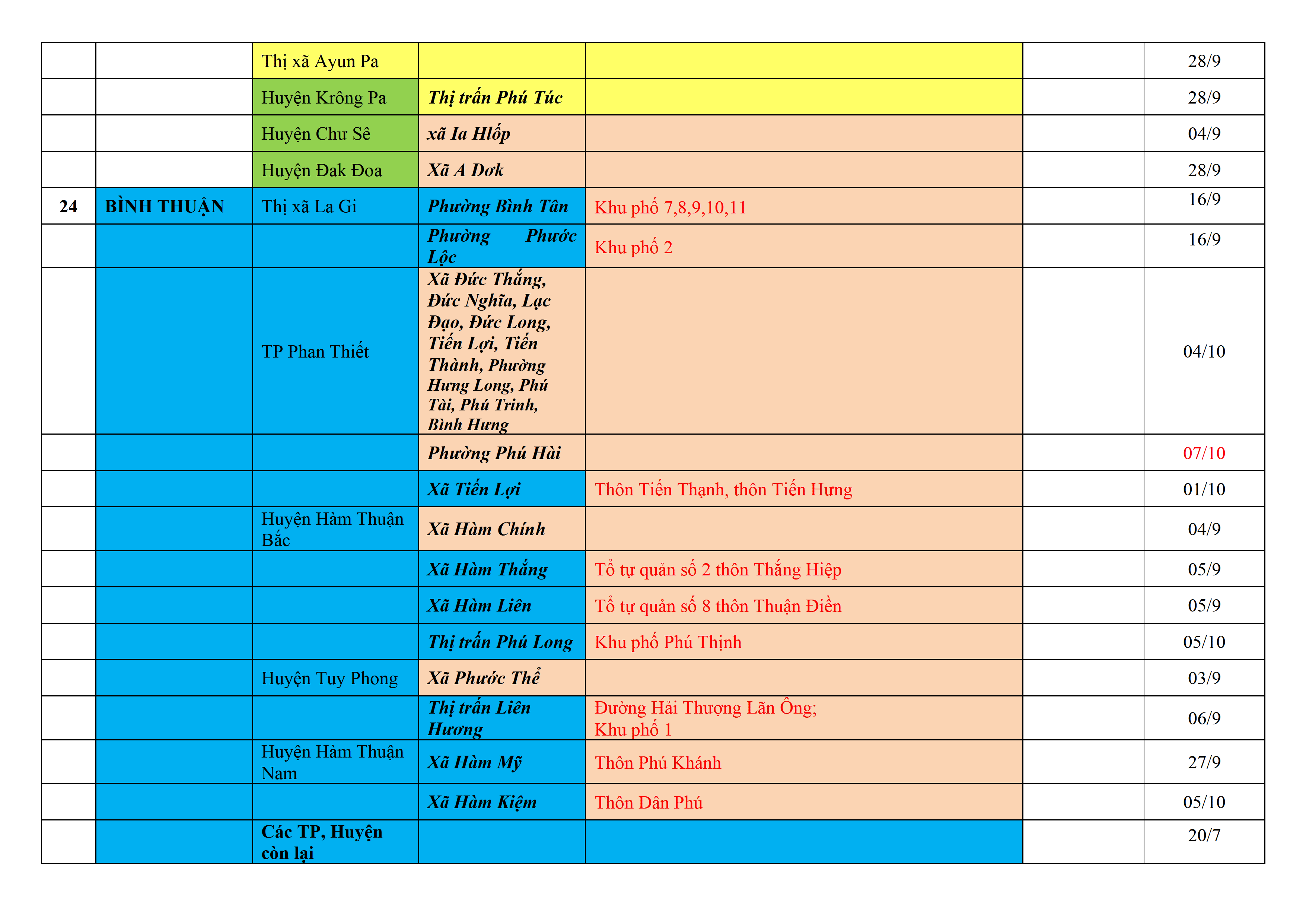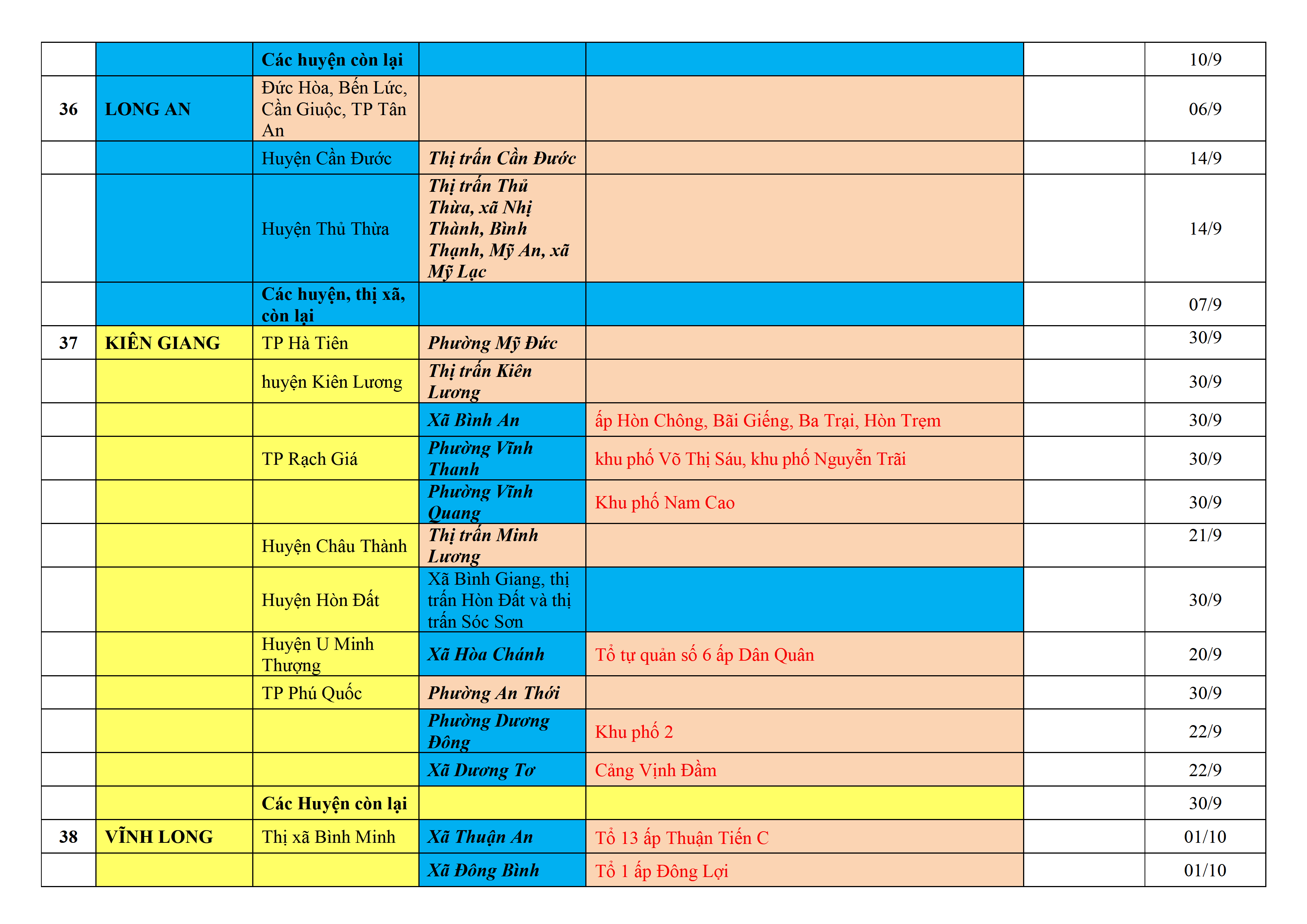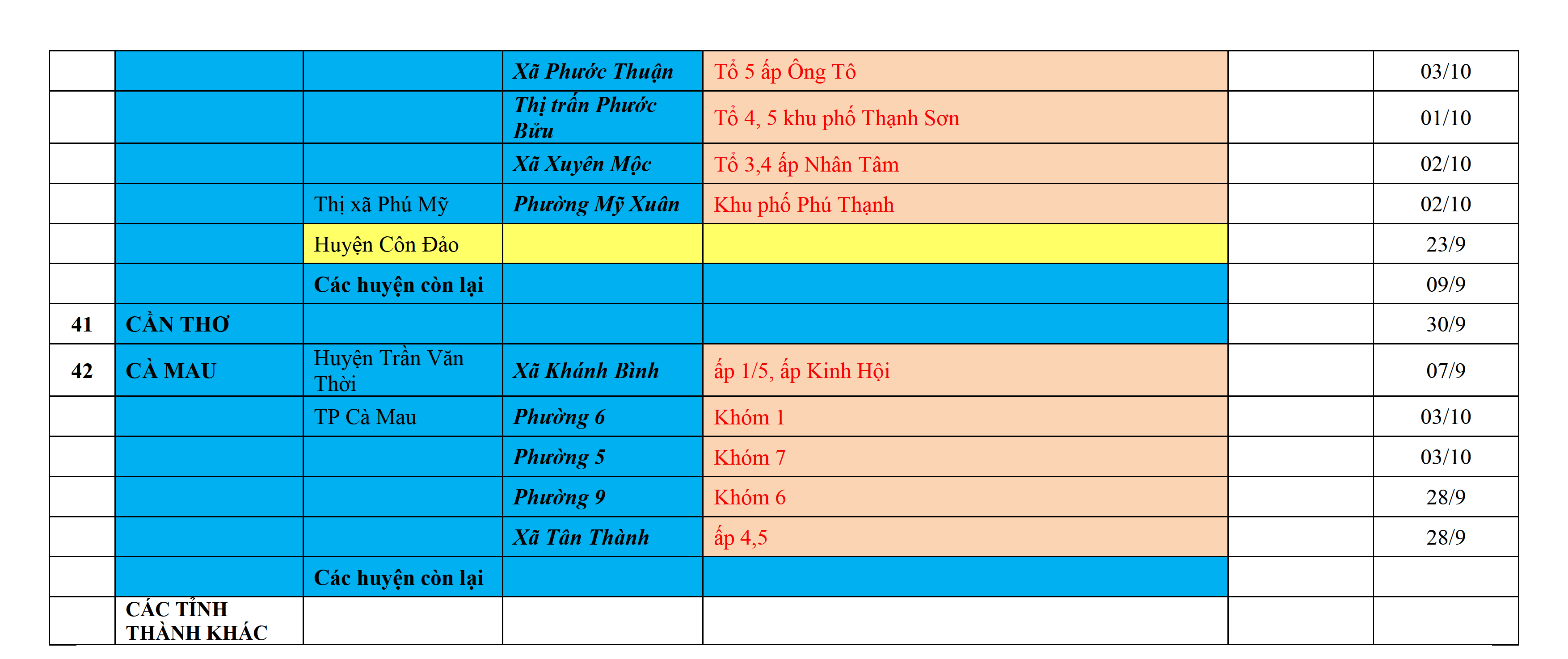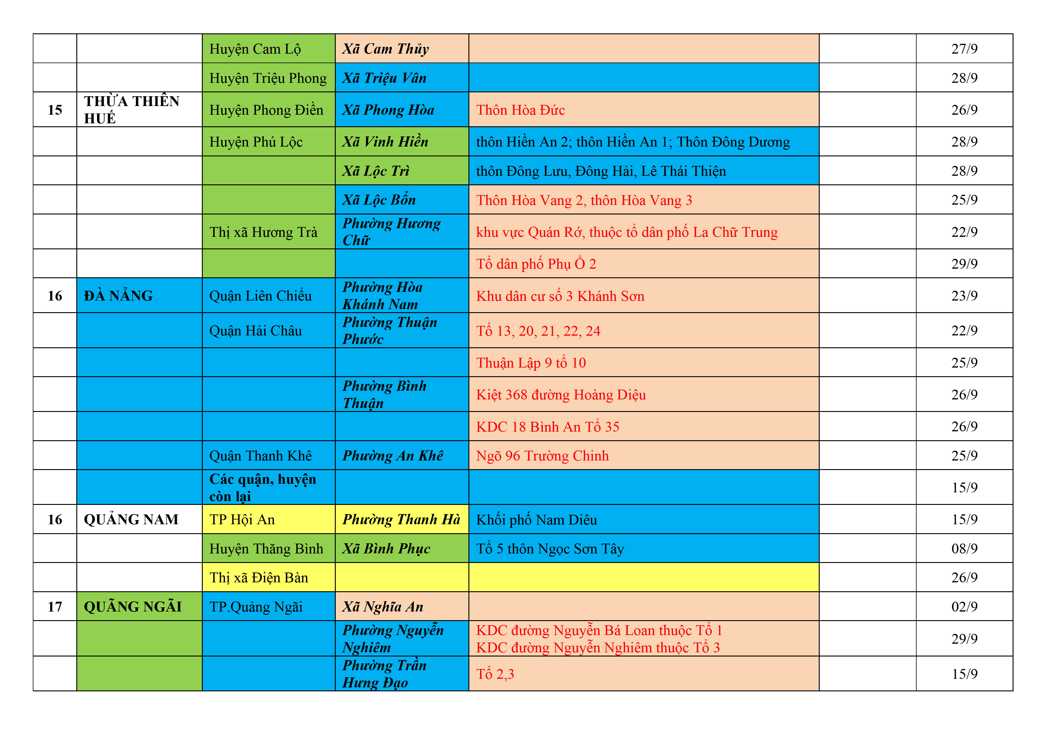 Biện pháp phòng, chống dịch COVID-19: Áp dụng biện pháp tương ứng màu sắc ô cột theo thôn xóm; xã phường; quận huyện; tỉnh thành phố. Cách ly y tế dựa vào việc tiếp xúc, đi đến địa điểm và nơi cư trú có ca bệnh, theo Thông báo của Bộ Y tế, các tỉnh thành phố.