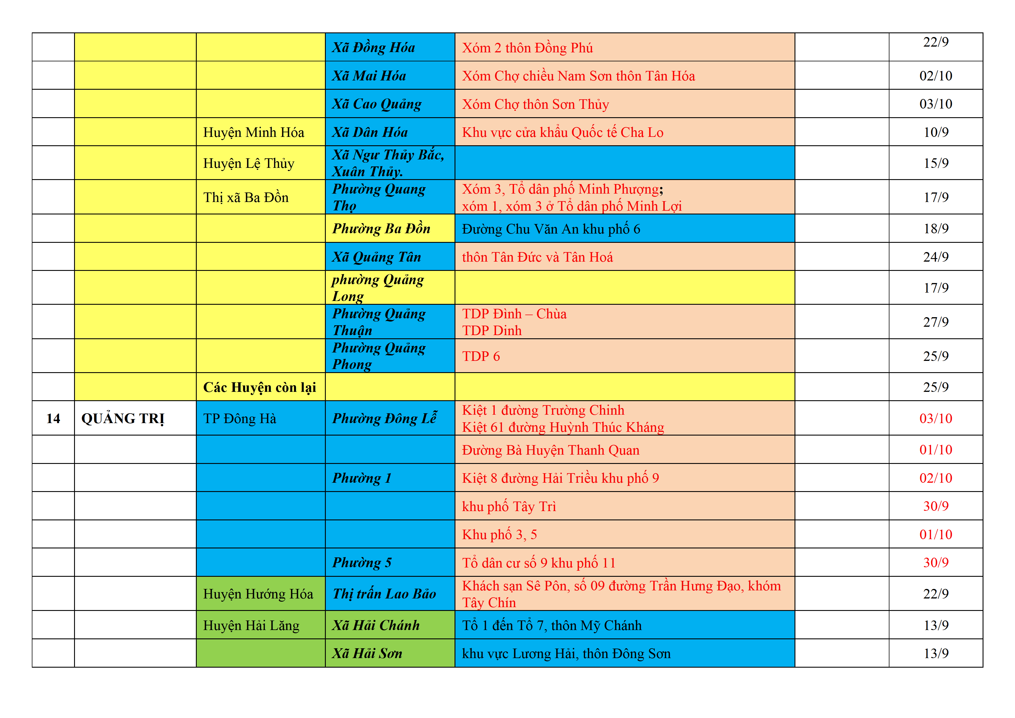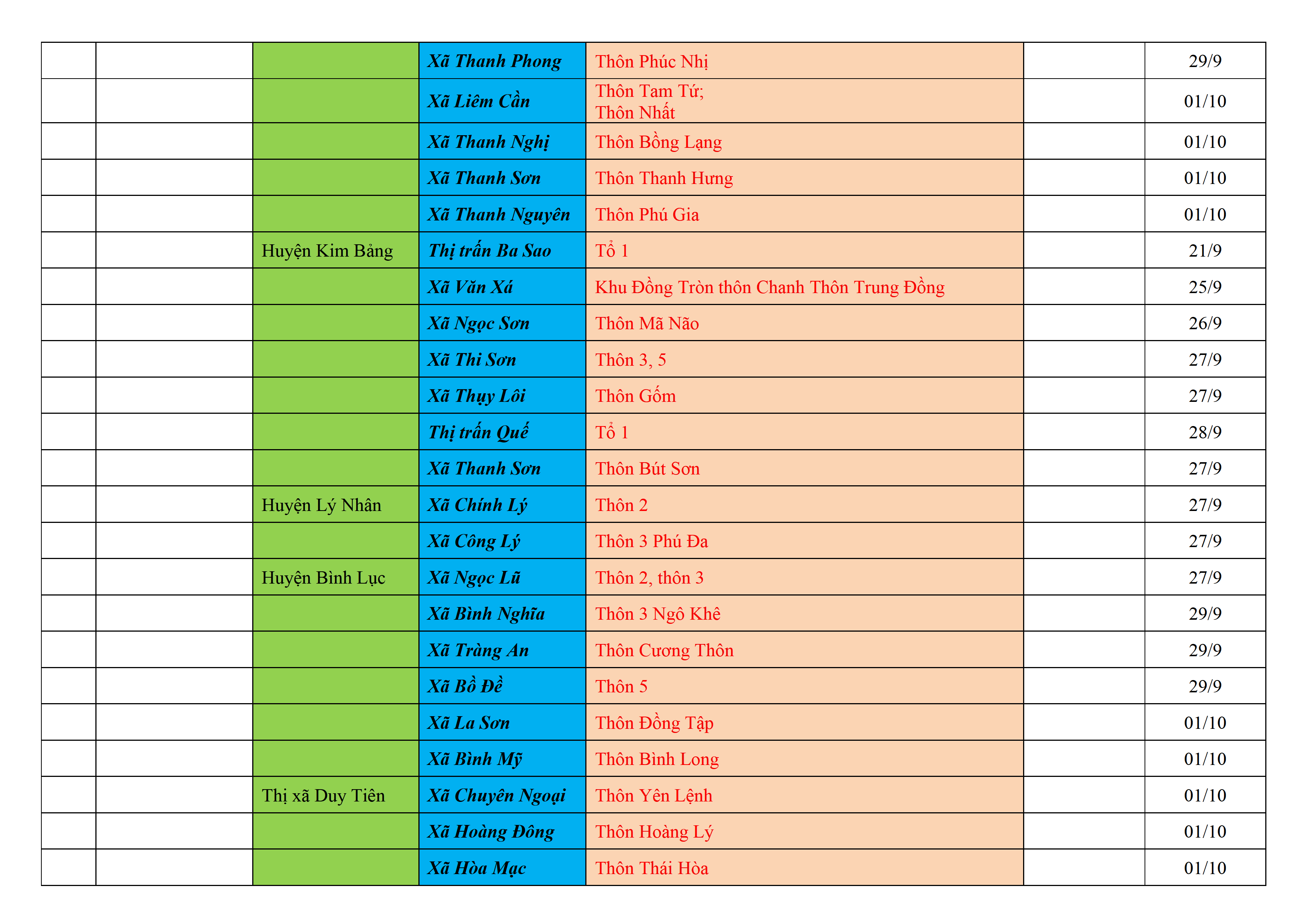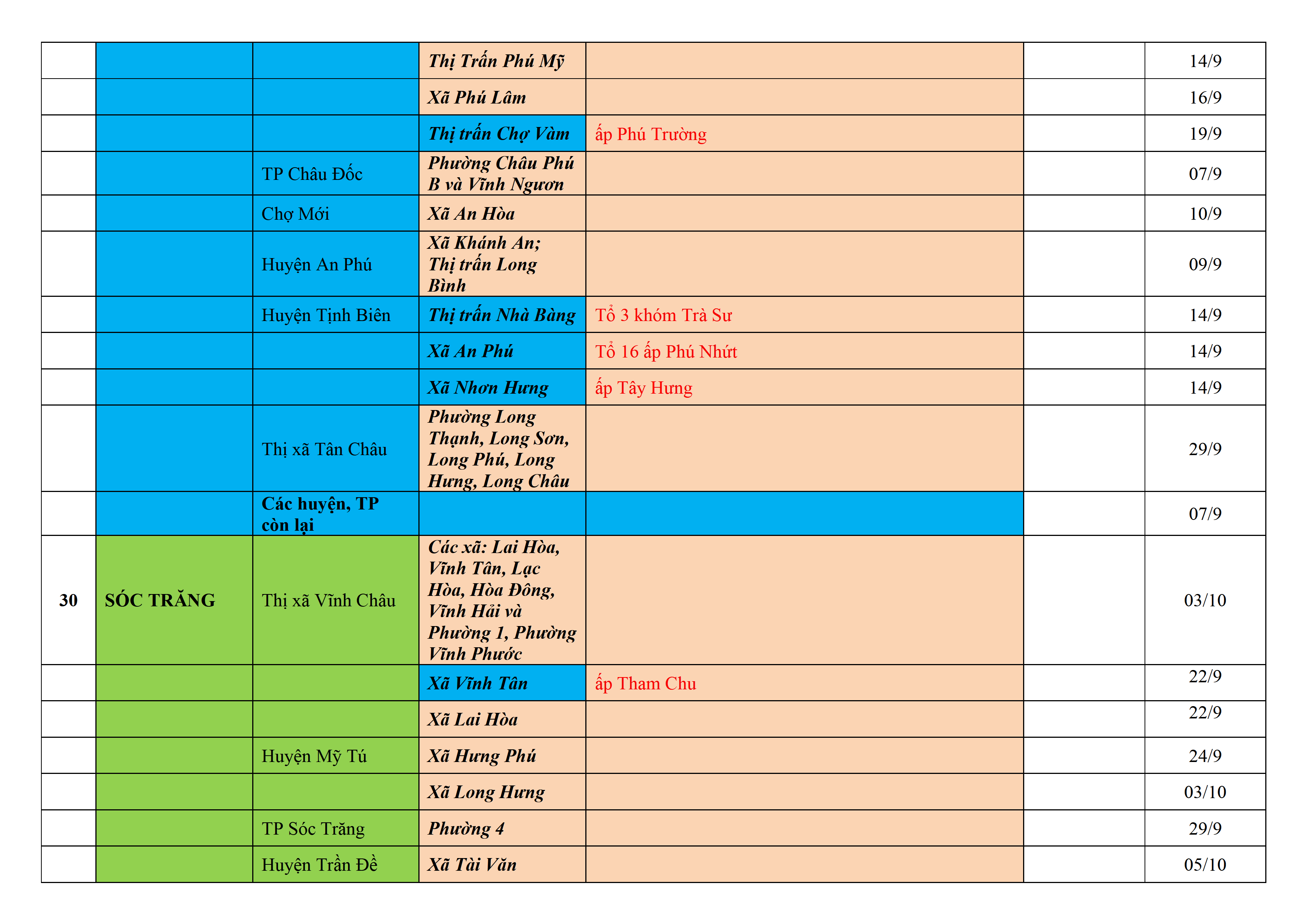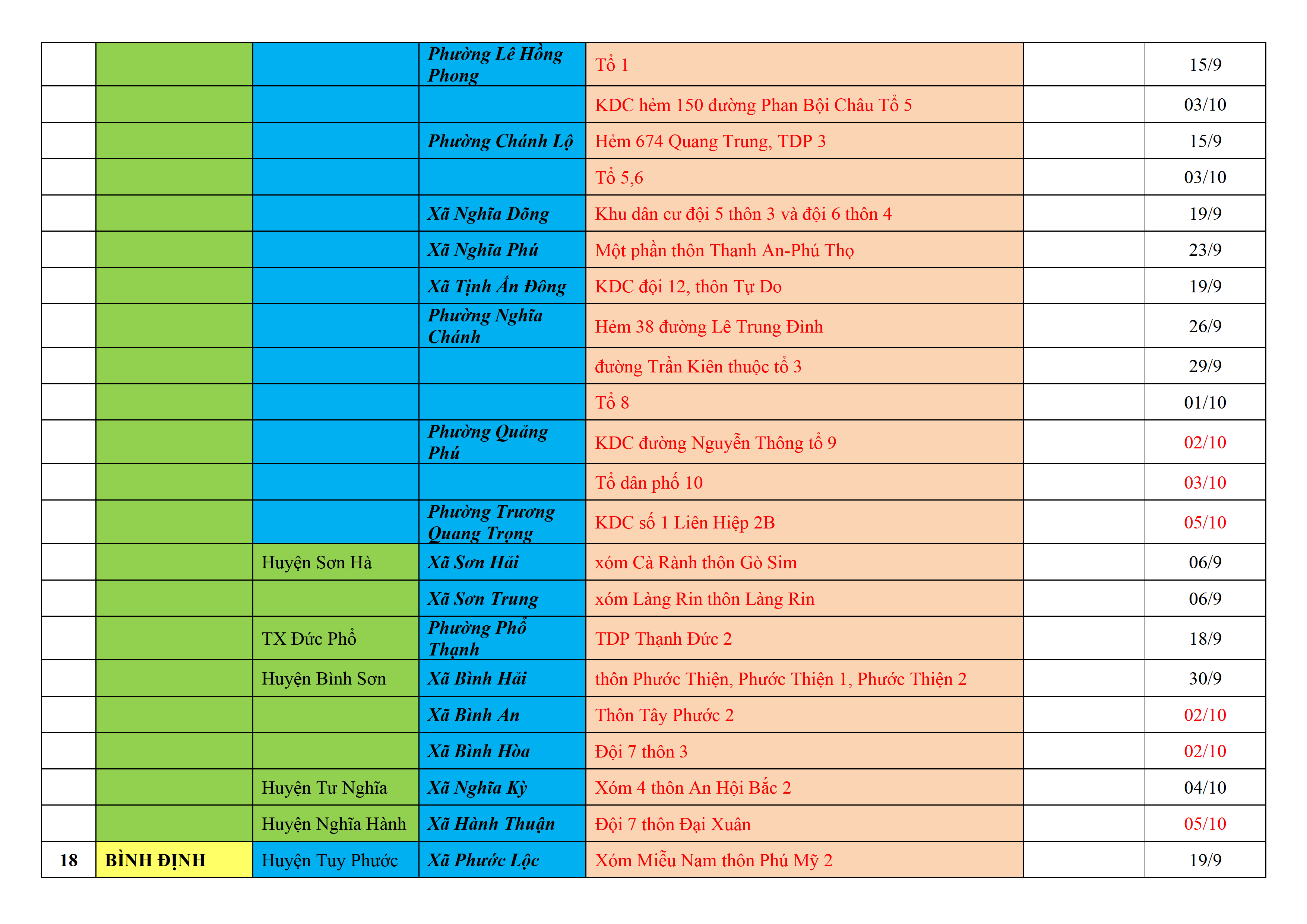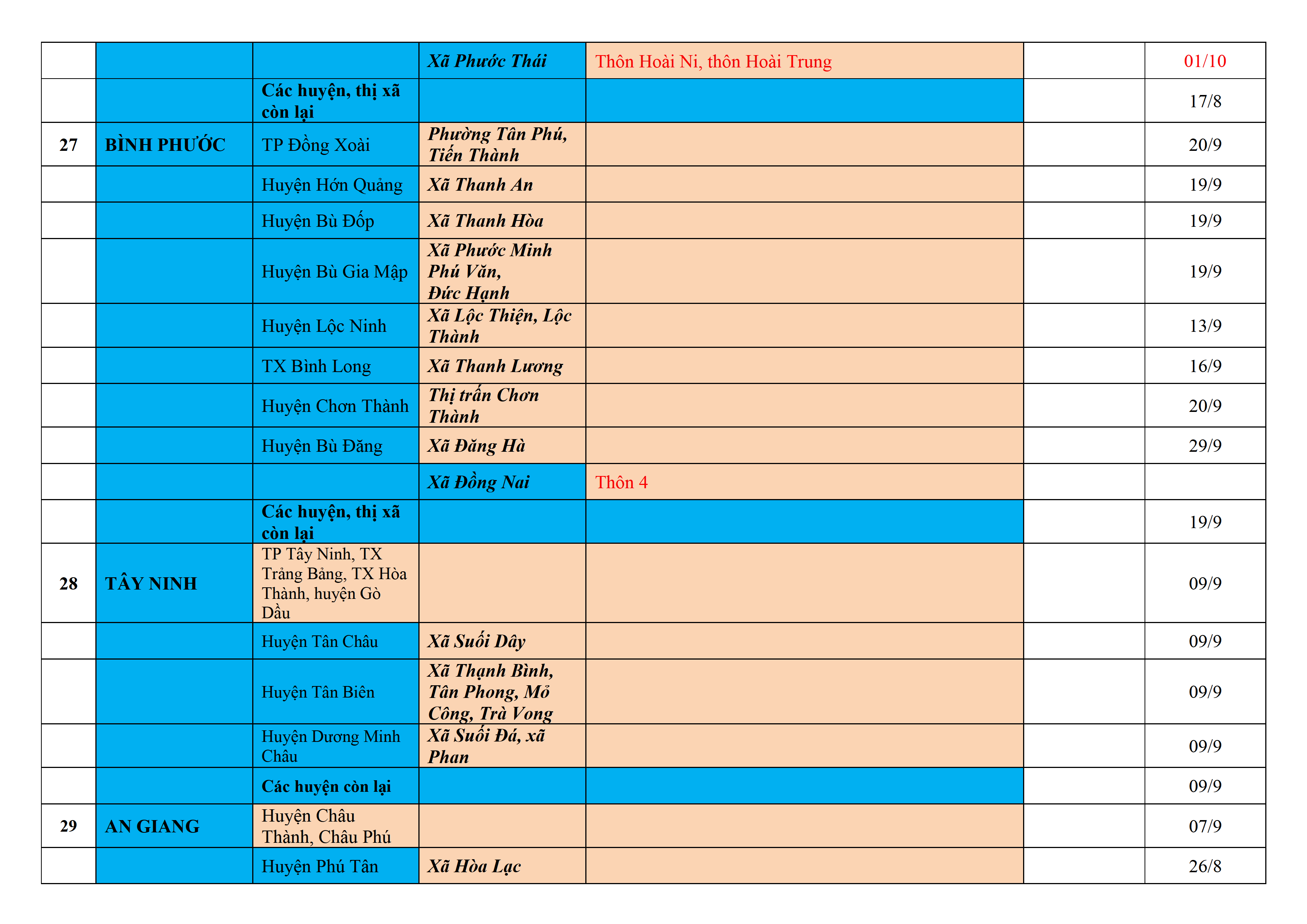 Biện pháp phòng, chống dịch COVID-19: Áp dụng biện pháp tương ứng màu sắc ô cột theo thôn xóm; xã phường; quận huyện; tỉnh thành phố. Cách ly y tế dựa vào việc tiếp xúc, đi đến địa điểm và nơi cư trú có ca bệnh, theo Thông báo của Bộ Y tế, các tỉnh thành phố.