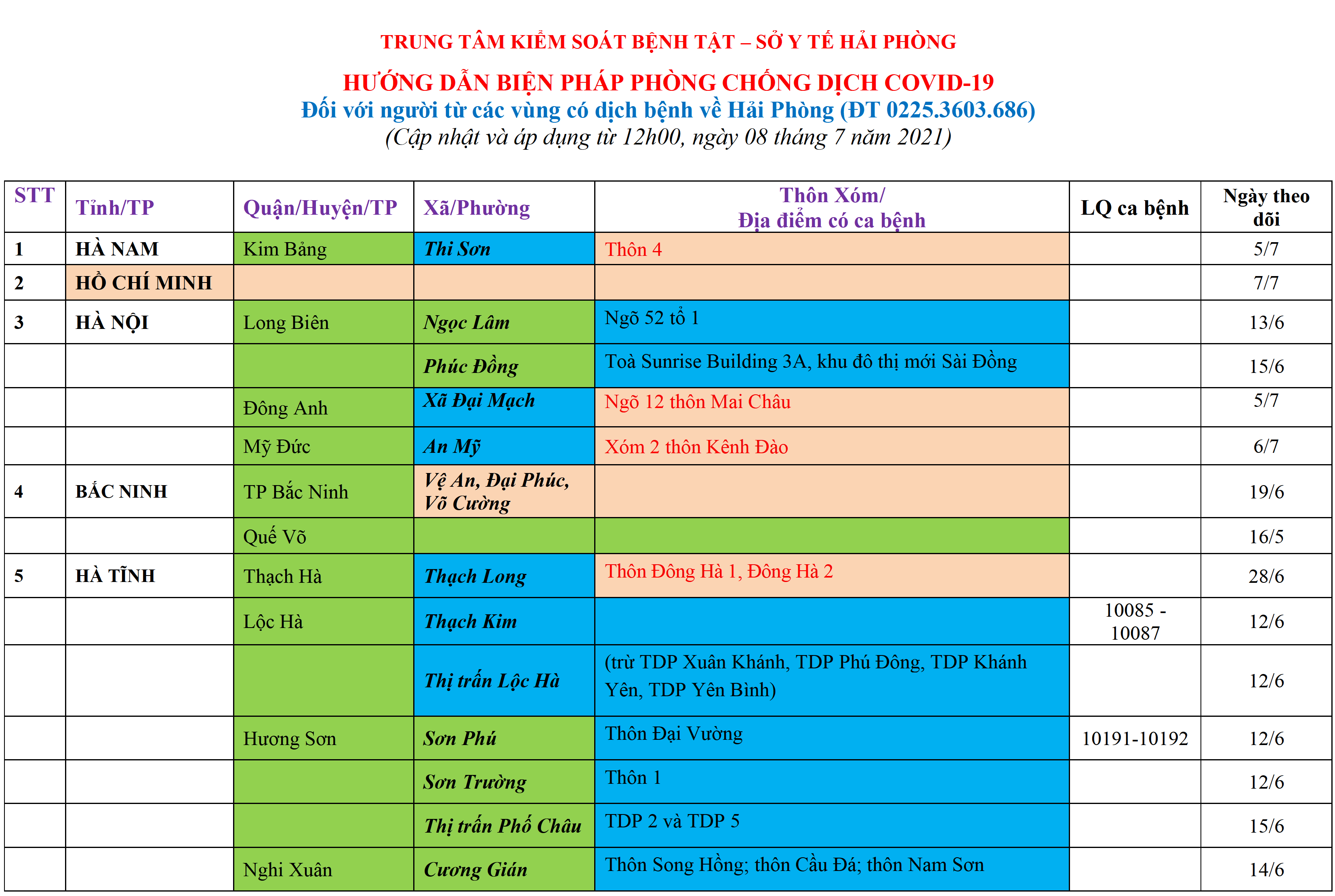 – Từ 12h00 ngày 07/7/2021 áp dụng cách ly tập trung 21 ngày đối với tất cả những người về Hải Phòng từ TP. Hồ Chí Minh;