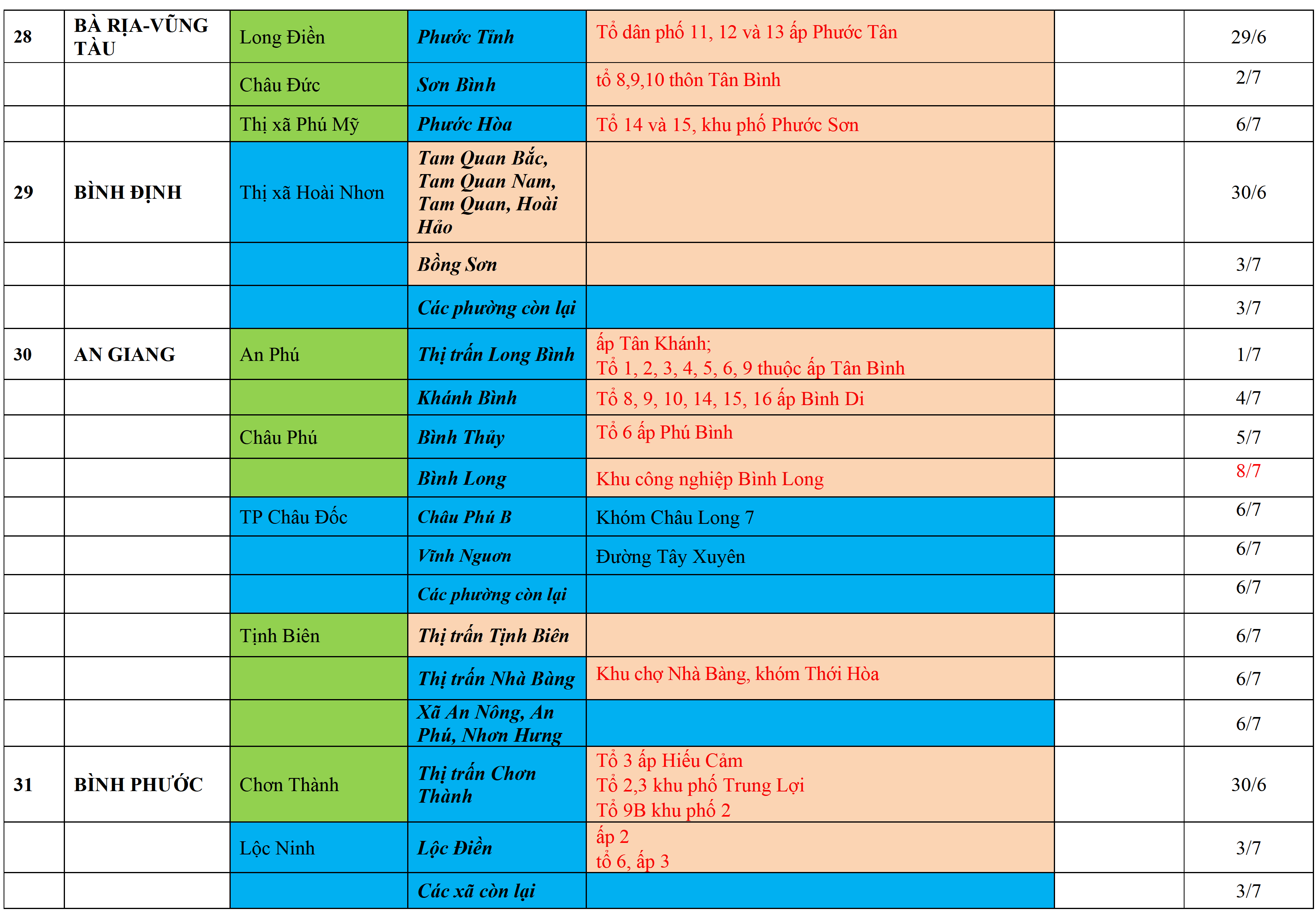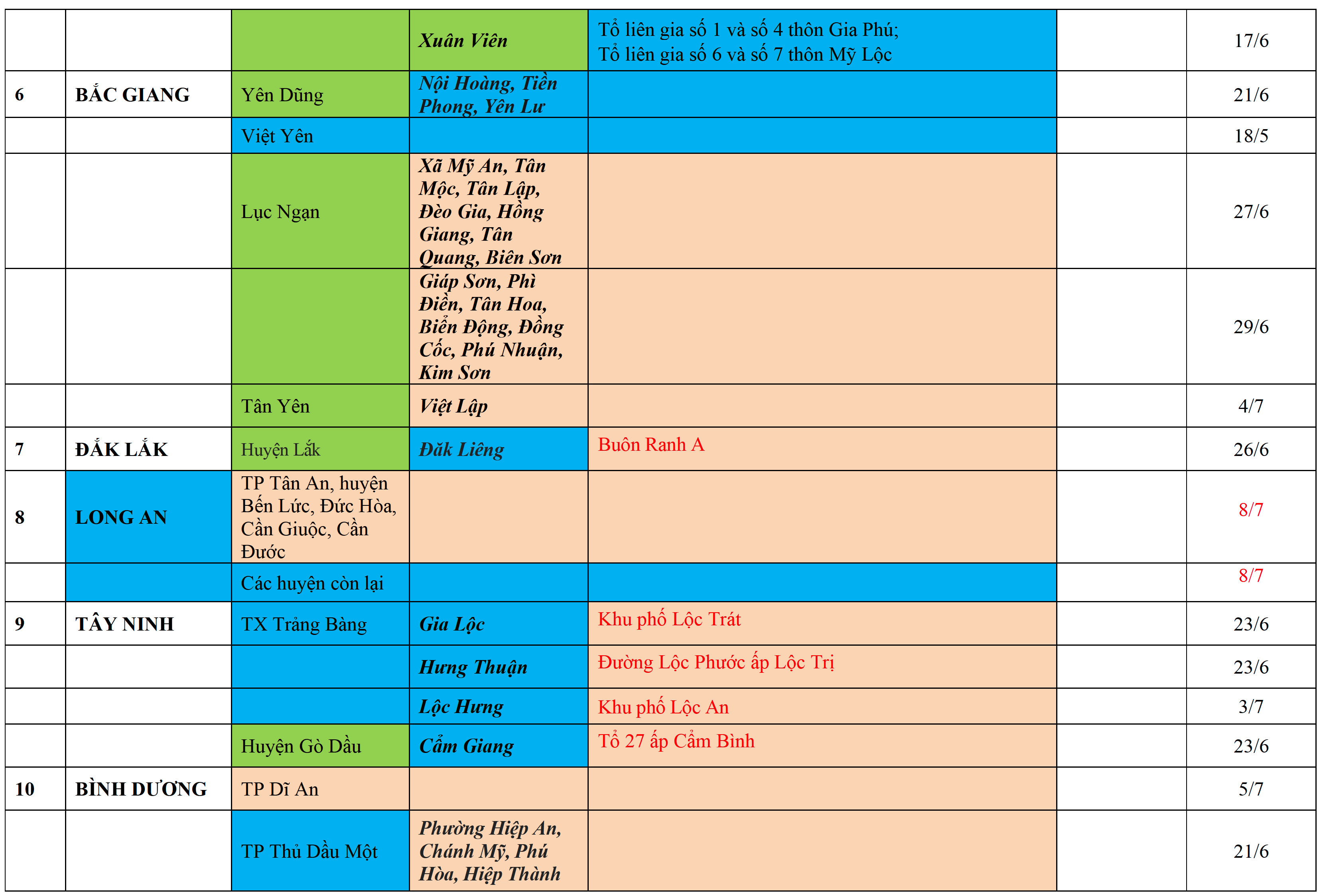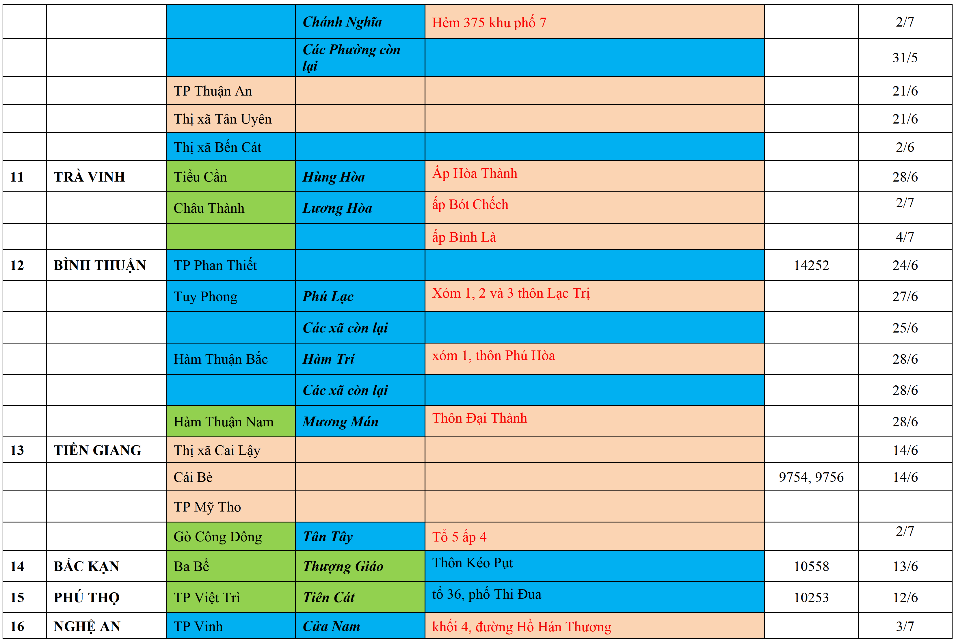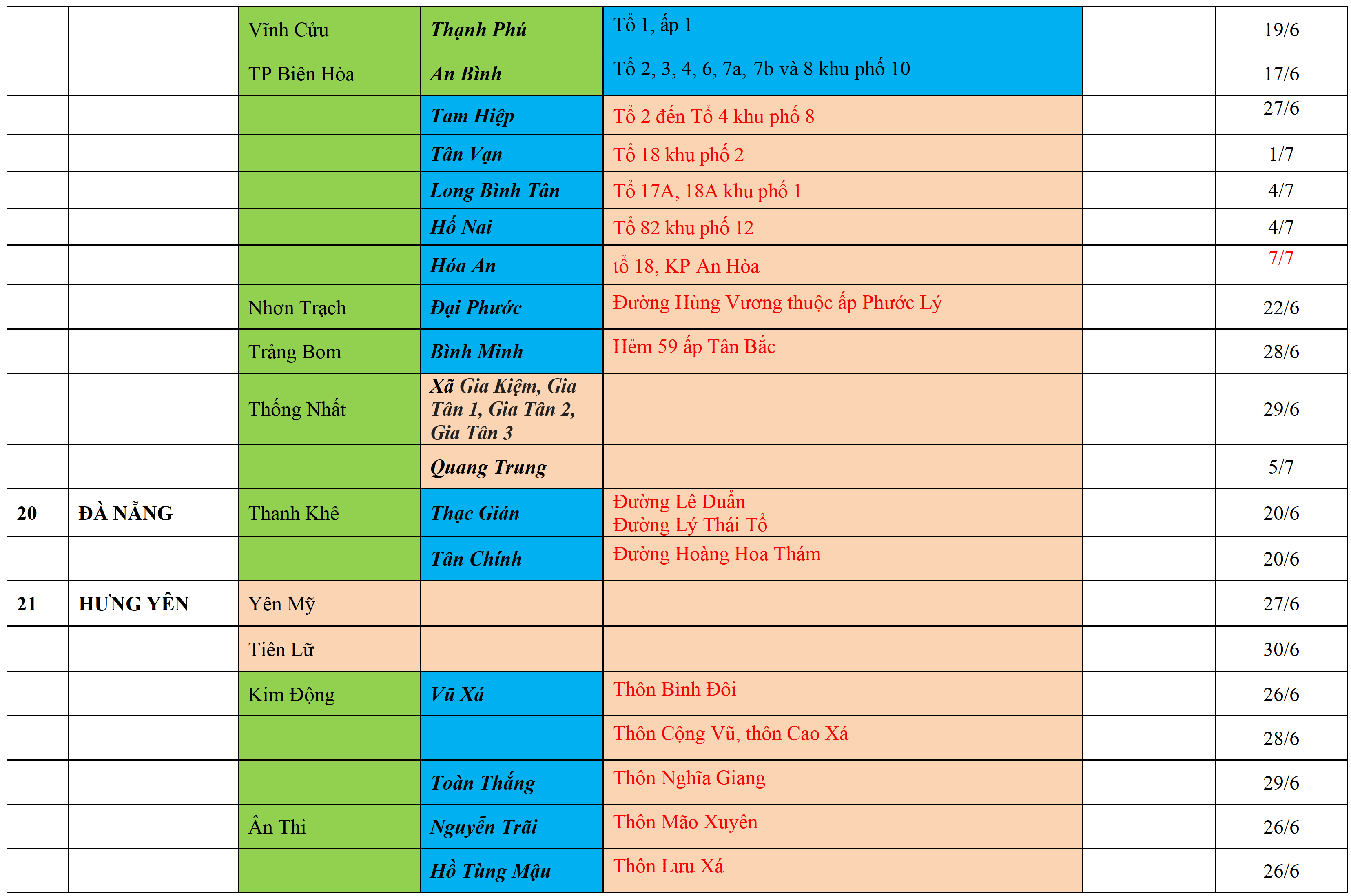 . Áp dụng biện pháp tương ứng màu sắc ô cột theo thôn xóm; xã phường; quận huyện; tỉnh thành phố. Cách ly y tế dựa vào việc tiếp xúc, đi đến địa điểm và nơi cư trú có ca bệnh, theo Thông báo của Bộ Y tế, các tỉnh thành phố.