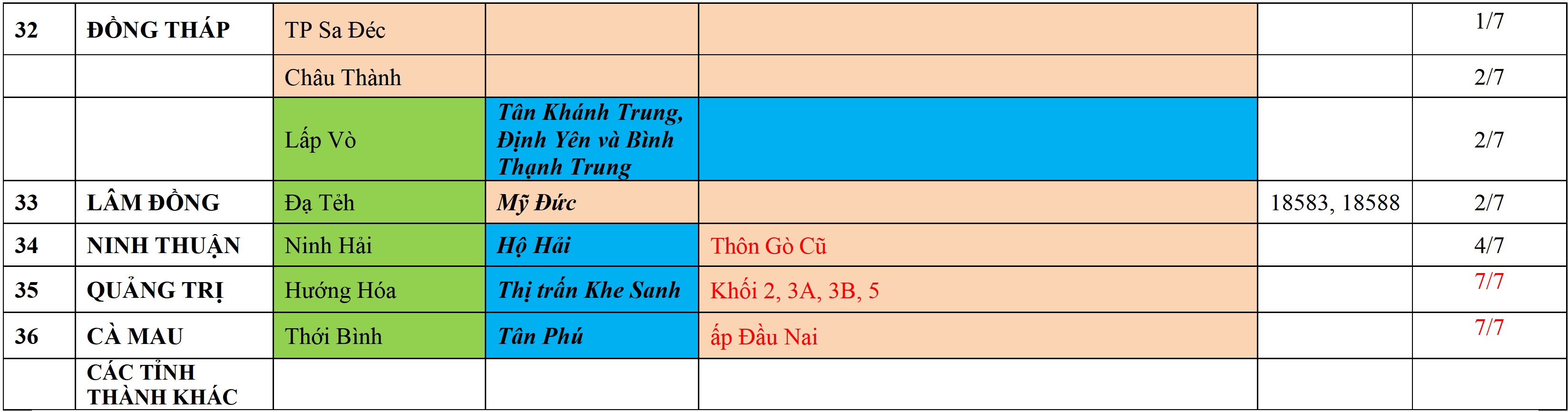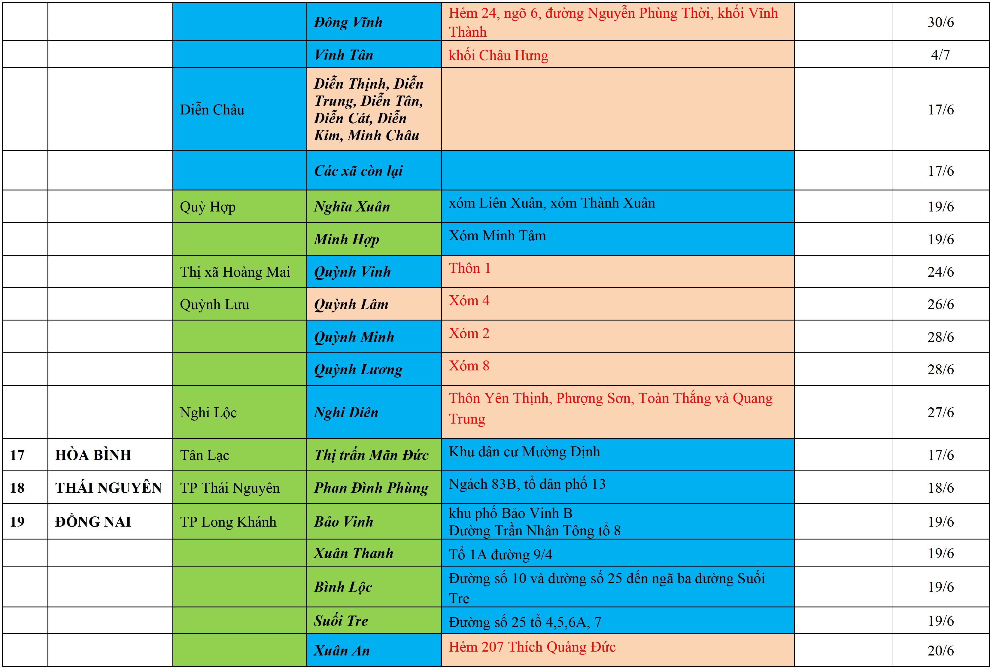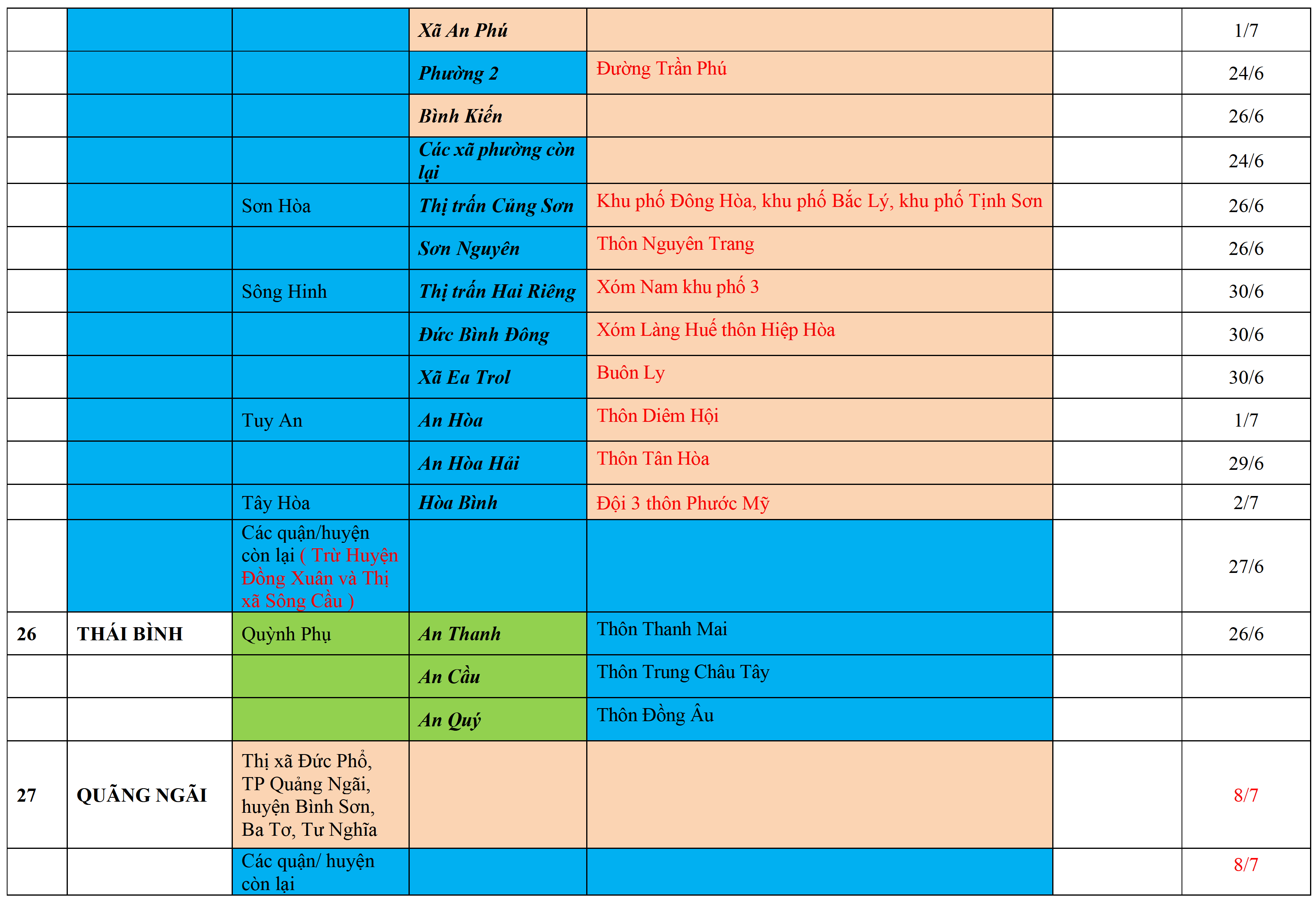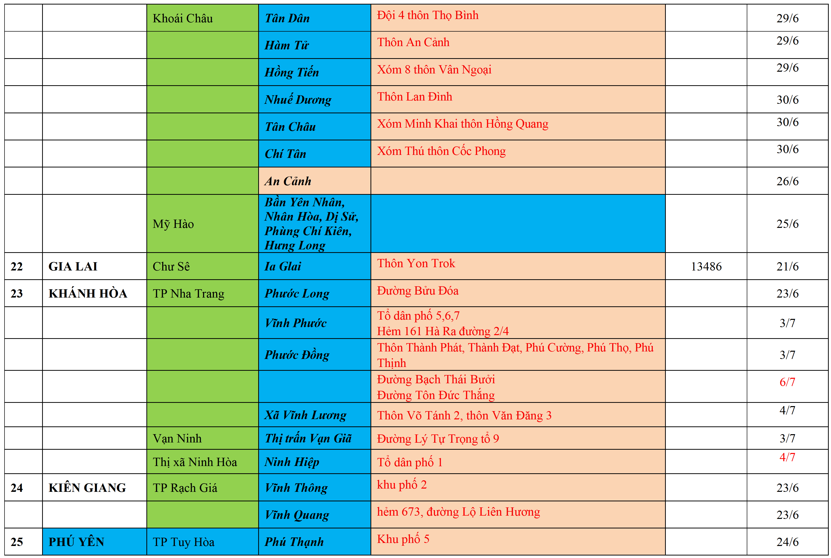 . Áp dụng biện pháp tương ứng màu sắc ô cột theo thôn xóm; xã phường; quận huyện; tỉnh thành phố. Cách ly y tế dựa vào việc tiếp xúc, đi đến địa điểm và nơi cư trú có ca bệnh, theo Thông báo của Bộ Y tế, các tỉnh thành phố.