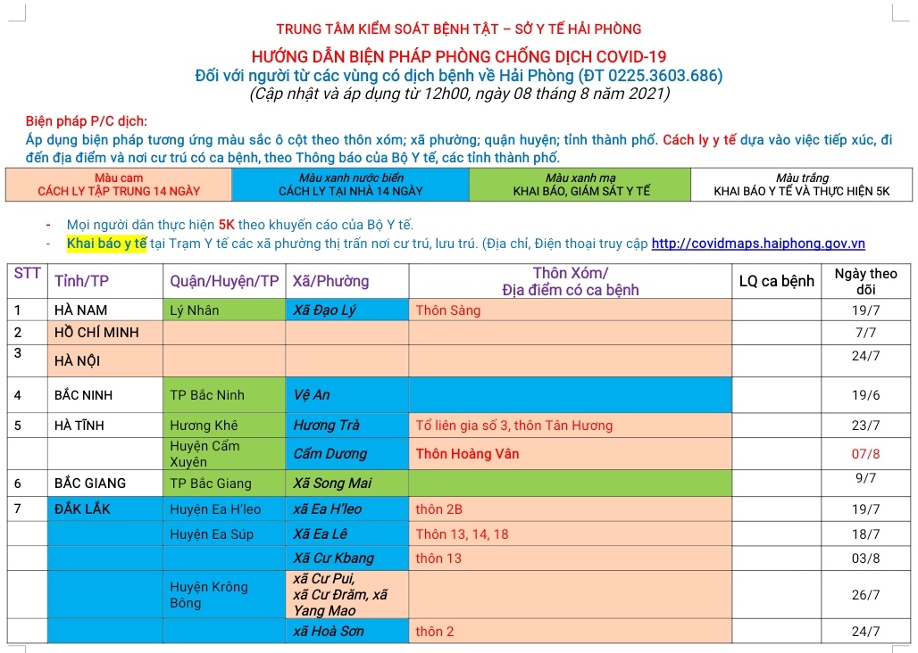 CDC Hải Phòng ban hành hướng dẫn tạm thời biện pháp phòng chống dịch COVID-19 đối với người từ các tỉnh, thành khác về thành phố như sau (thông tin cập nhật vào 12h00’ ngày 8/8/2021):
