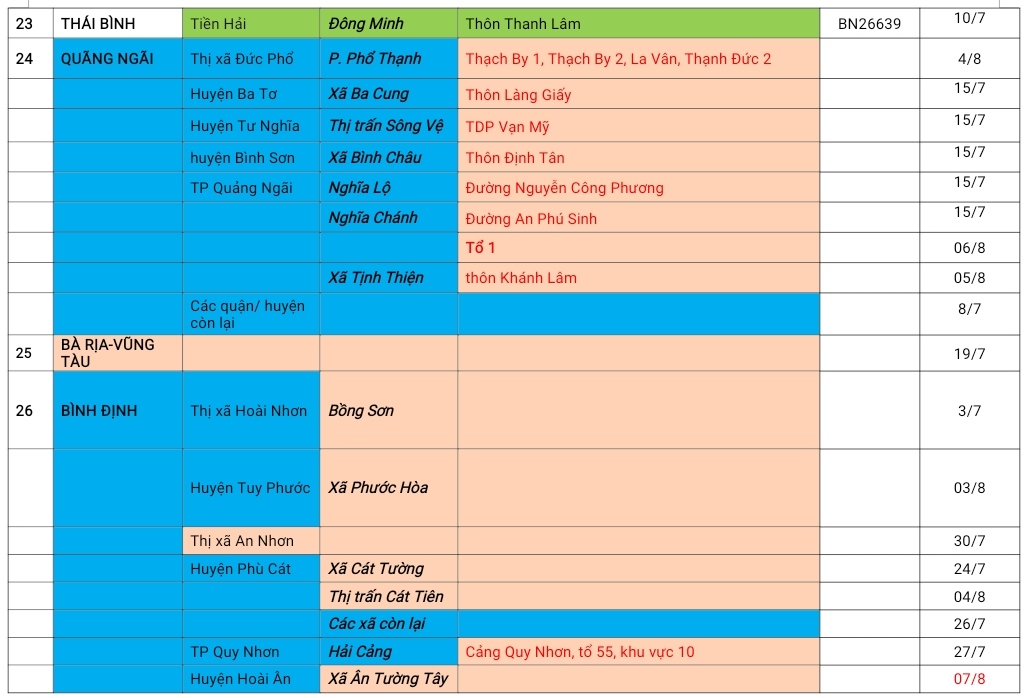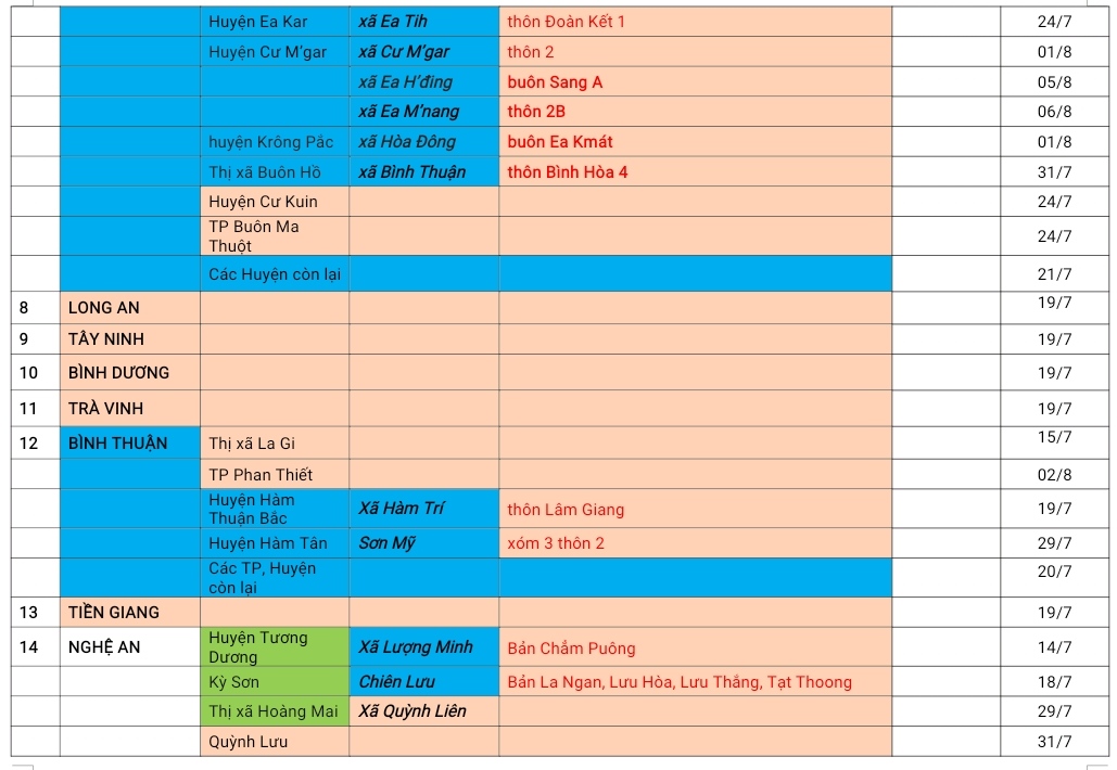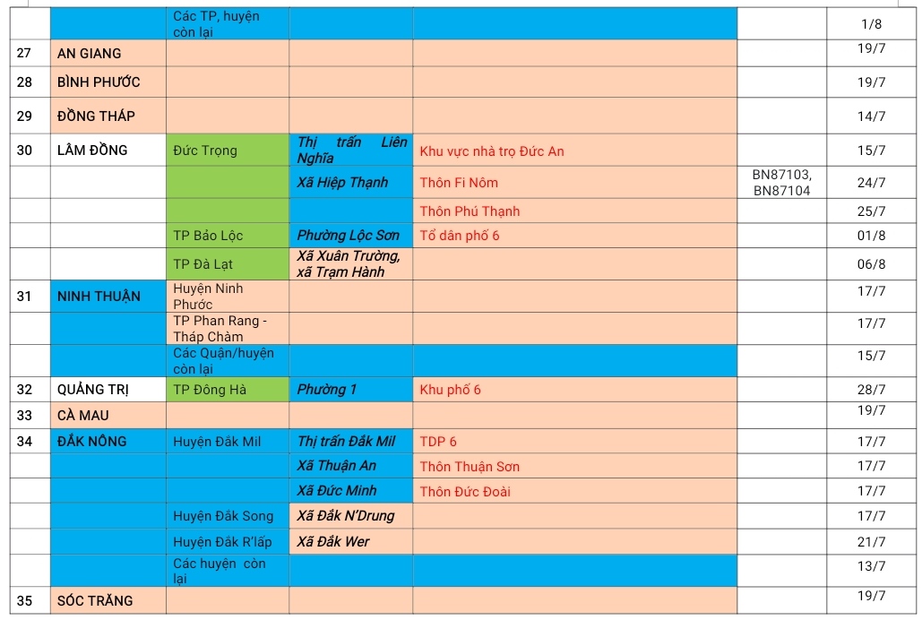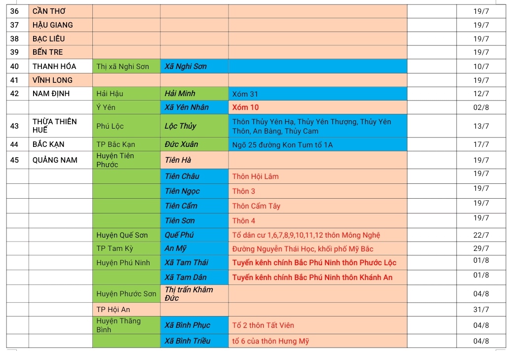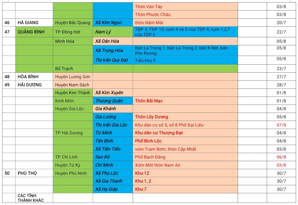 Màu cam: CÁCH LY TẬP TRUNG; Màu xanh nước biển: CÁCH LY TẠI NHÀ 14 NGÀY; Màu xanh mạ: KHAI BÁO, GIÁM SÁT Y TẾ; Màu trắng: KHAI BÁO Y TẾ VÀ THỰC HIỆN 5K.