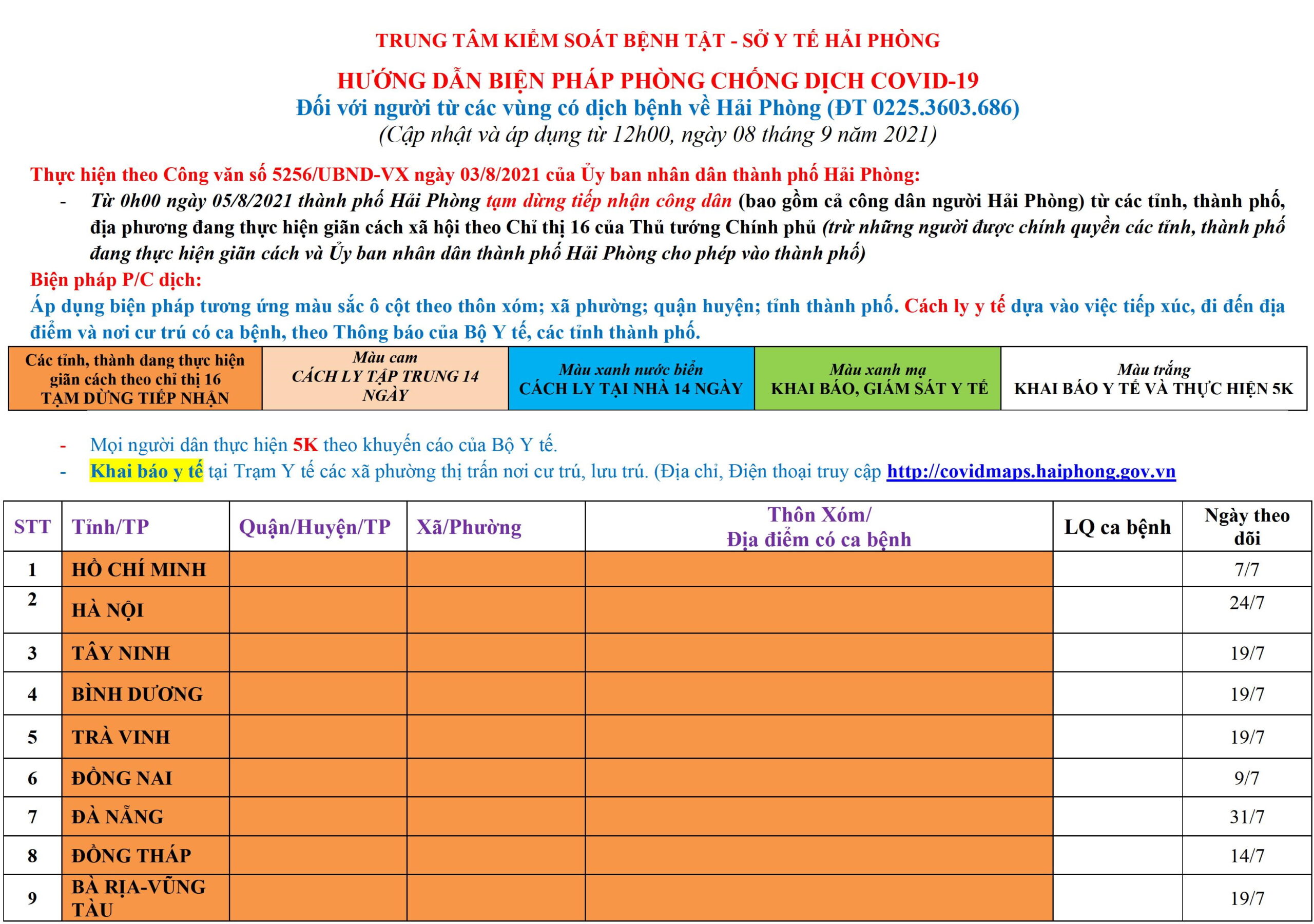 CDC Hải Phòng ban hành hướng dẫn tạm thời biện pháp phòng chống dịch COVID-19 đối với người từ các tỉnh, thành khác về thành phố như sau (thông tin cập nhật vào 12h00’ ngày 8/9/2021):