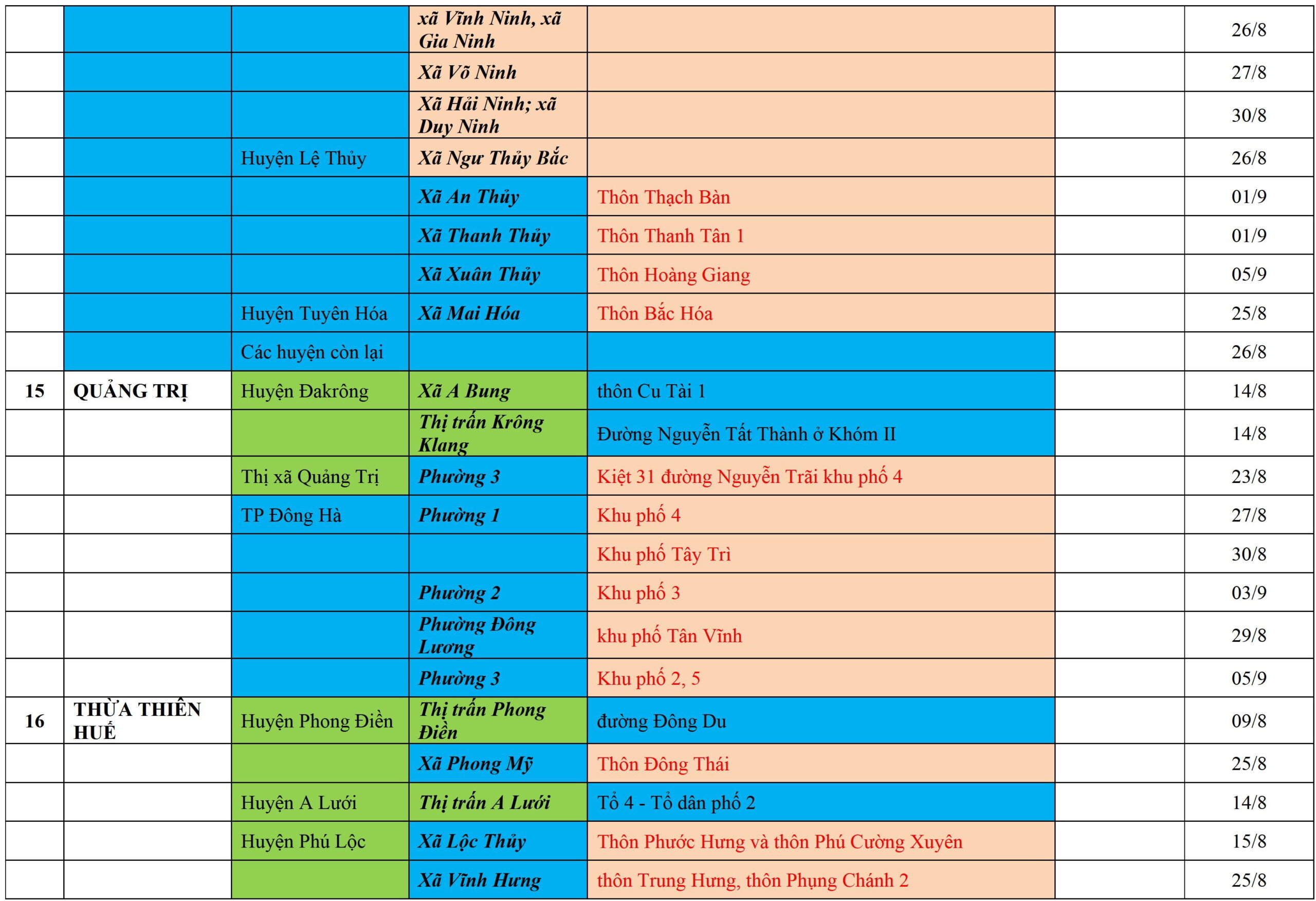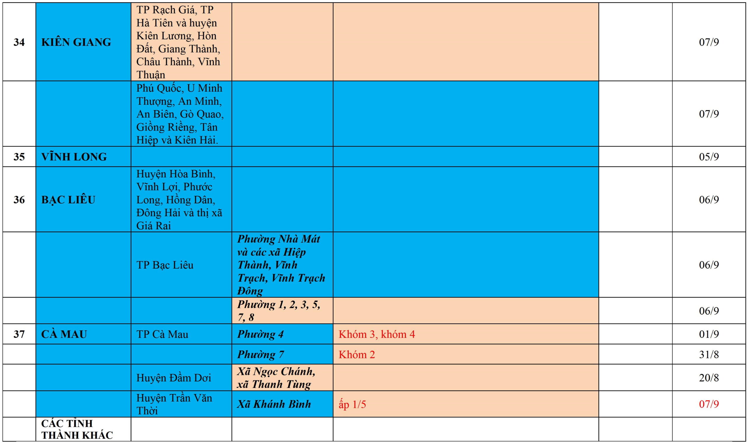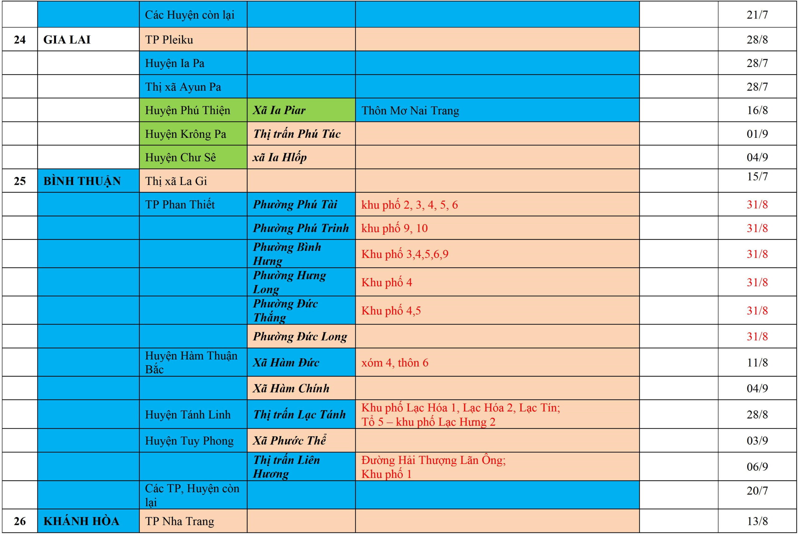 Màu nâu: TẠM DỪNG TIẾP NHẬN; Màu cam: CÁCH LY TẬP TRUNG 14 NGÀY; Màu xanh nước biển: CÁCH LY TẠI NHÀ 14 NGÀY; Màu xanh mạ: KHAI BÁO, GIÁM SÁT Y TẾ; Màu trắng: KHAI BÁO Y TẾ VÀ THỰC HIỆN 5K.