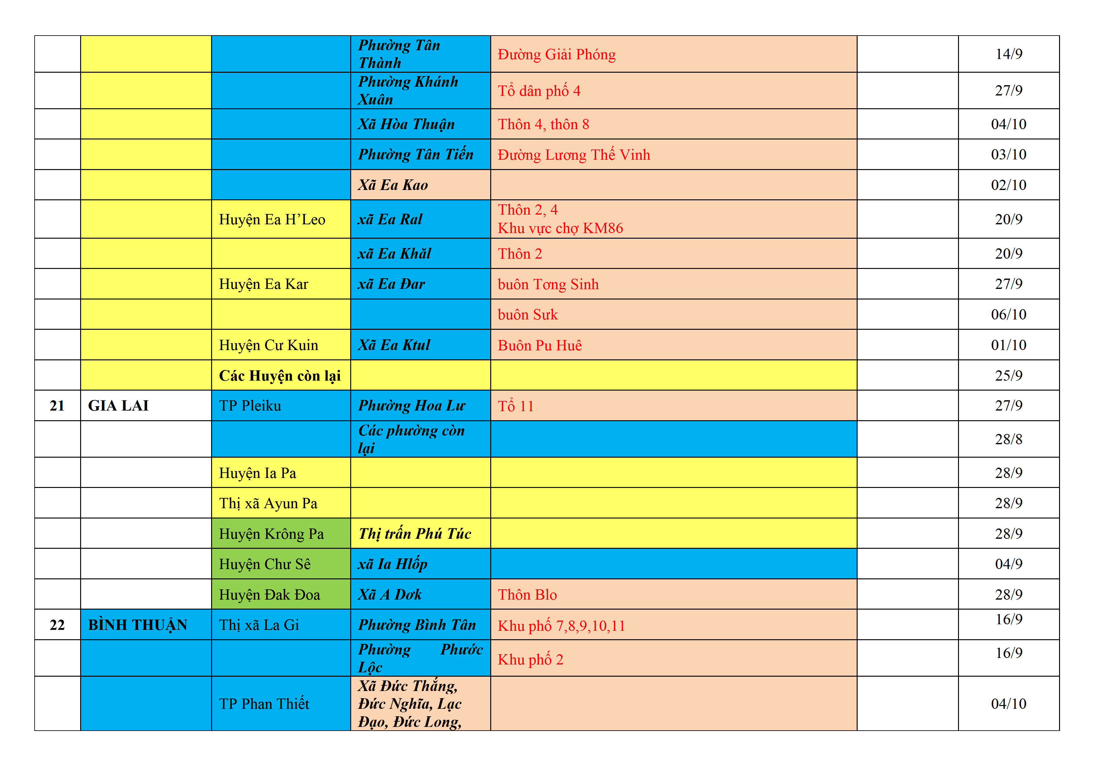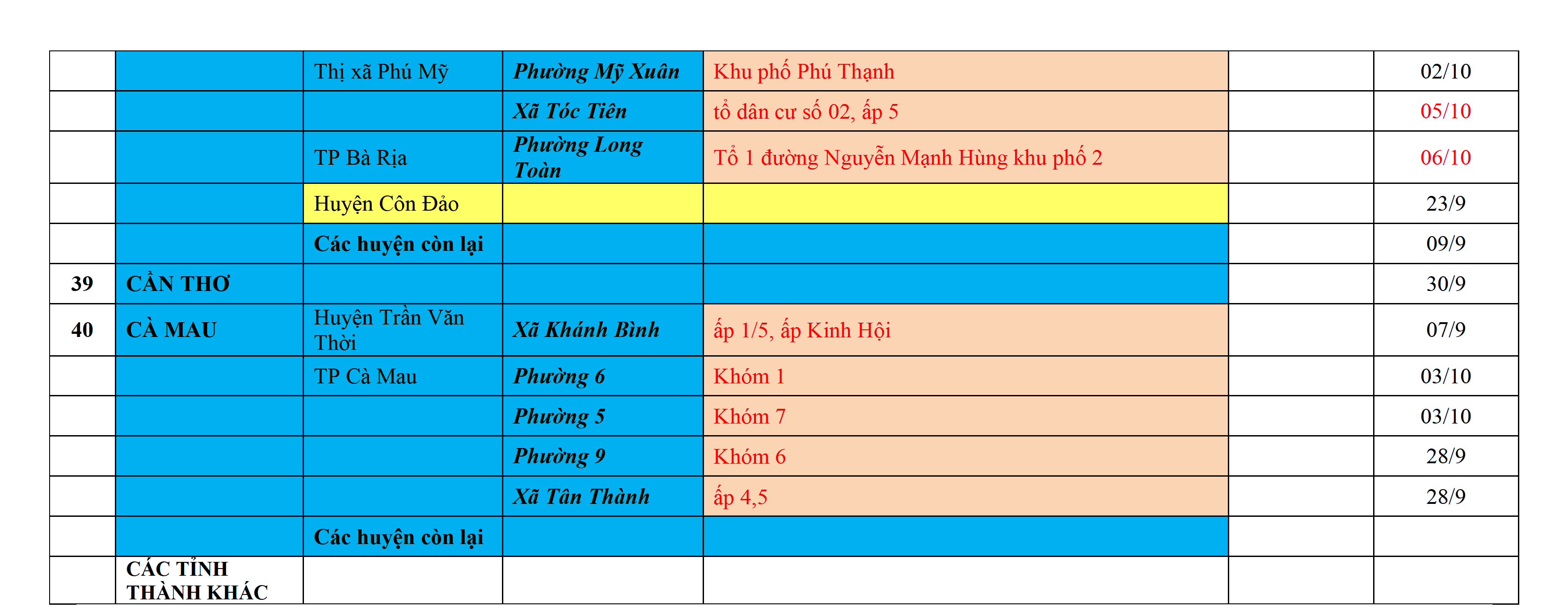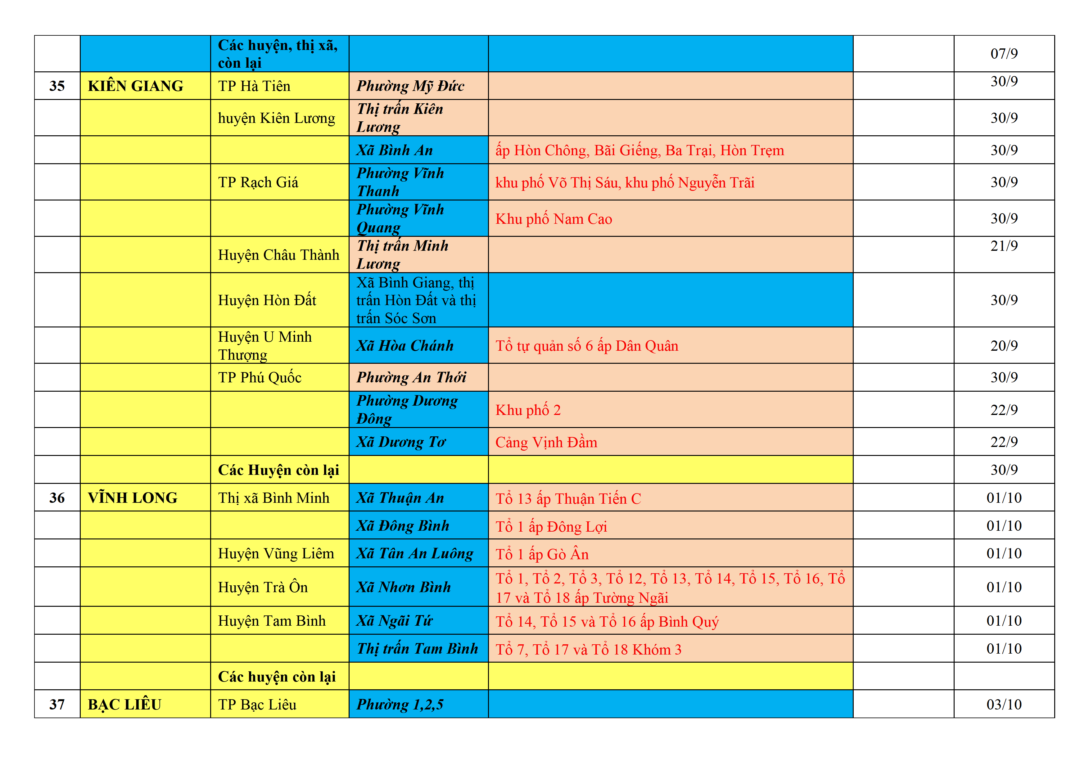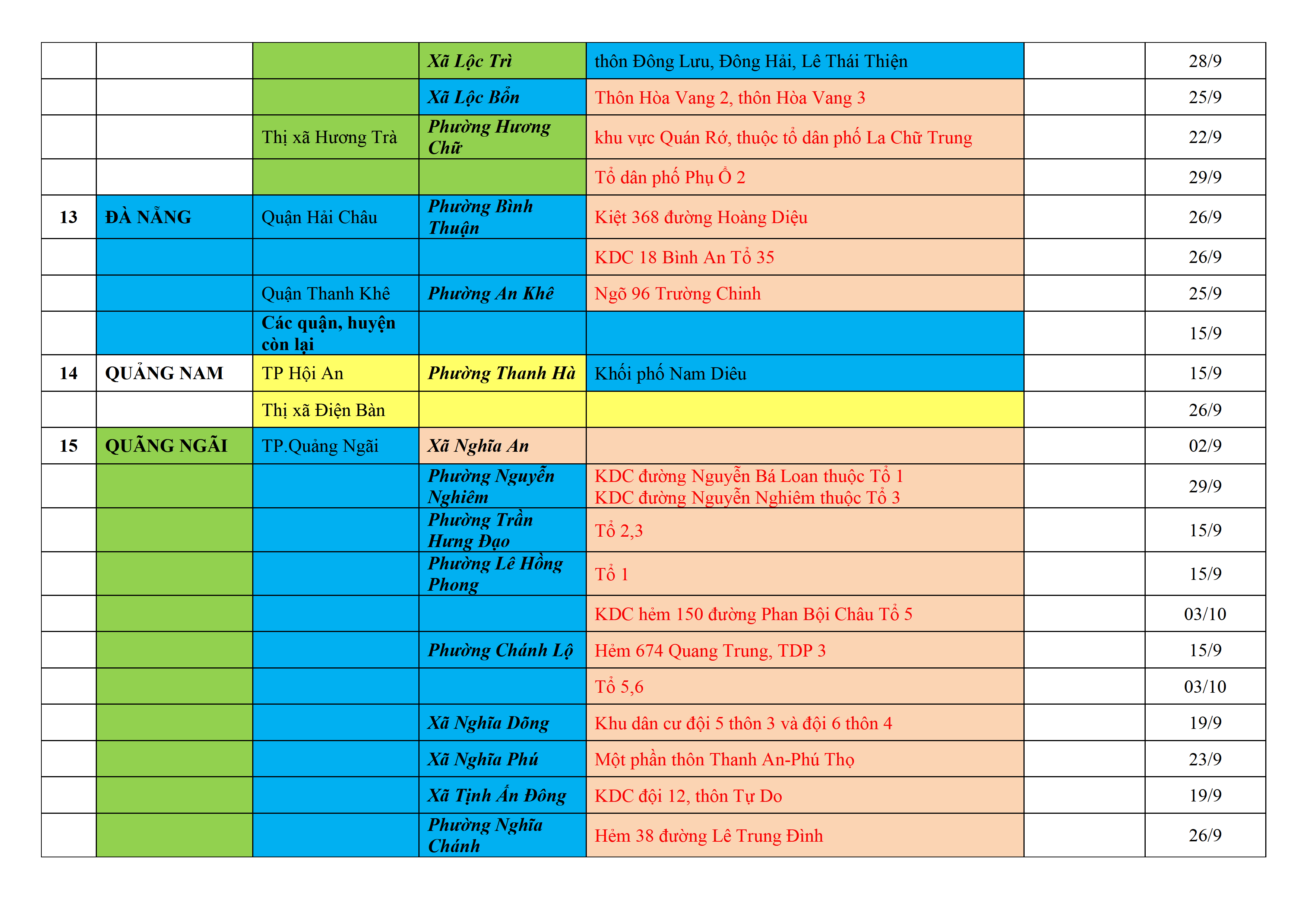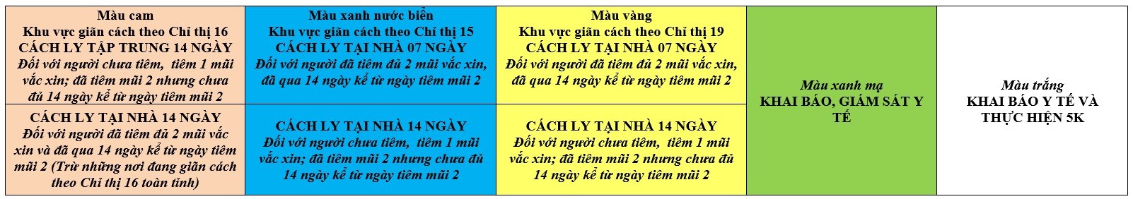 Biện pháp phòng, chống dịch COVID-19: Áp dụng biện pháp tương ứng màu sắc ô cột theo thôn xóm; xã phường; quận huyện; tỉnh thành phố. Cách ly y tế dựa vào việc tiếp xúc, đi đến địa điểm và nơi cư trú có ca bệnh, theo Thông báo của Bộ Y tế, các tỉnh thành phố.