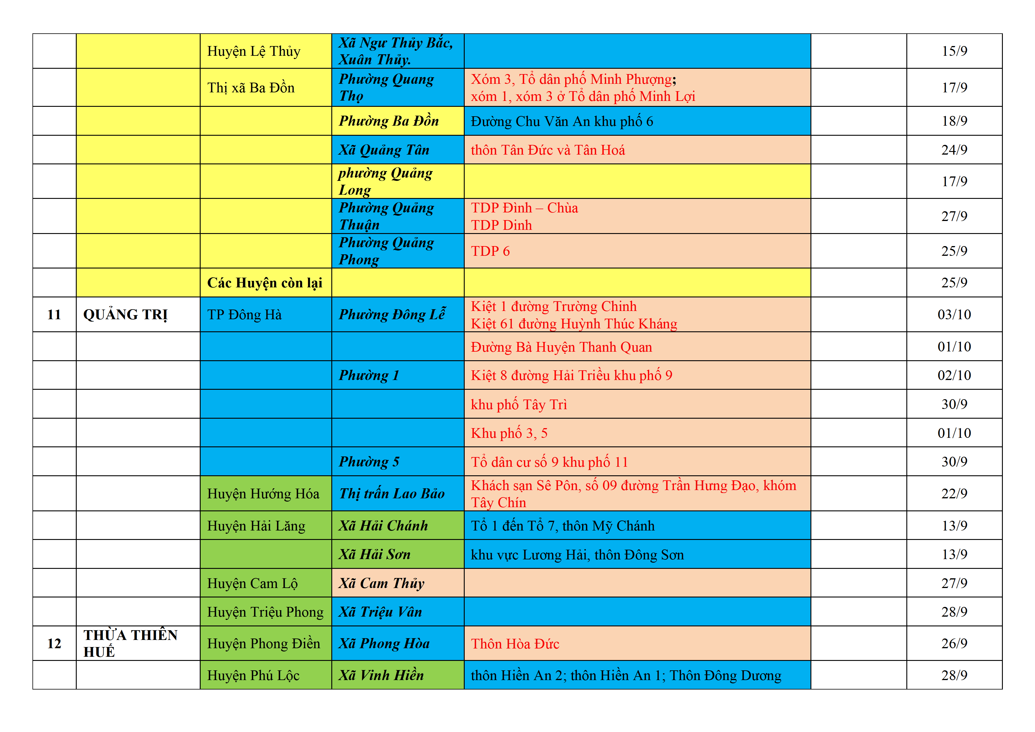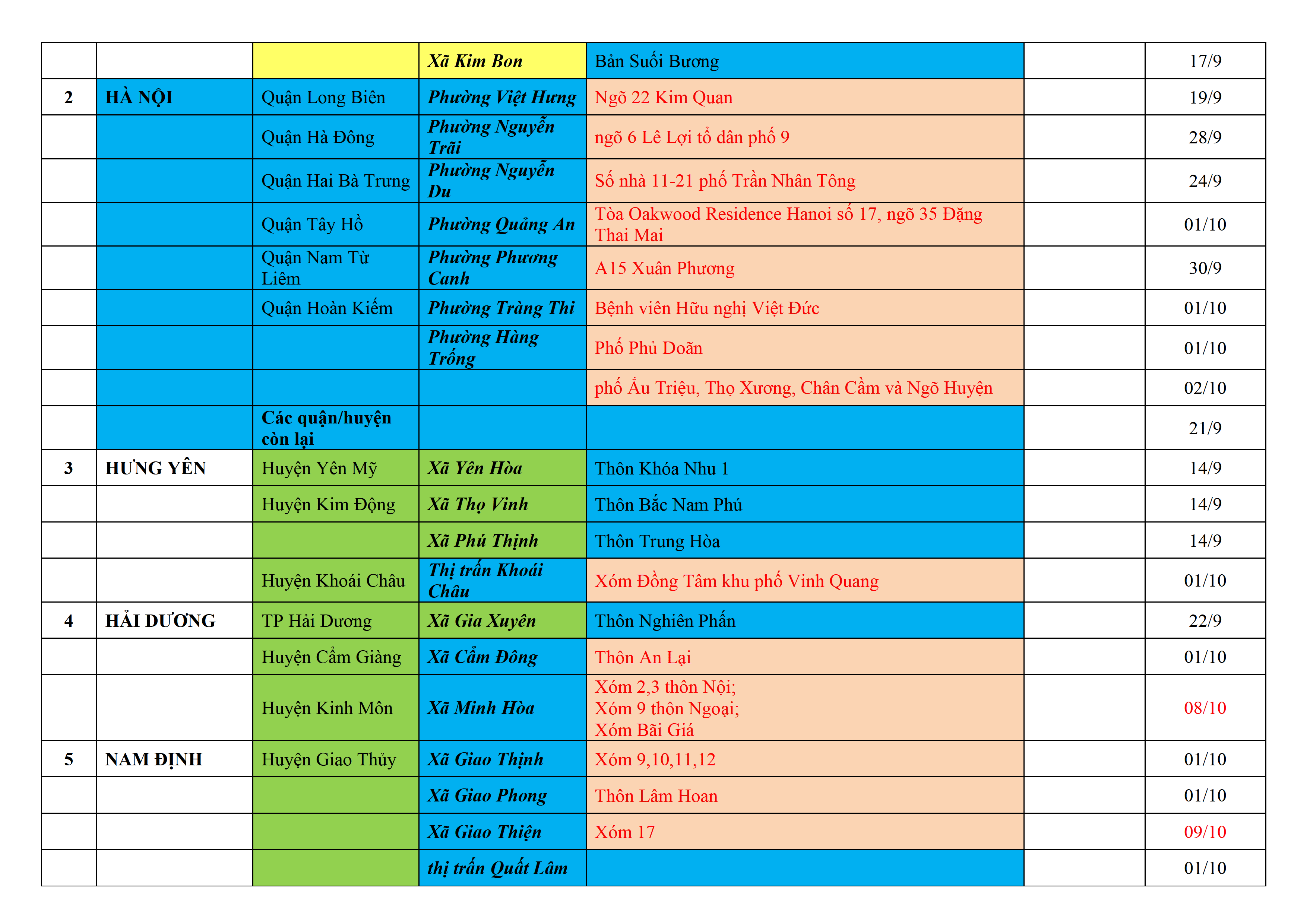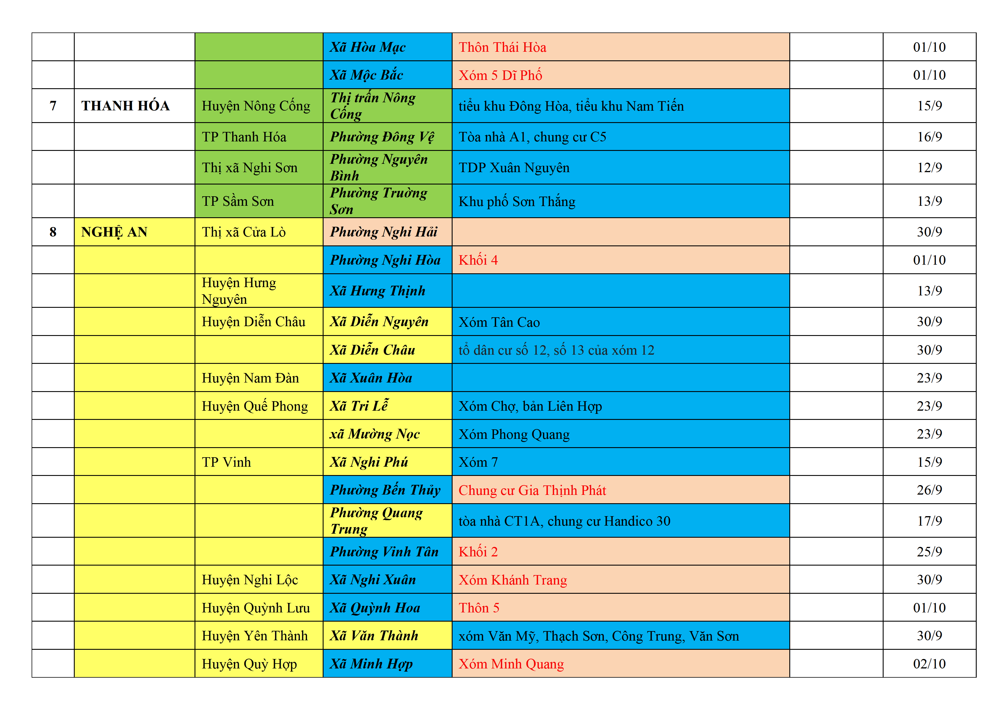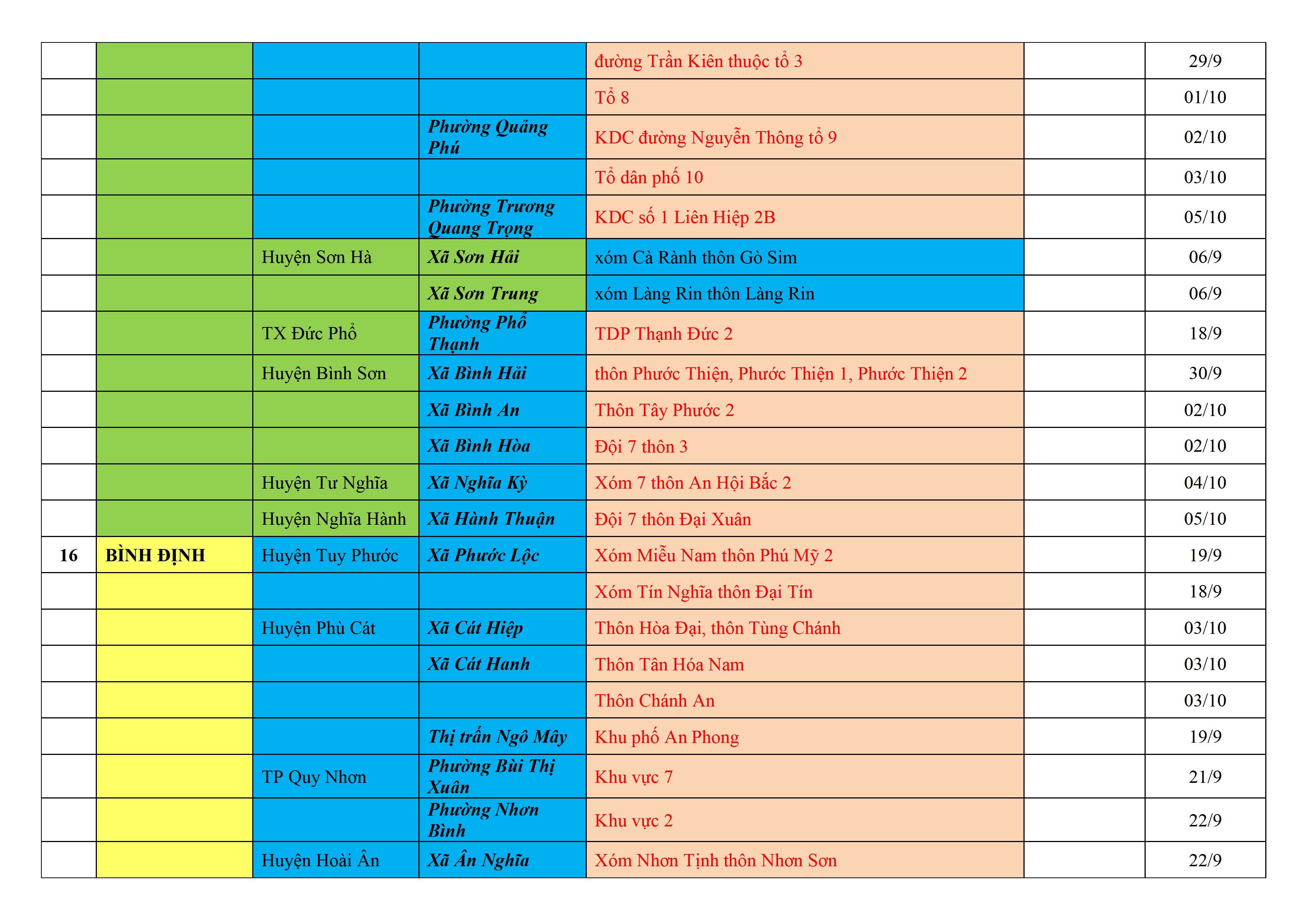Biện pháp phòng, chống dịch COVID-19: Áp dụng biện pháp tương ứng màu sắc ô cột theo thôn xóm; xã phường; quận huyện; tỉnh thành phố. Cách ly y tế dựa vào việc tiếp xúc, đi đến địa điểm và nơi cư trú có ca bệnh, theo Thông báo của Bộ Y tế, các tỉnh thành phố.