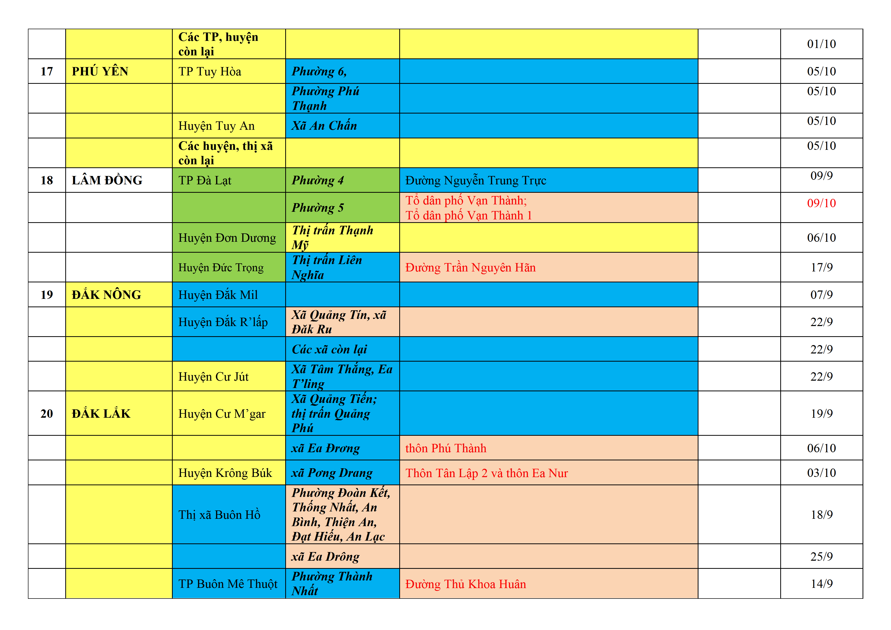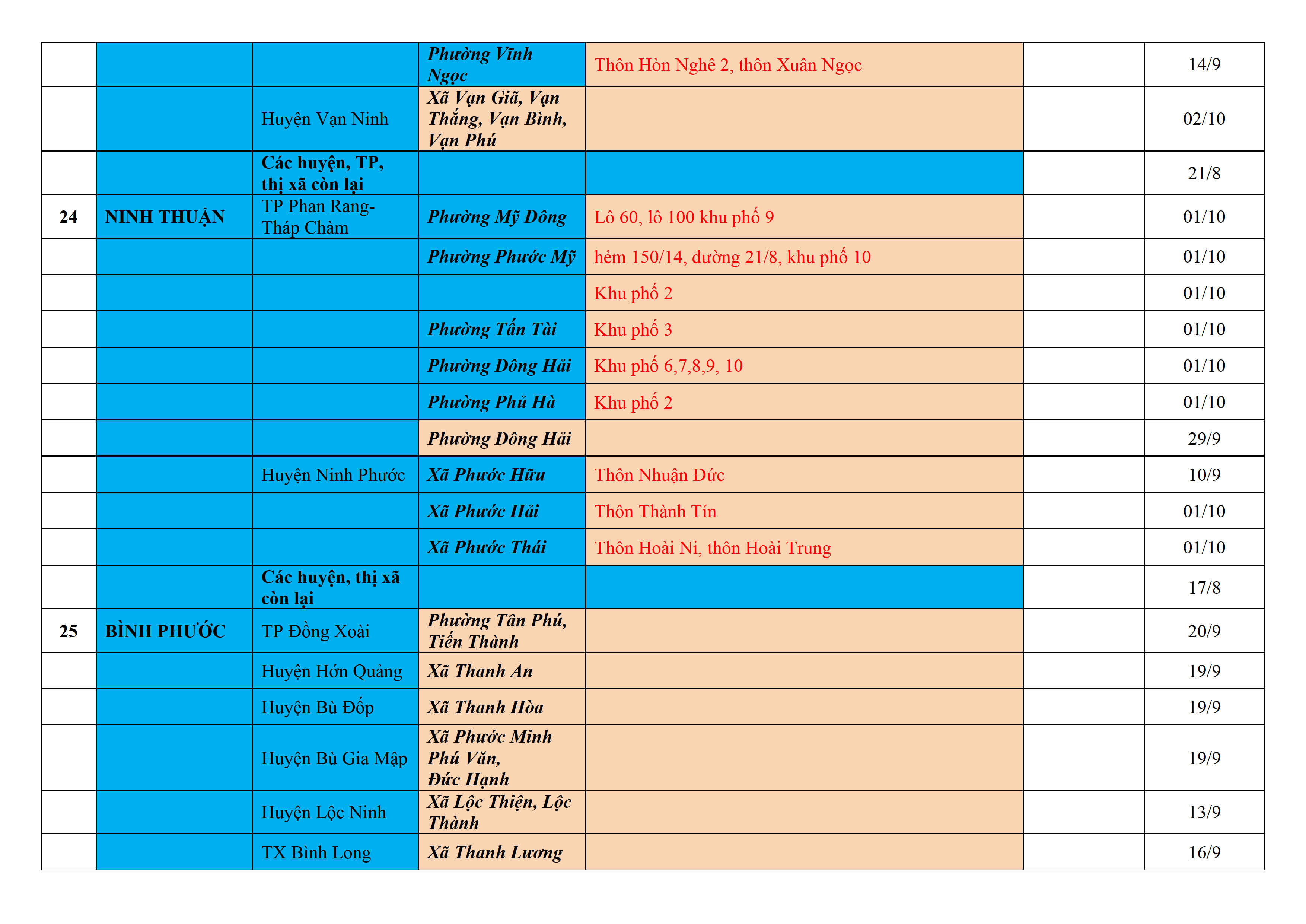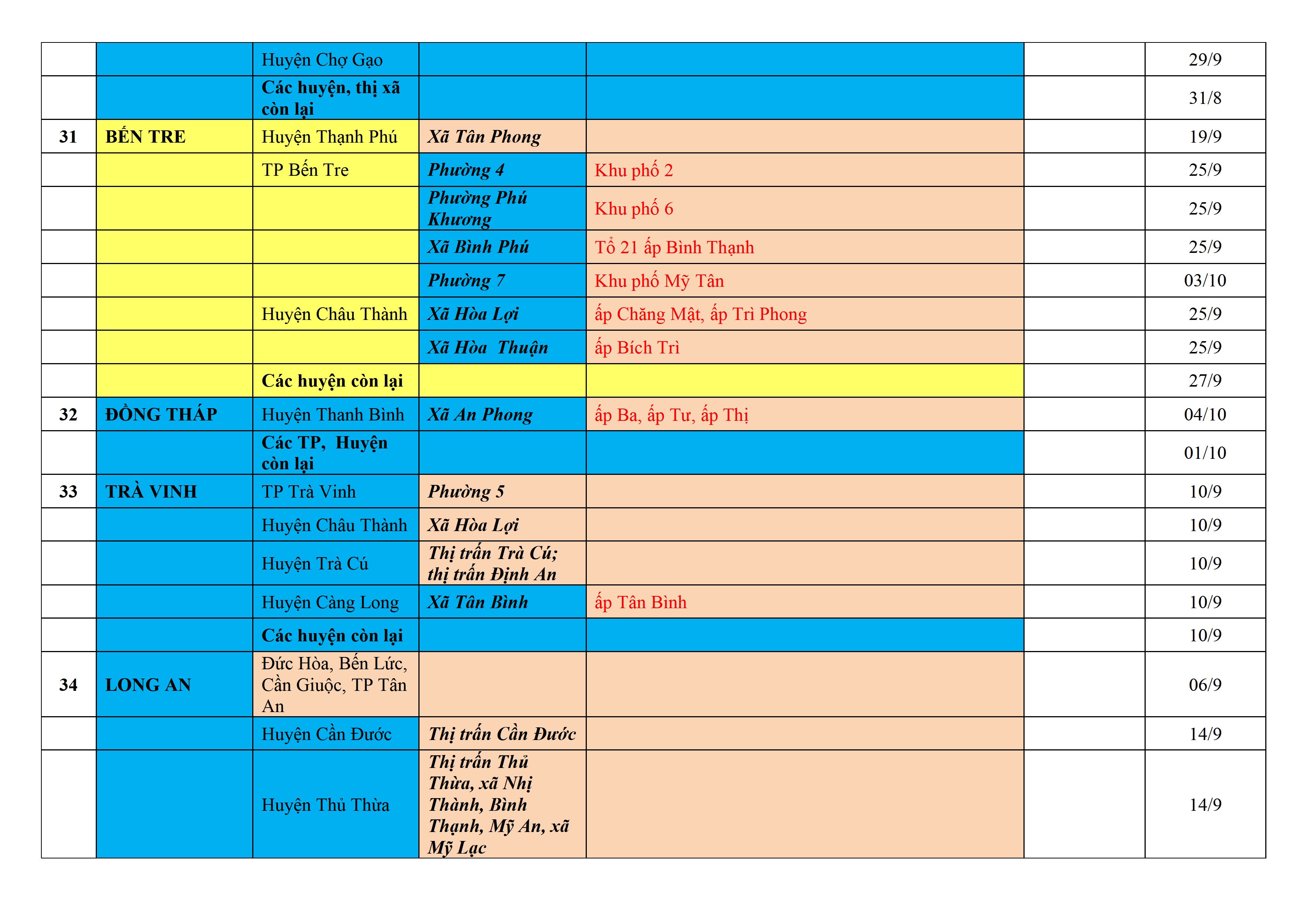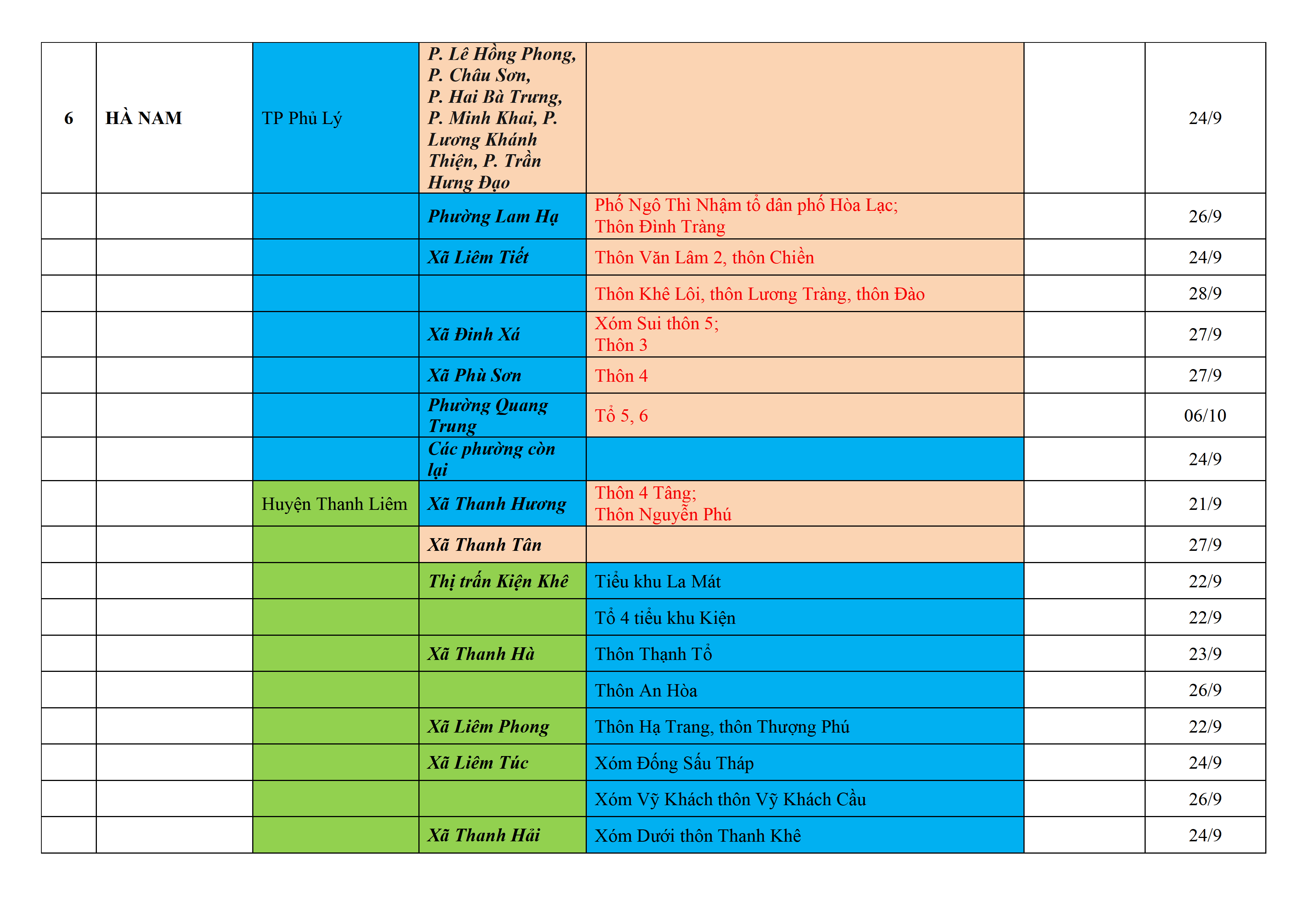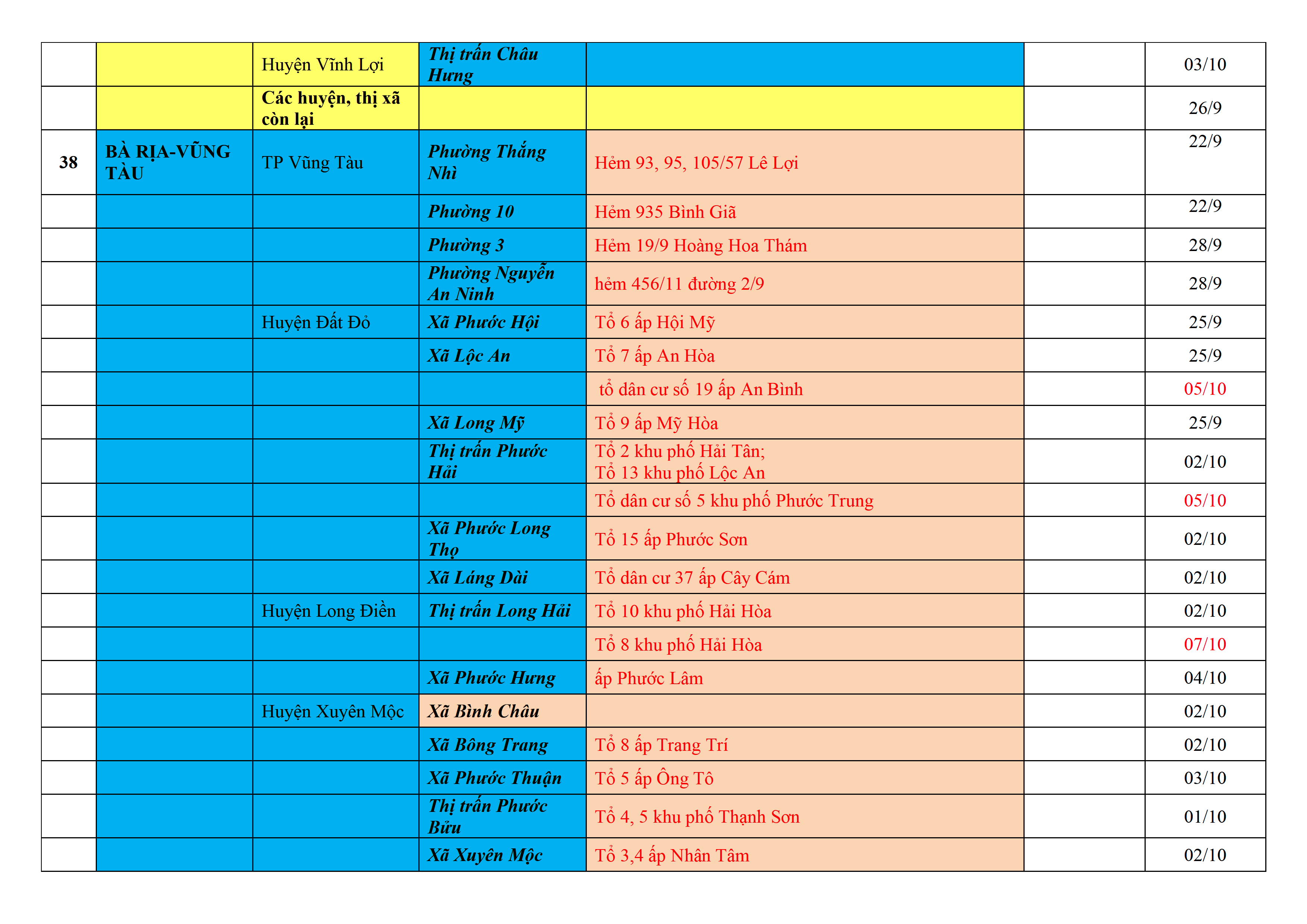 Biện pháp phòng, chống dịch COVID-19: Áp dụng biện pháp tương ứng màu sắc ô cột theo thôn xóm; xã phường; quận huyện; tỉnh thành phố. Cách ly y tế dựa vào việc tiếp xúc, đi đến địa điểm và nơi cư trú có ca bệnh, theo Thông báo của Bộ Y tế, các tỉnh thành phố.
