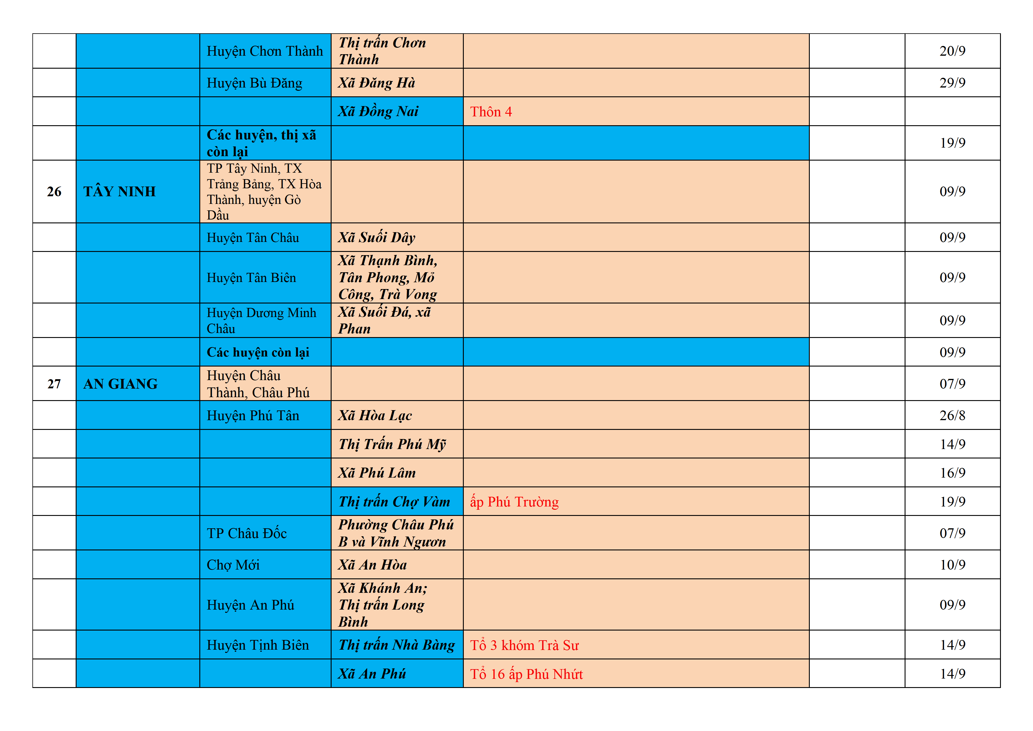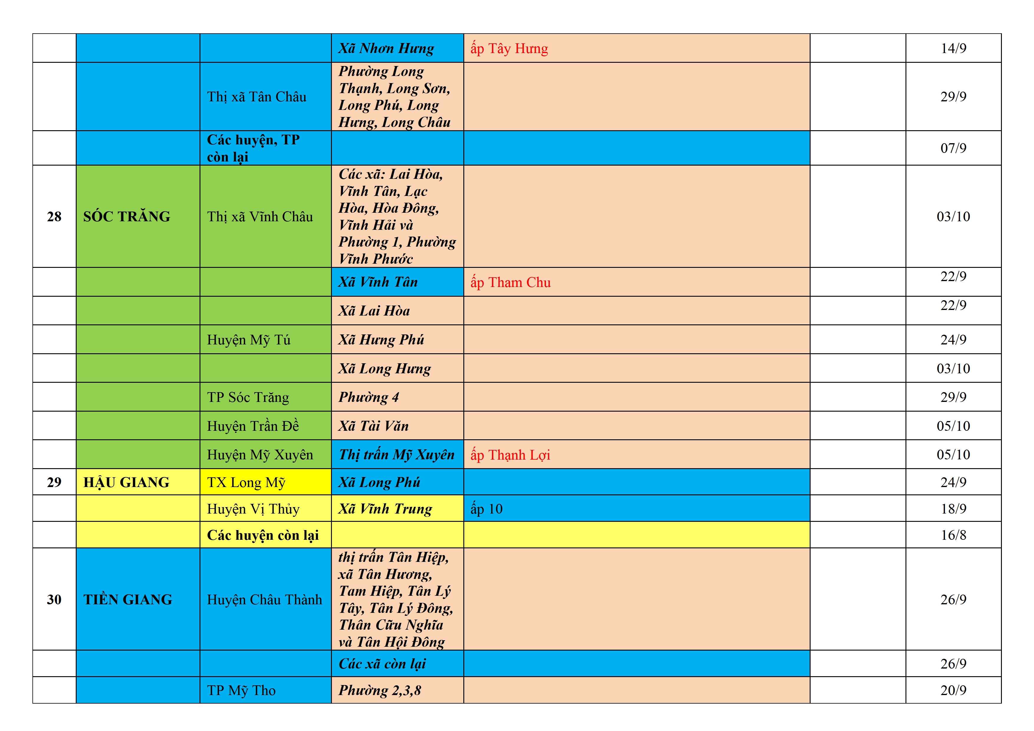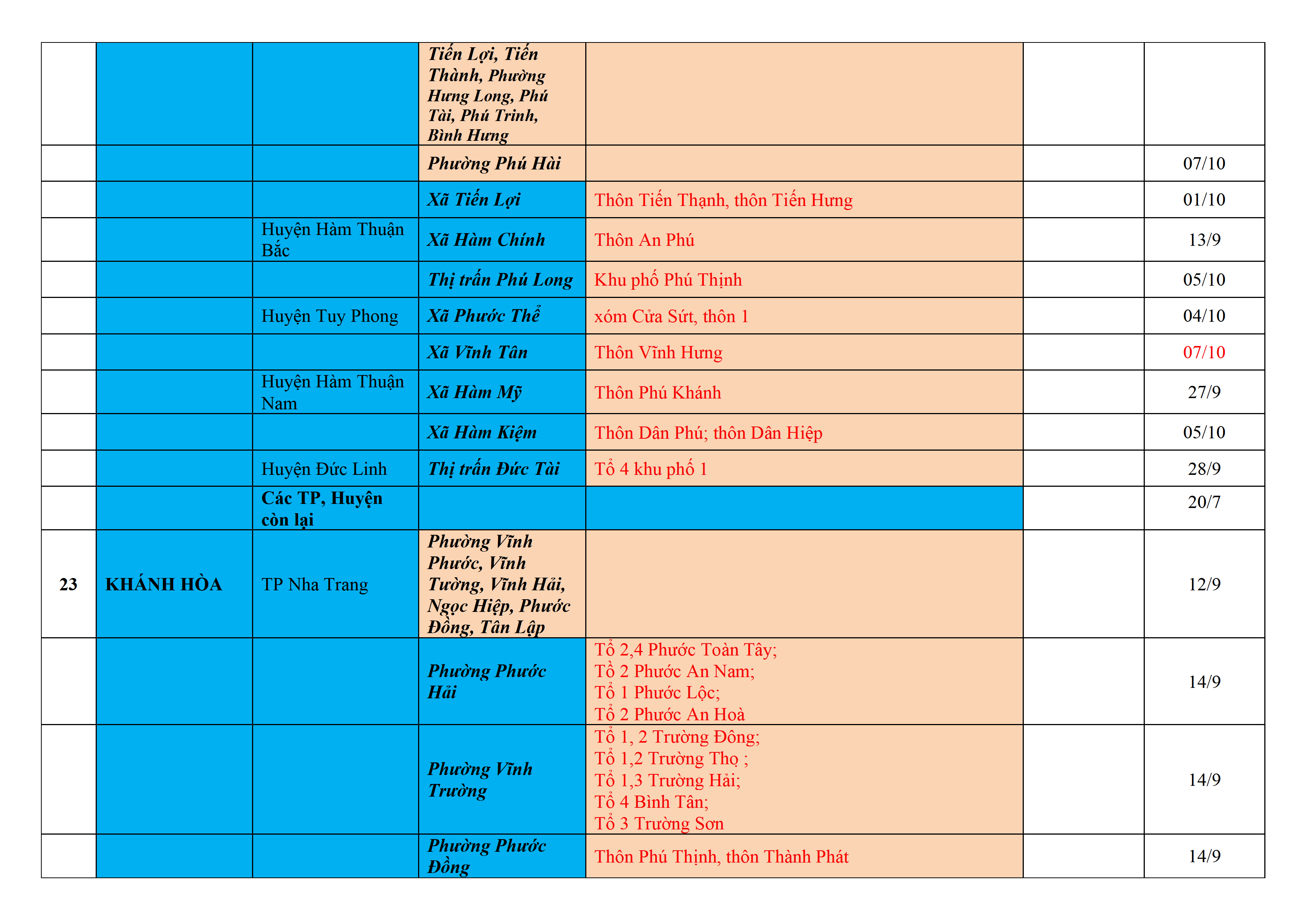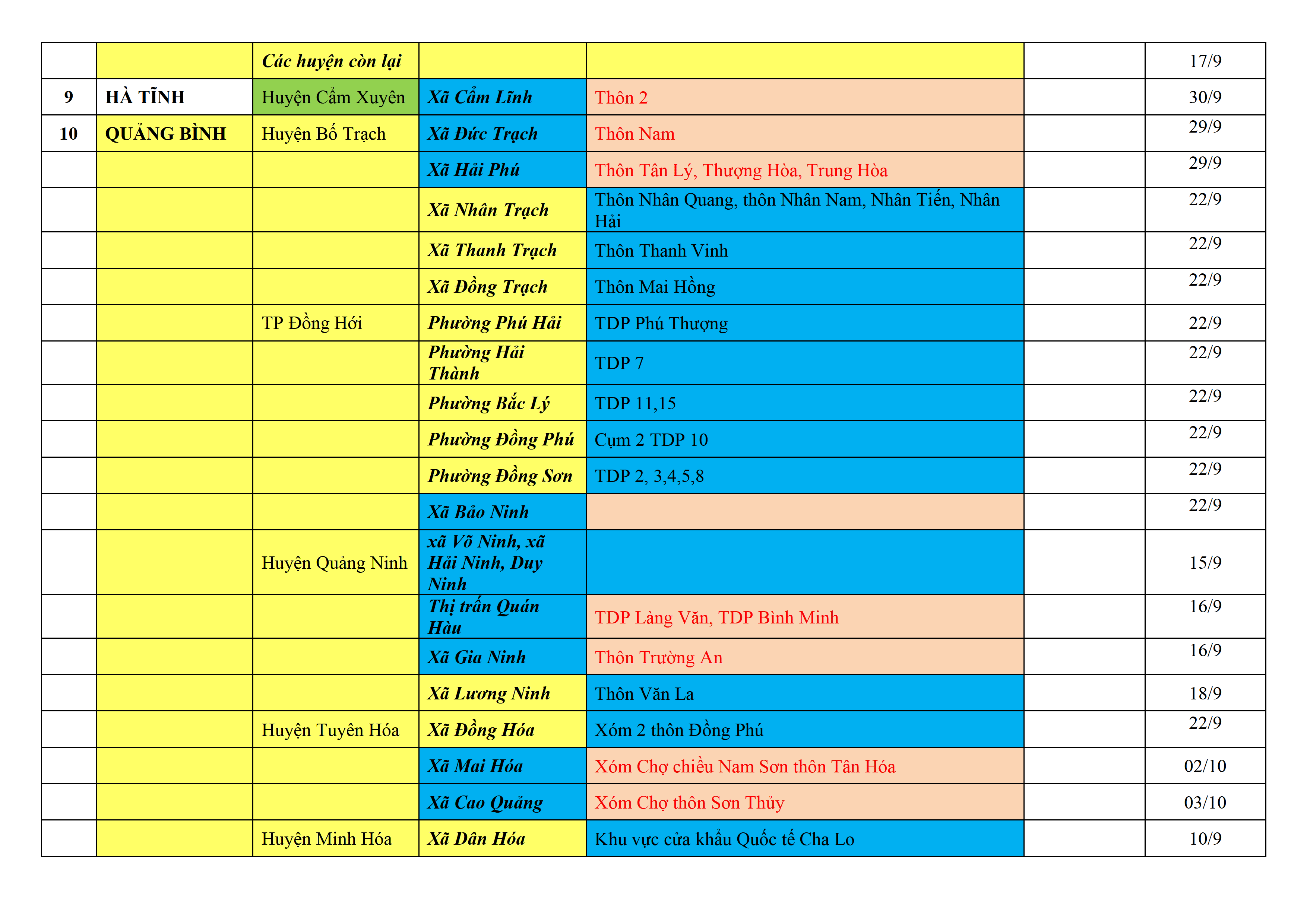 Biện pháp phòng, chống dịch COVID-19: Áp dụng biện pháp tương ứng màu sắc ô cột theo thôn xóm; xã phường; quận huyện; tỉnh thành phố. Cách ly y tế dựa vào việc tiếp xúc, đi đến địa điểm và nơi cư trú có ca bệnh, theo Thông báo của Bộ Y tế, các tỉnh thành phố.