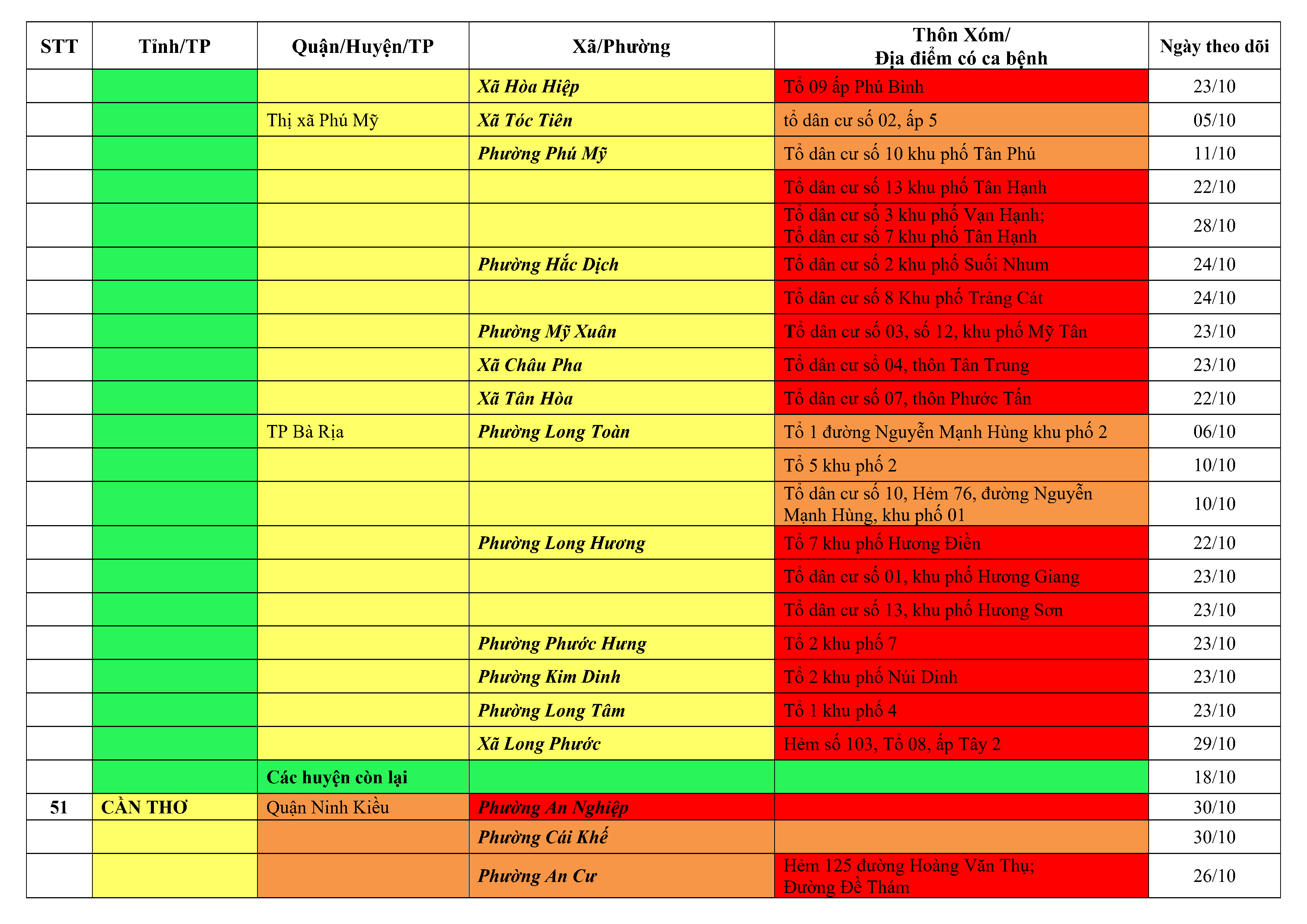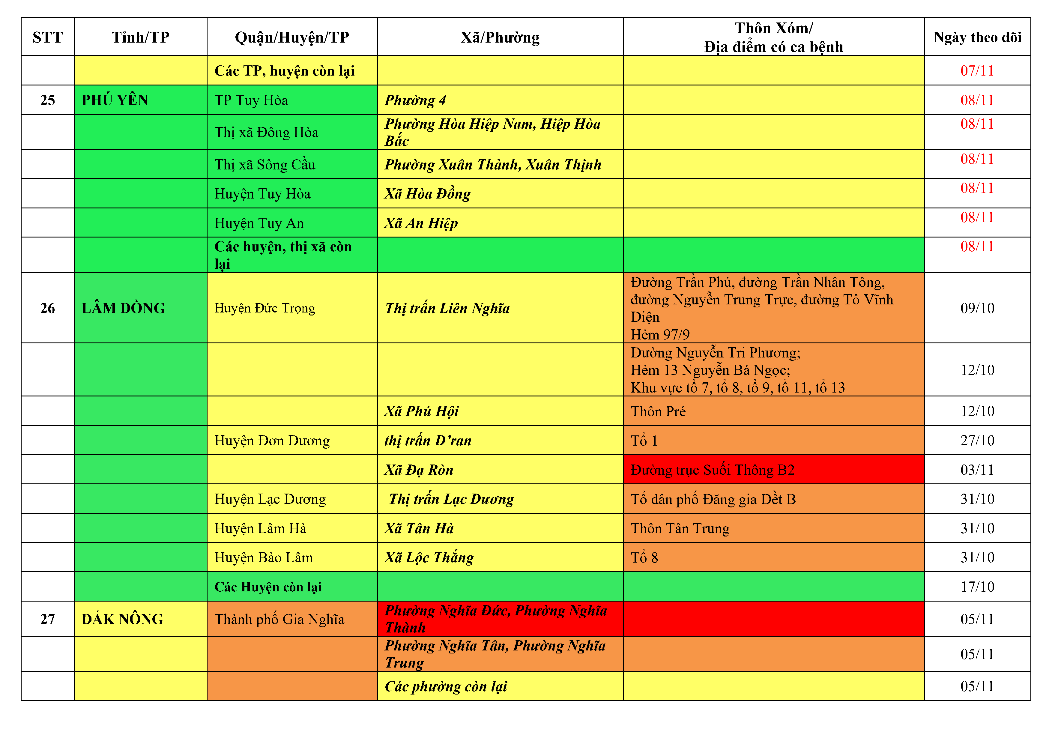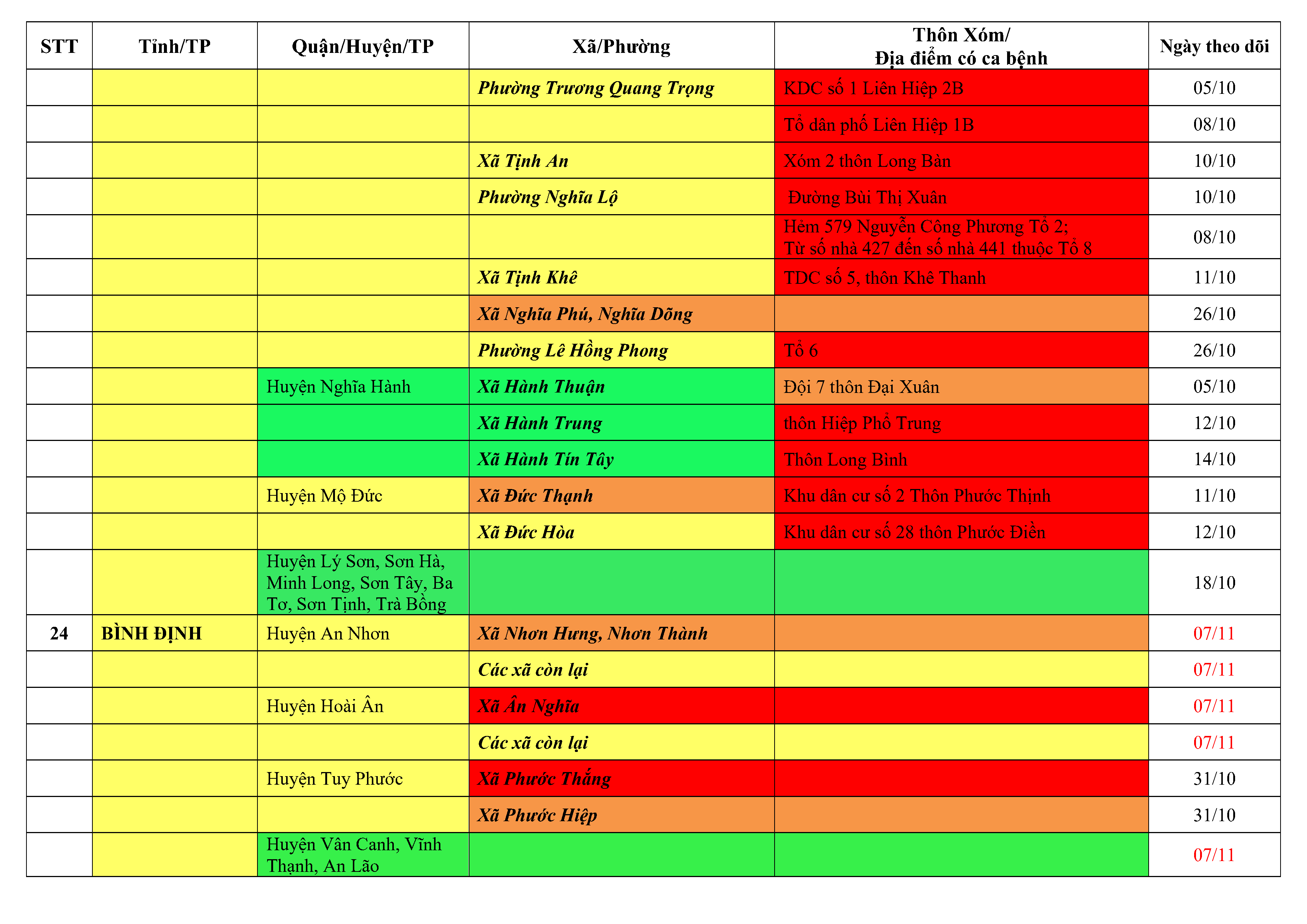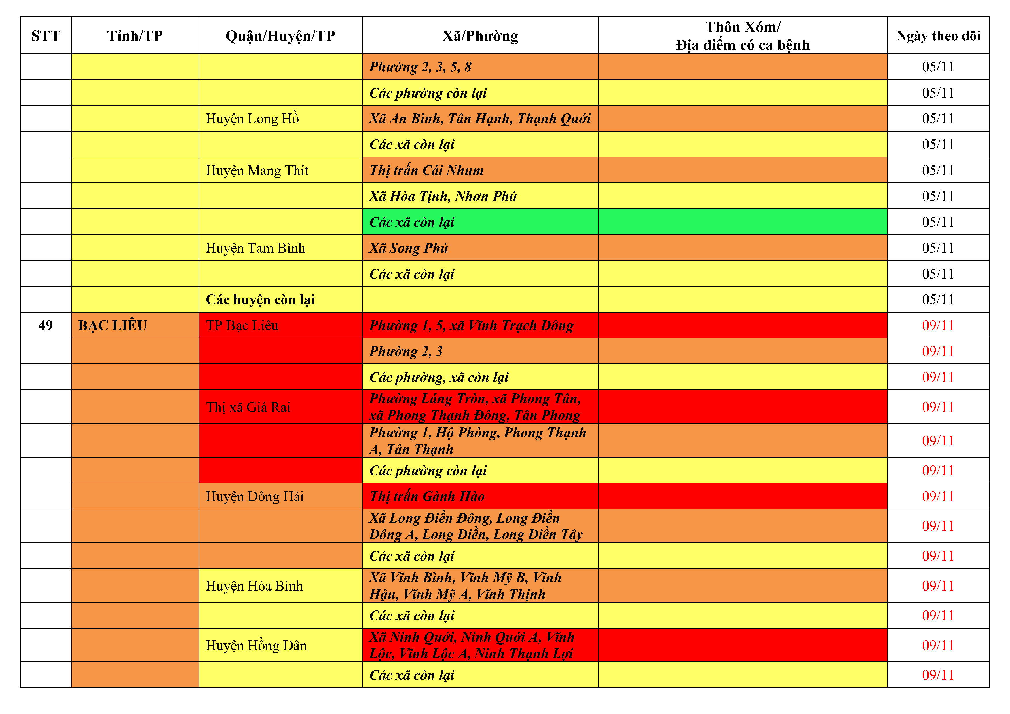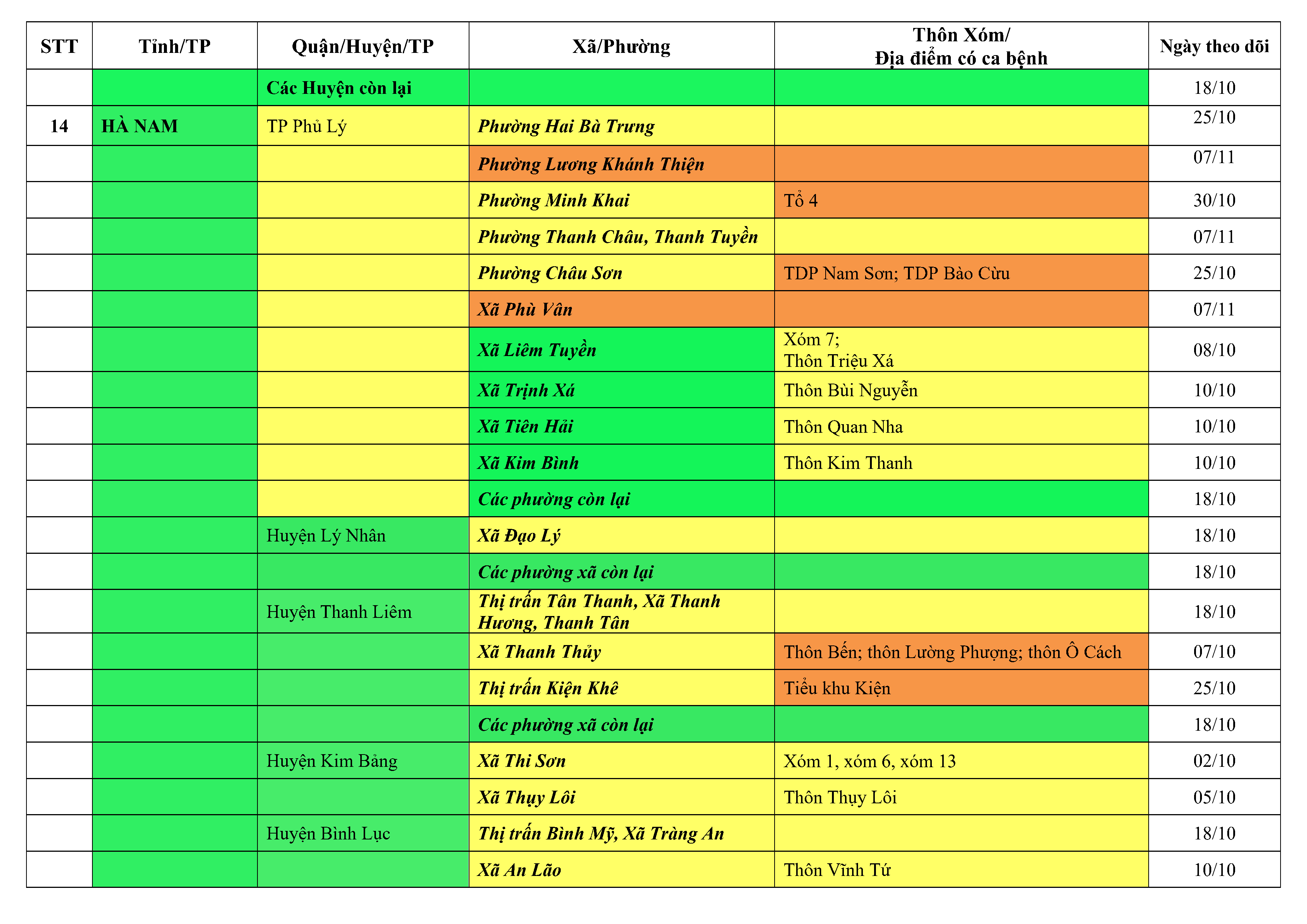 Lưu ý: Các tỉnh, thành phố không có tên trong bảng màu, đi lại bình thường, tuân thủ các biện pháp phòng chống dịch theo chỉ đạo của Bộ Y tế; khai báo y tế, thực hiện nghiêm 5K.
