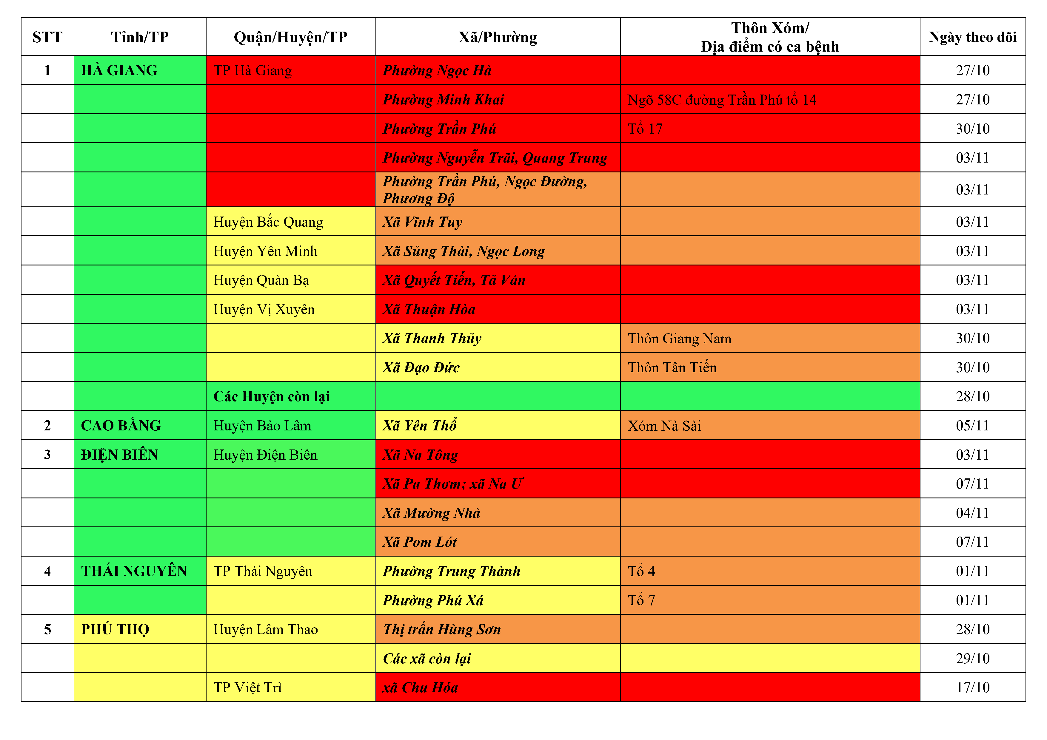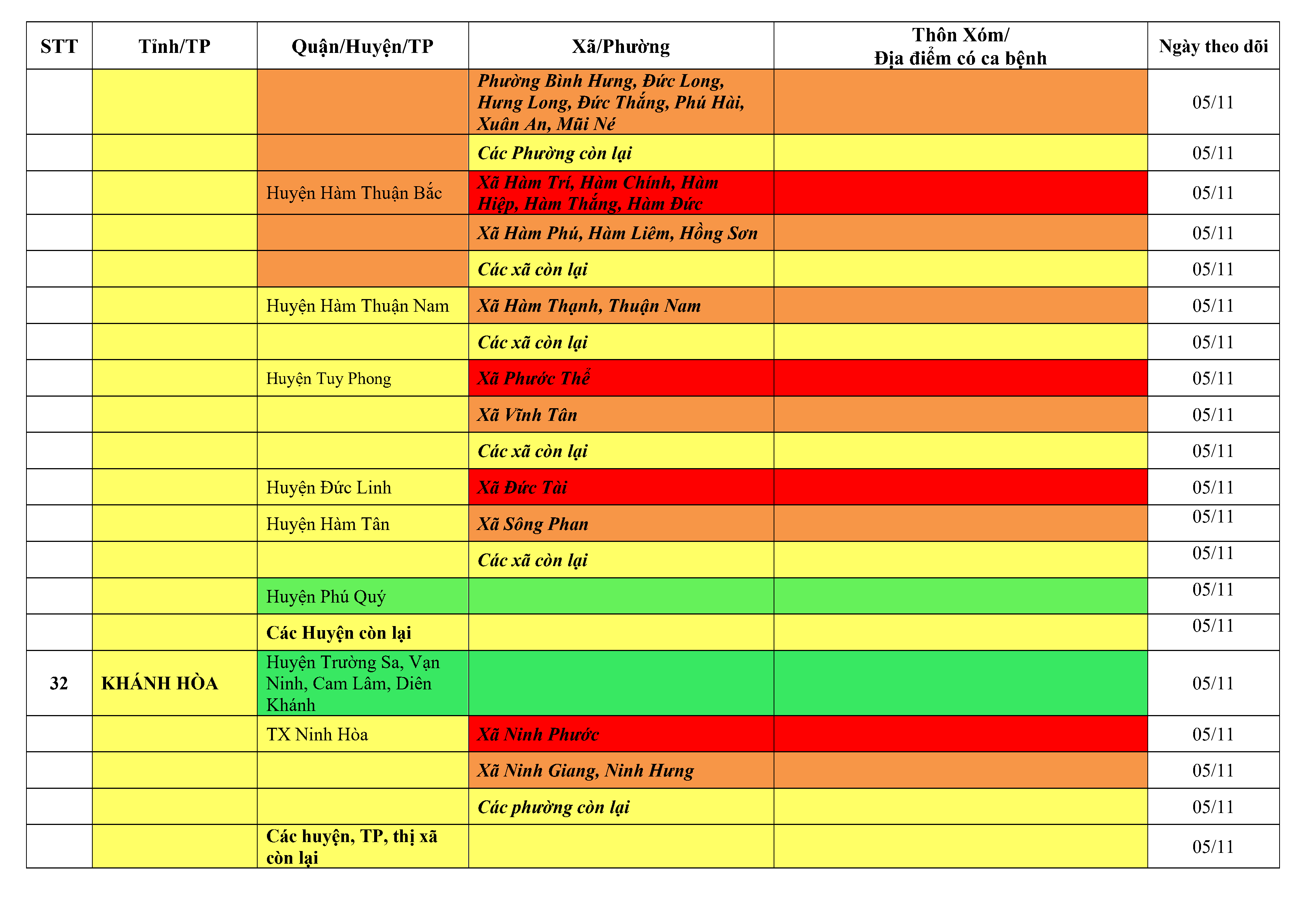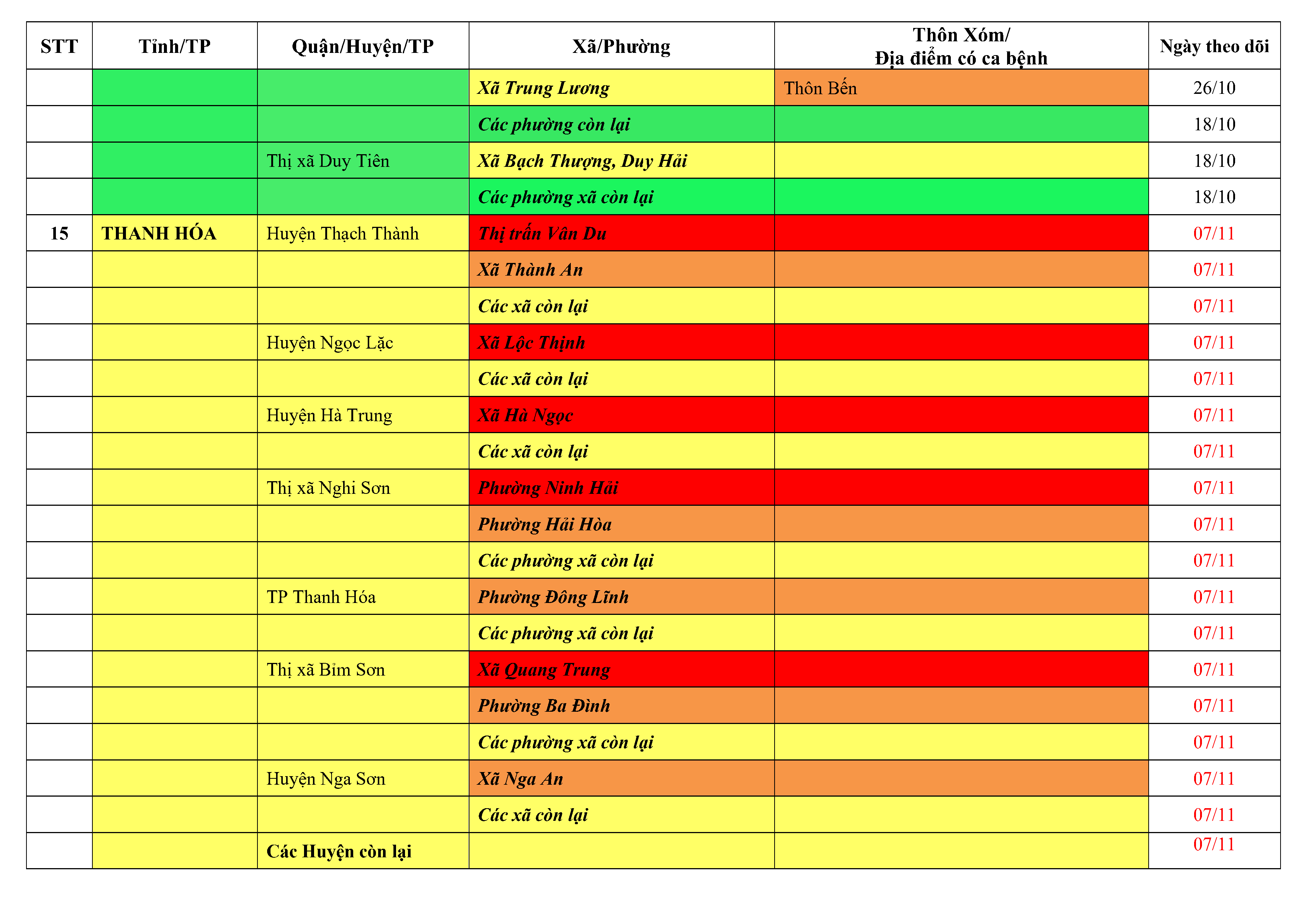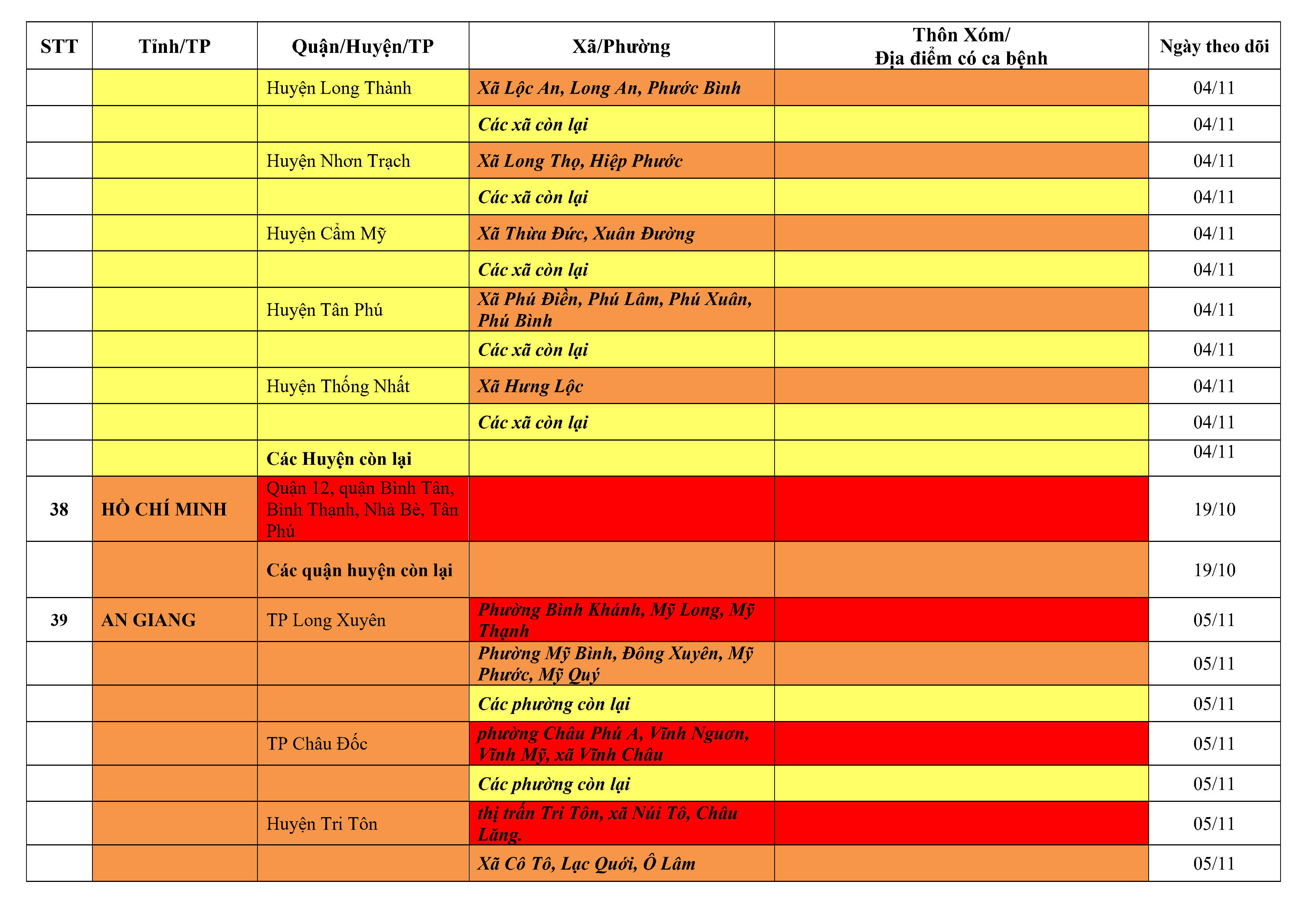 Lưu ý: Các tỉnh, thành phố không có tên trong bảng màu, đi lại bình thường, tuân thủ các biện pháp phòng chống dịch theo chỉ đạo của Bộ Y tế; khai báo y tế, thực hiện nghiêm 5K.