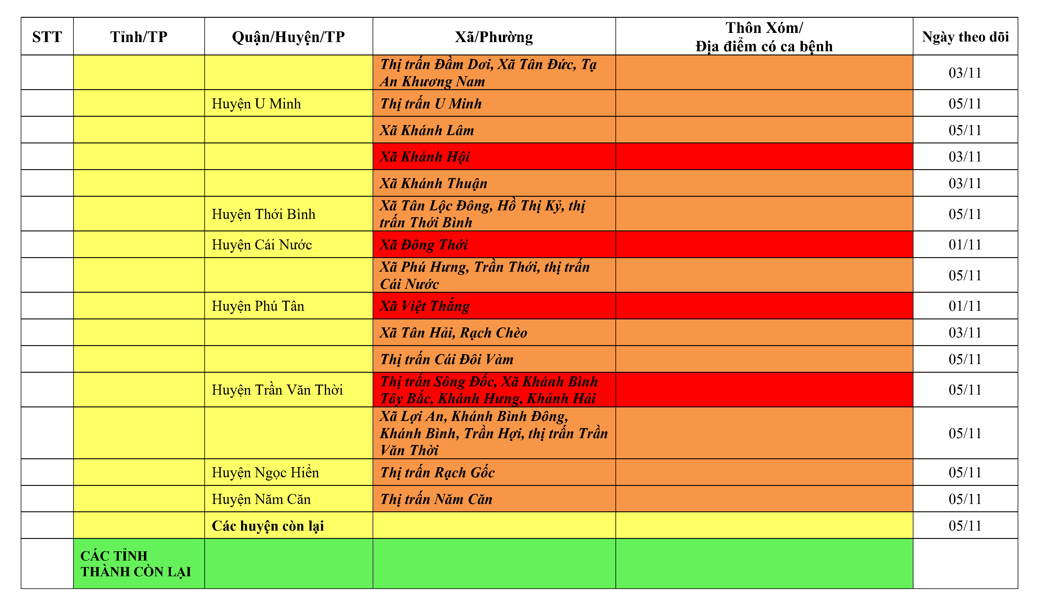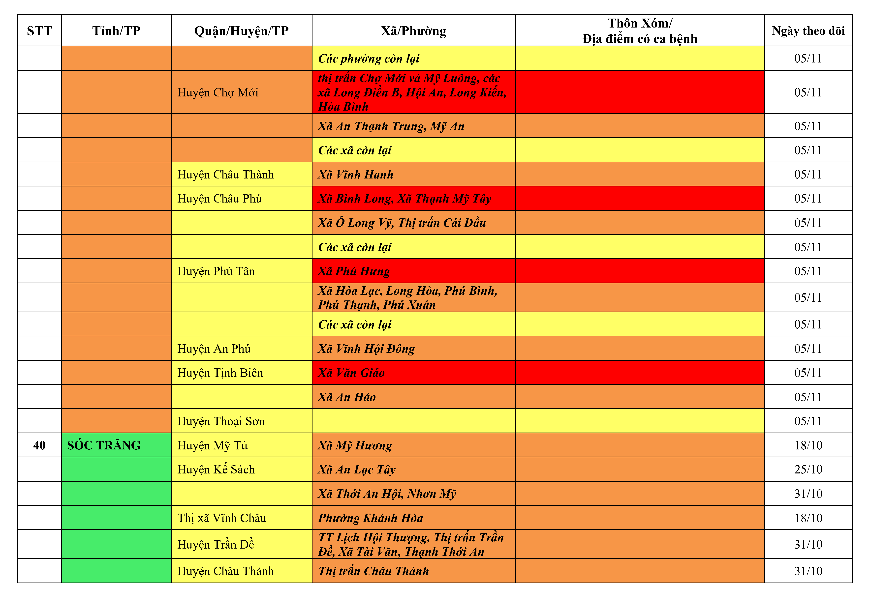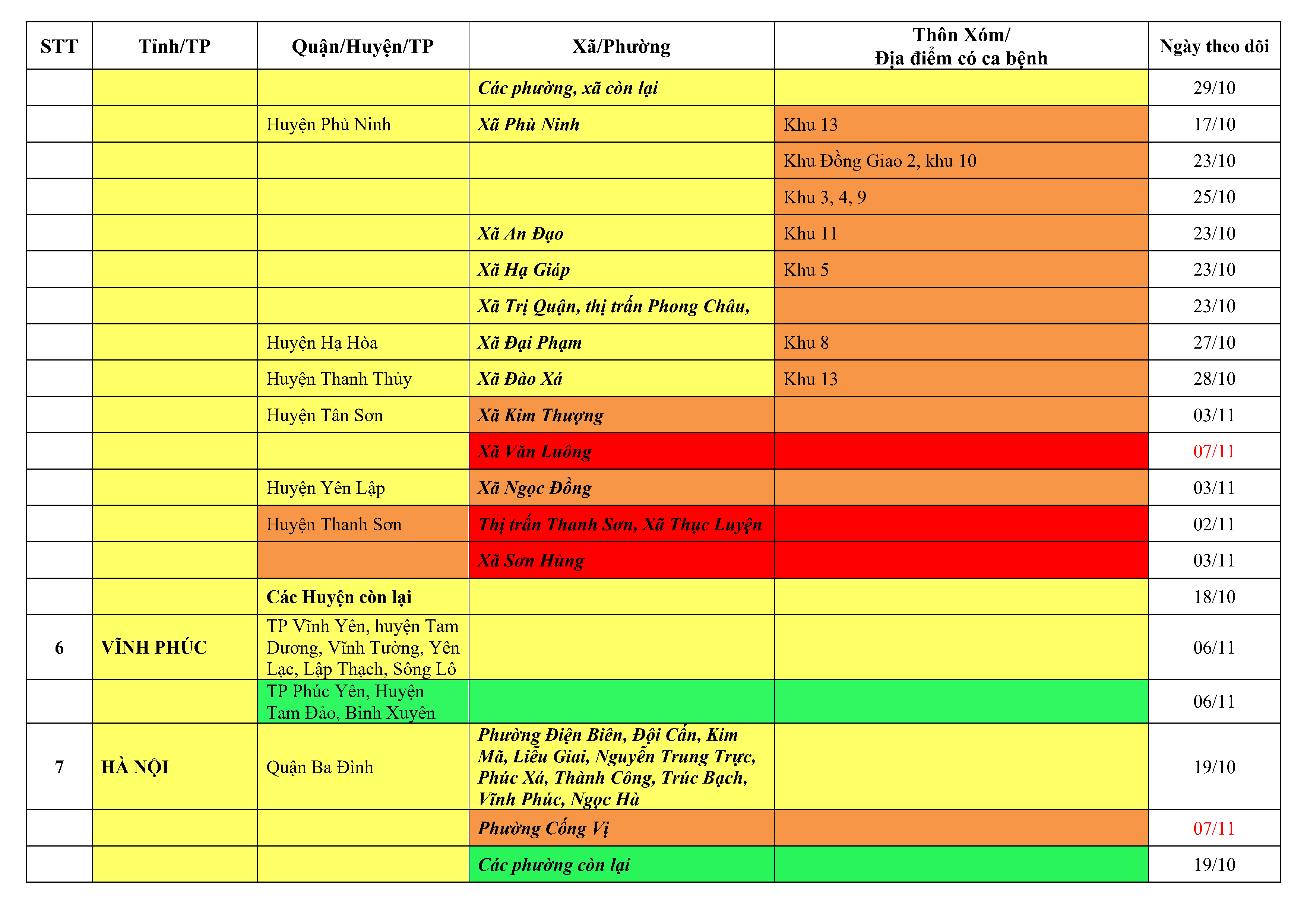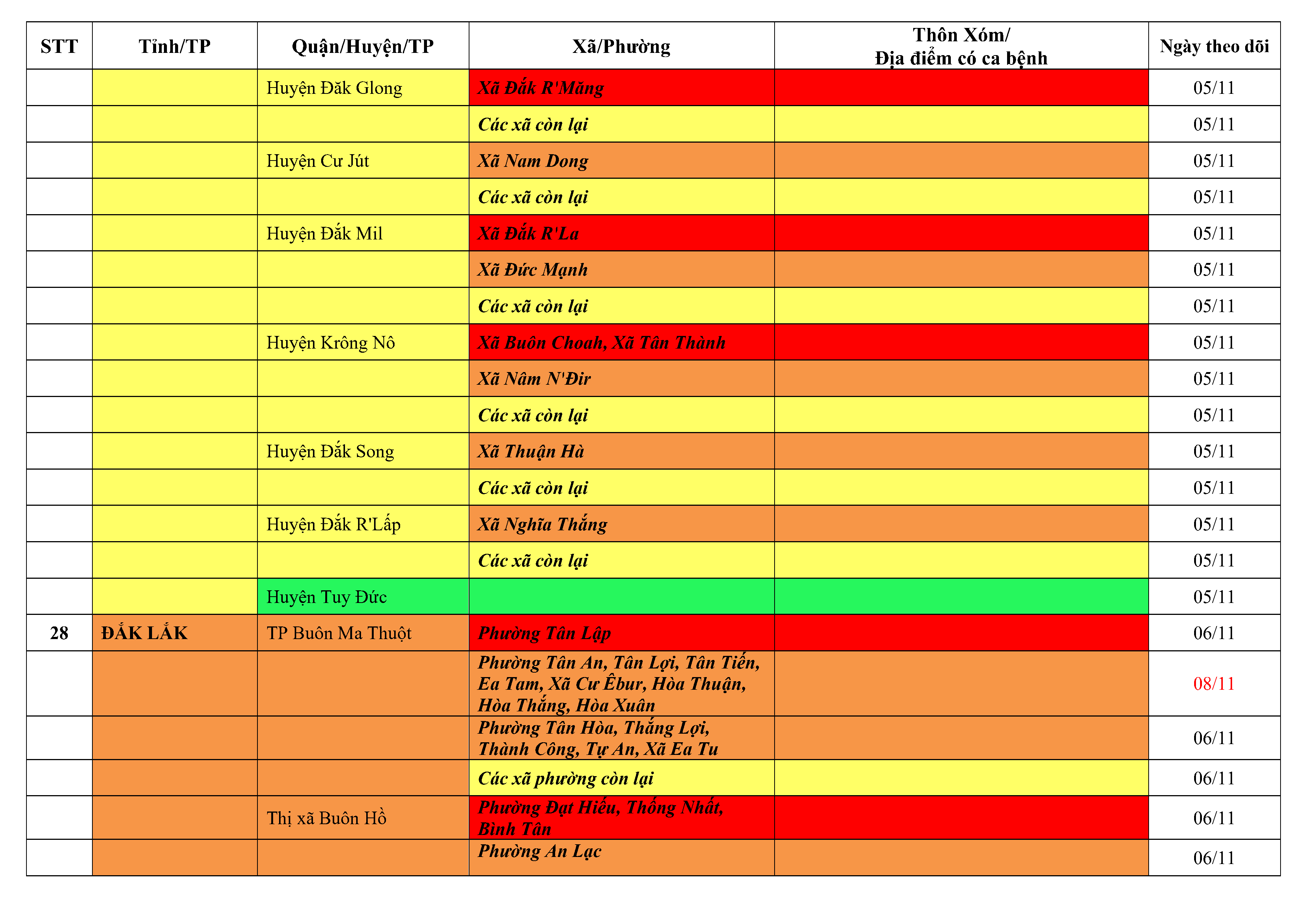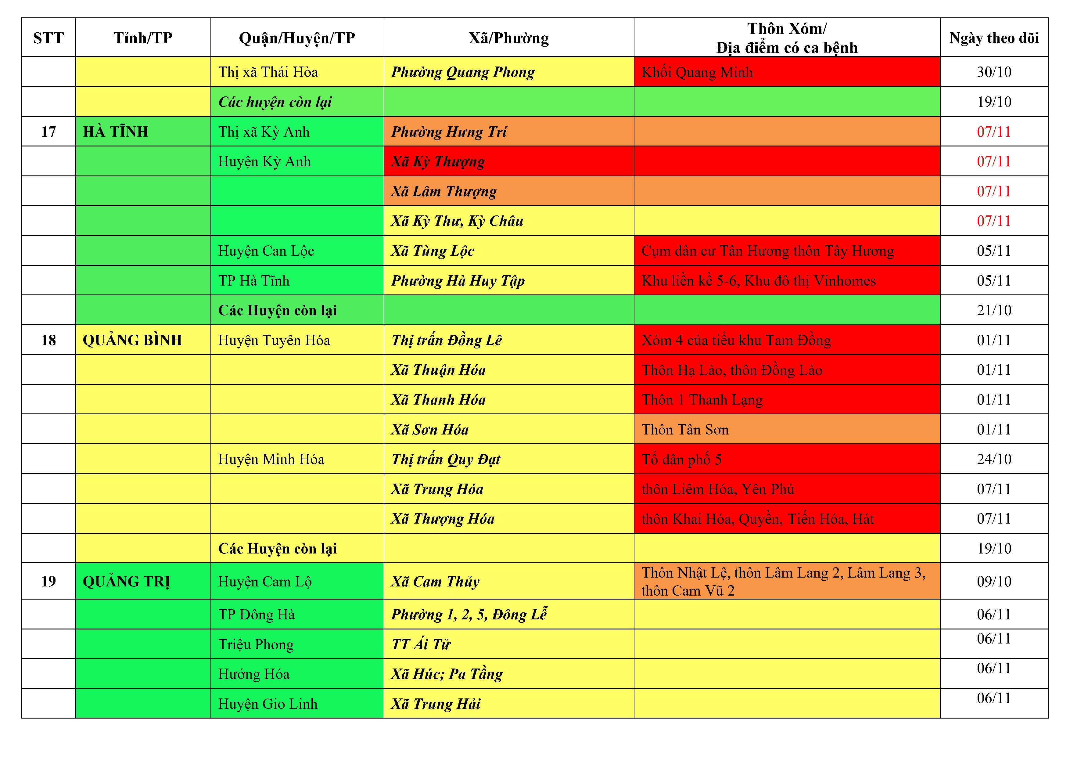 Lưu ý: Các tỉnh, thành phố không có tên trong bảng màu, đi lại bình thường, tuân thủ các biện pháp phòng chống dịch theo chỉ đạo của Bộ Y tế; khai báo y tế, thực hiện nghiêm 5K.