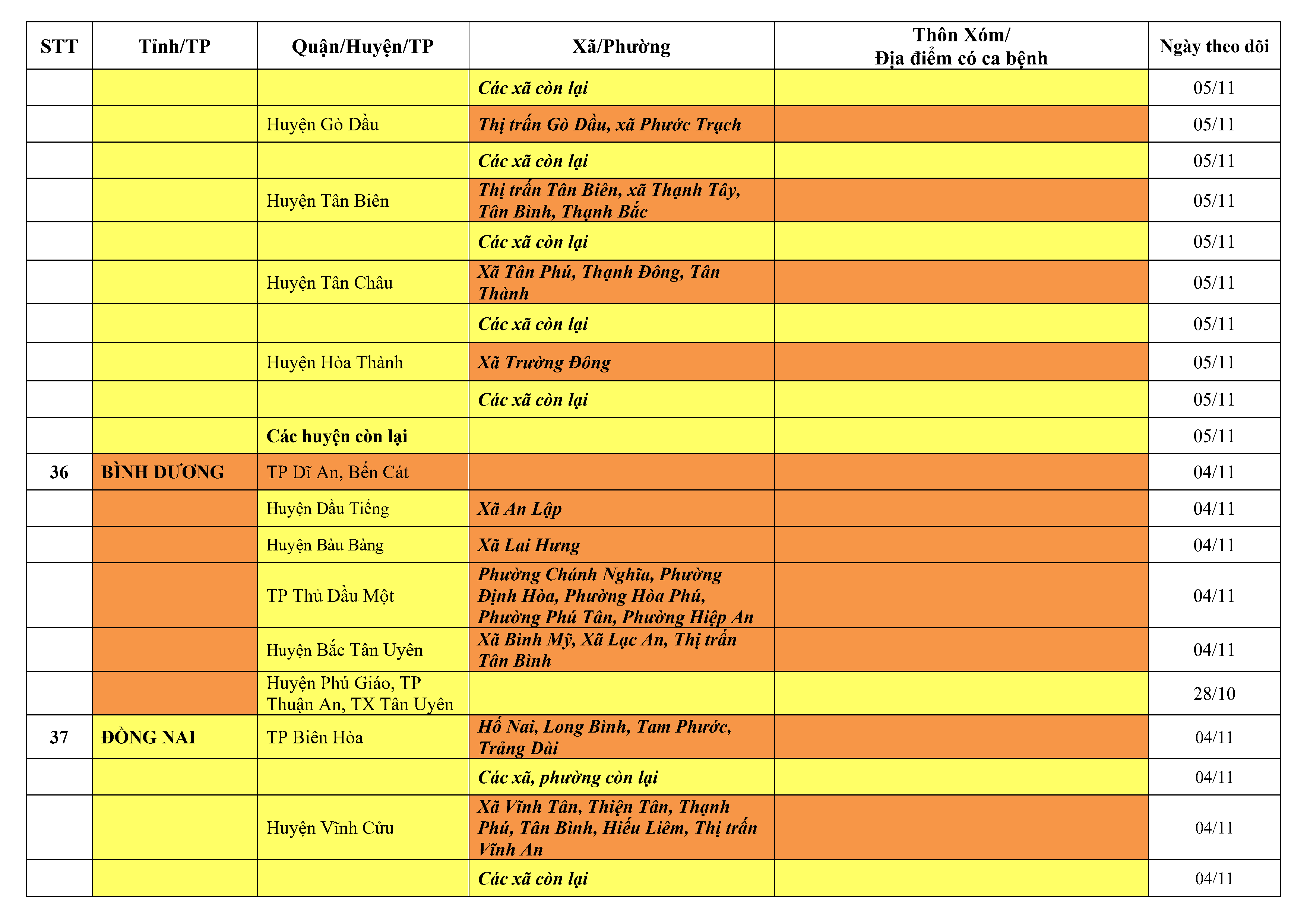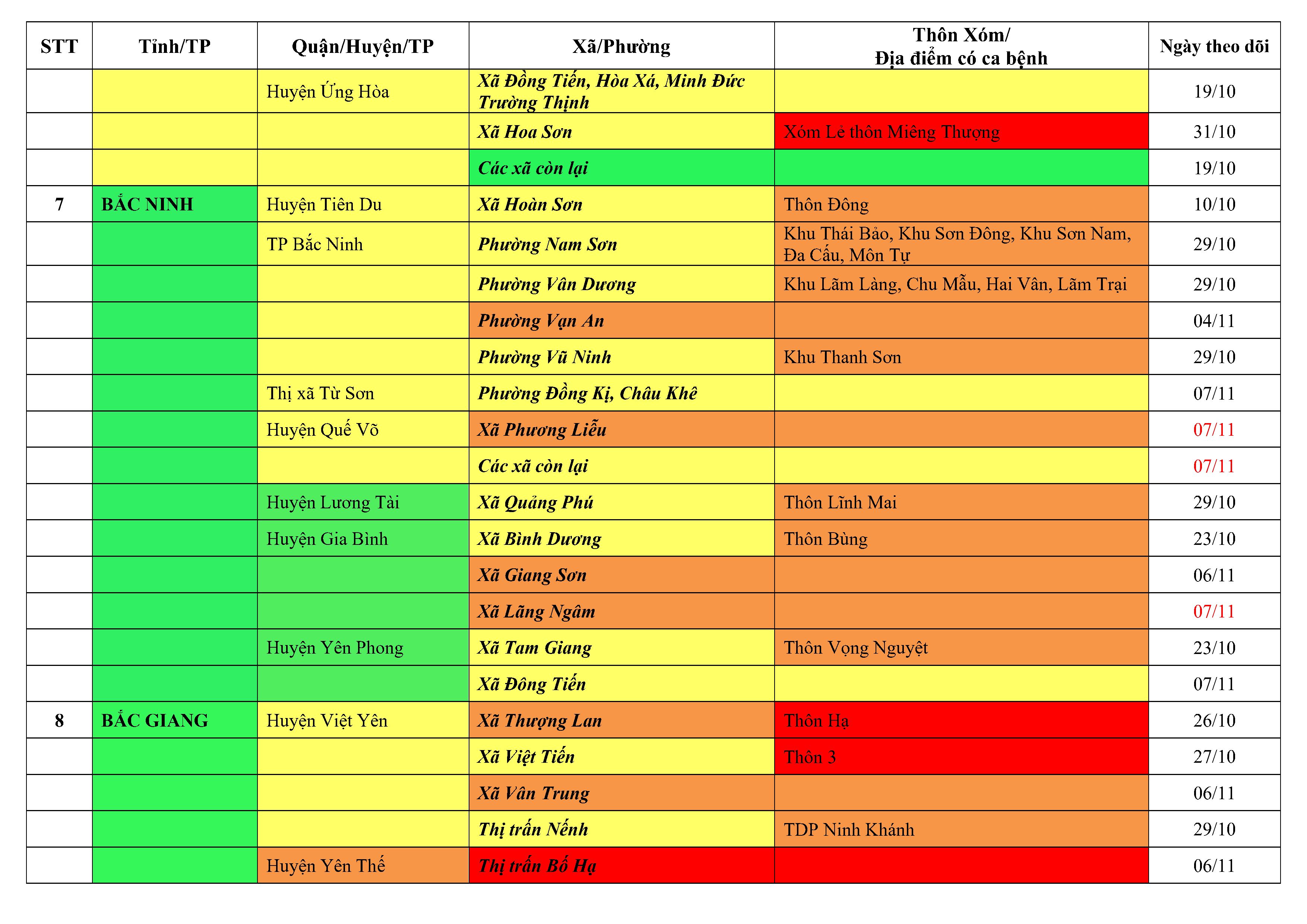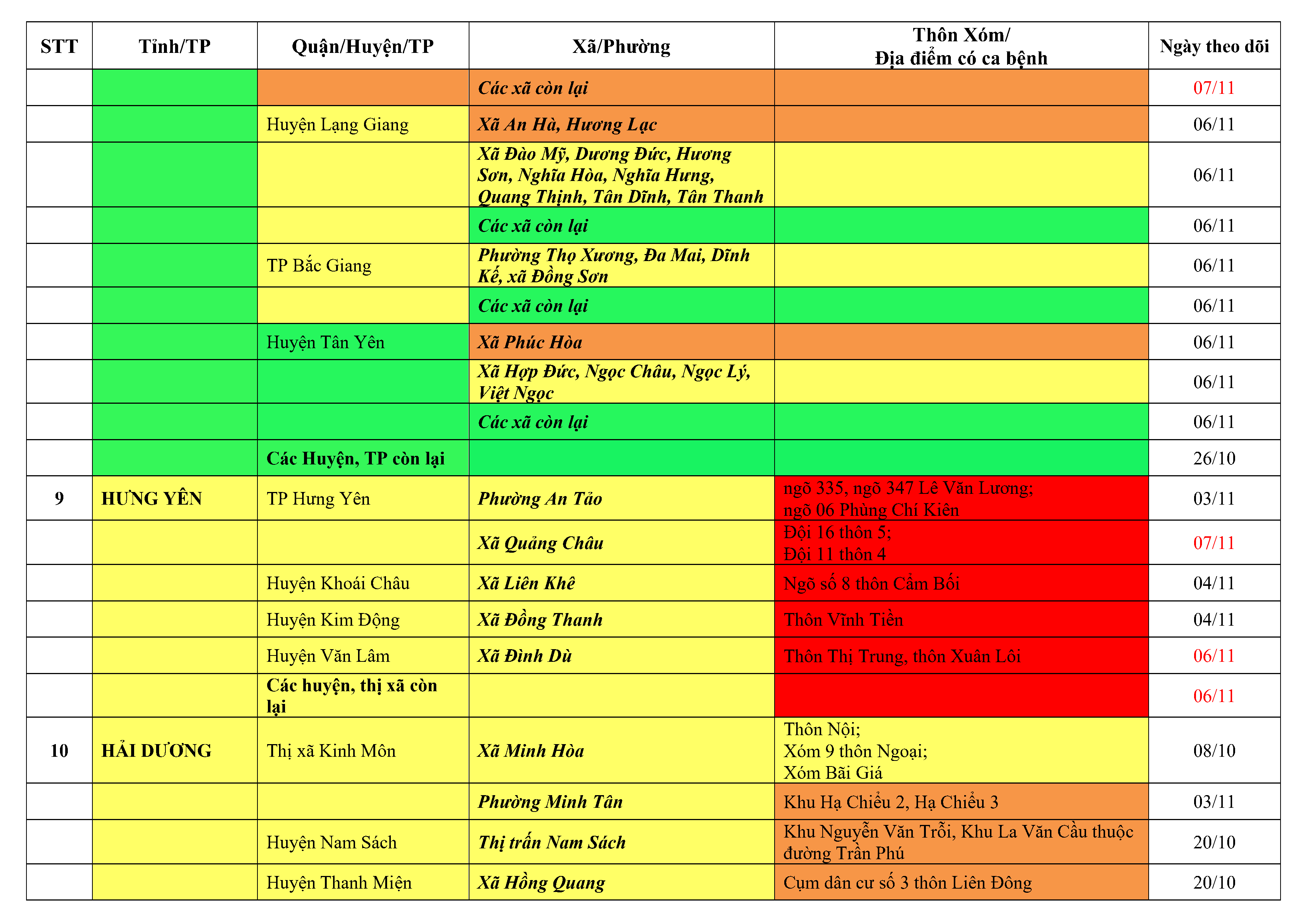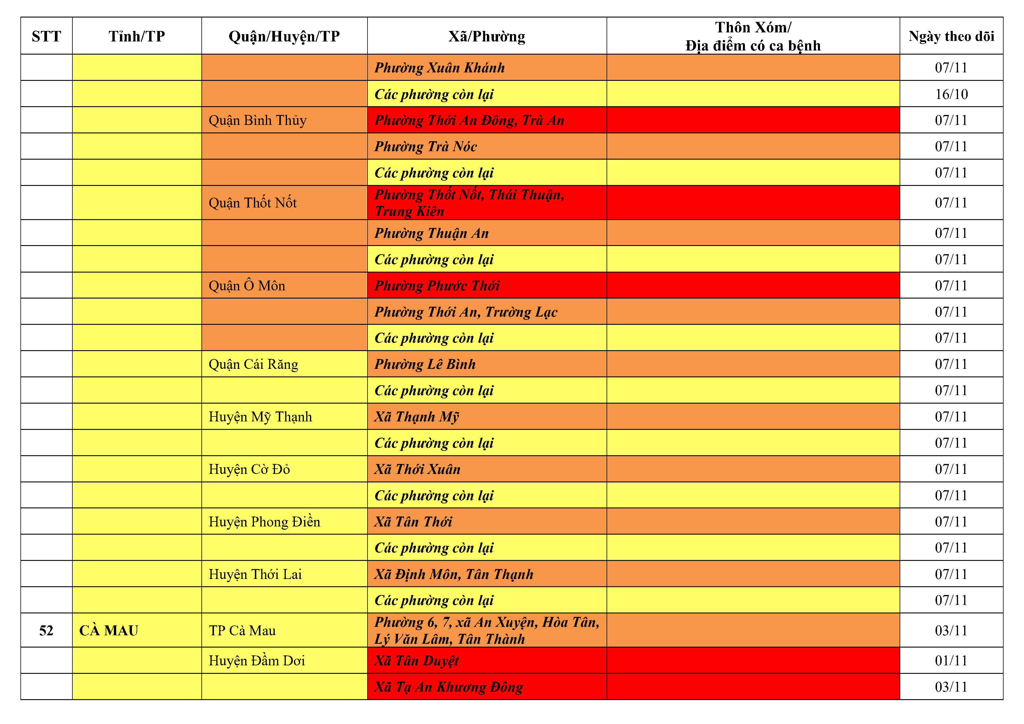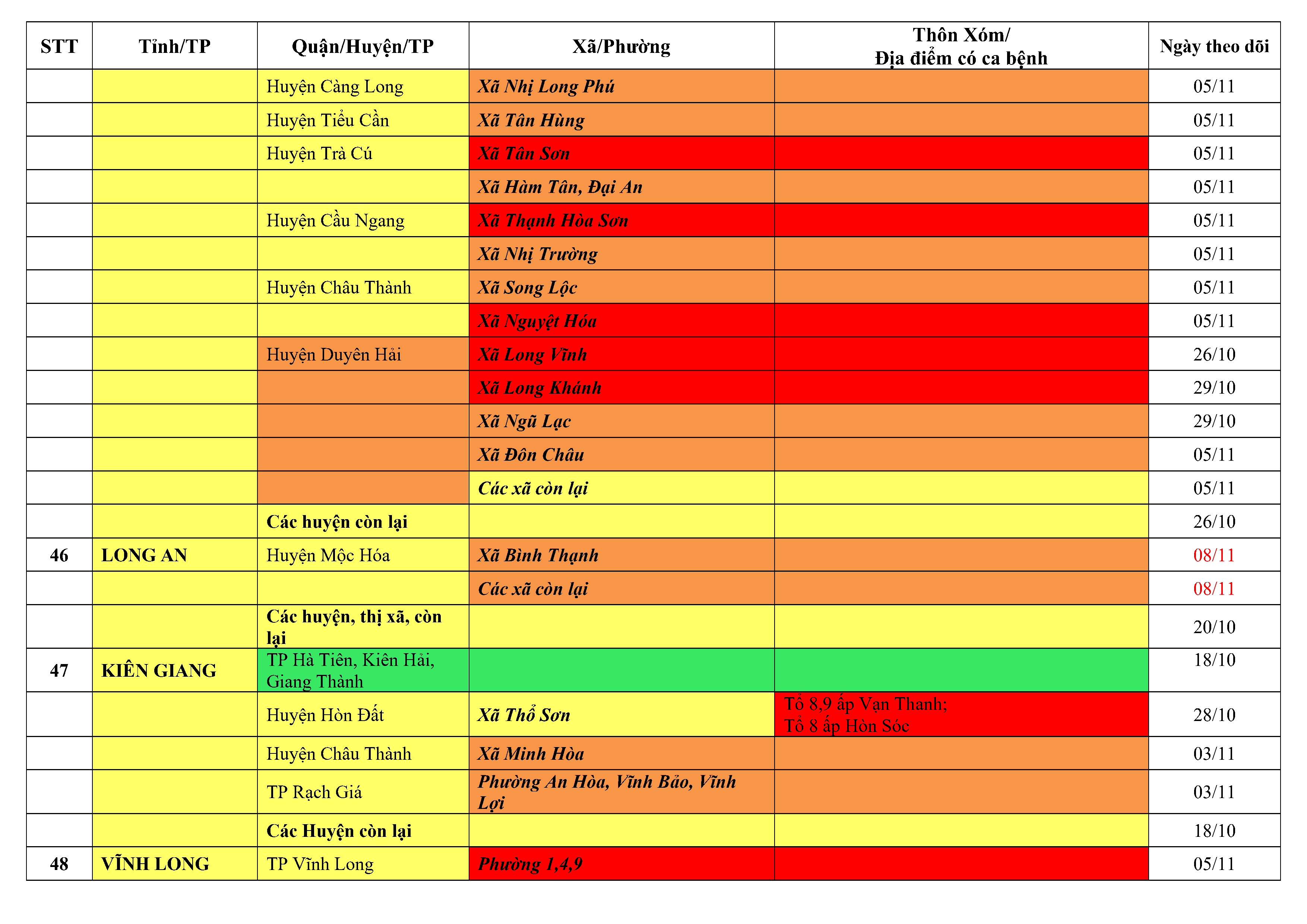 Lưu ý: Các tỉnh, thành phố không có tên trong bảng màu, đi lại bình thường, tuân thủ các biện pháp phòng chống dịch theo chỉ đạo của Bộ Y tế; khai báo y tế, thực hiện nghiêm 5K.