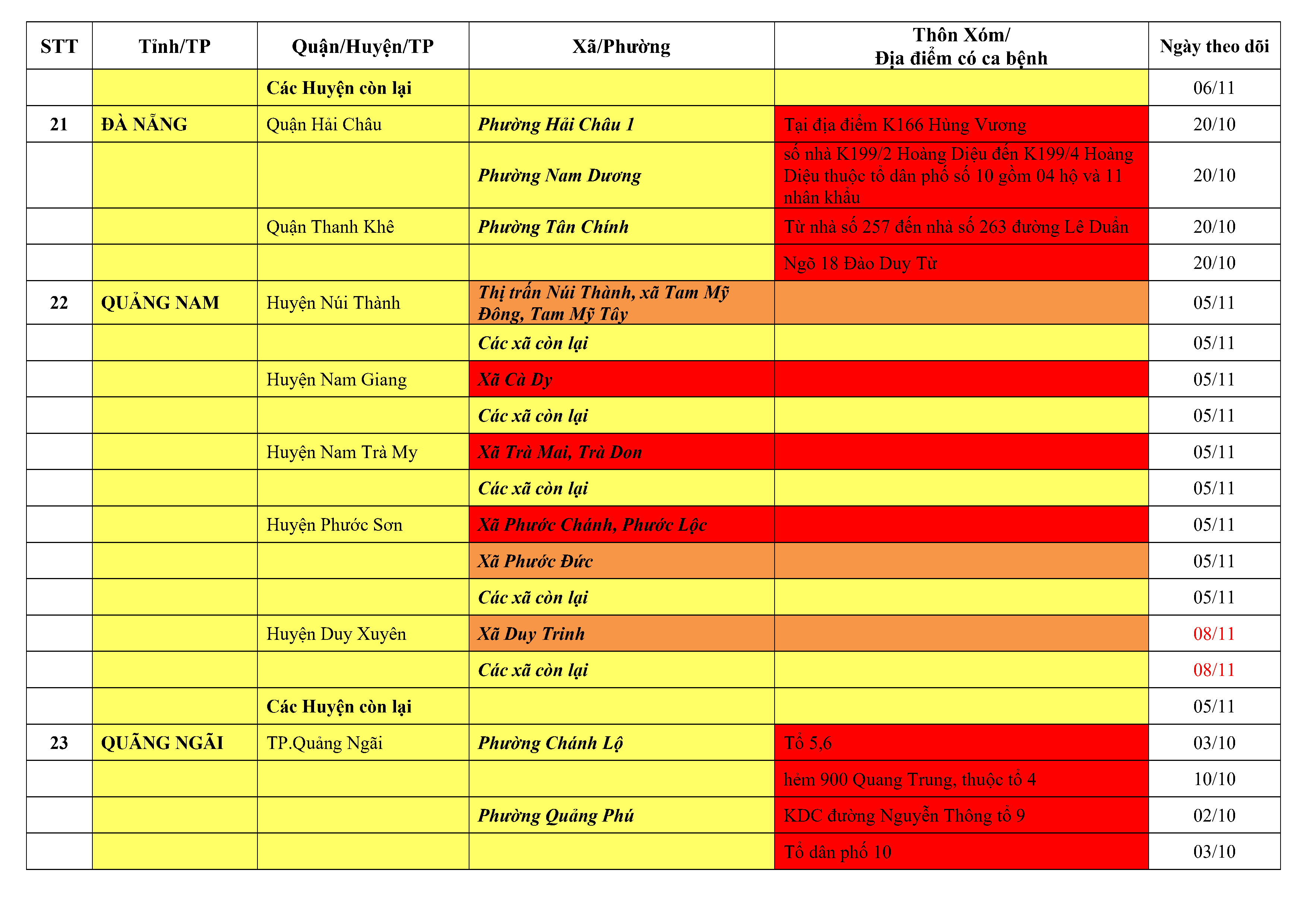 Áp dụng biện pháp tương ứng màu sắc ô cột theo thôn xóm; xã phường; quận huyện; tỉnh thành phố. Cách ly y tế dựa vào việc tiếp xúc, đi đến địa điểm và nơi cư trú có ca bệnh, theo Thông báo của Bộ Y tế, các tỉnh thành phố.