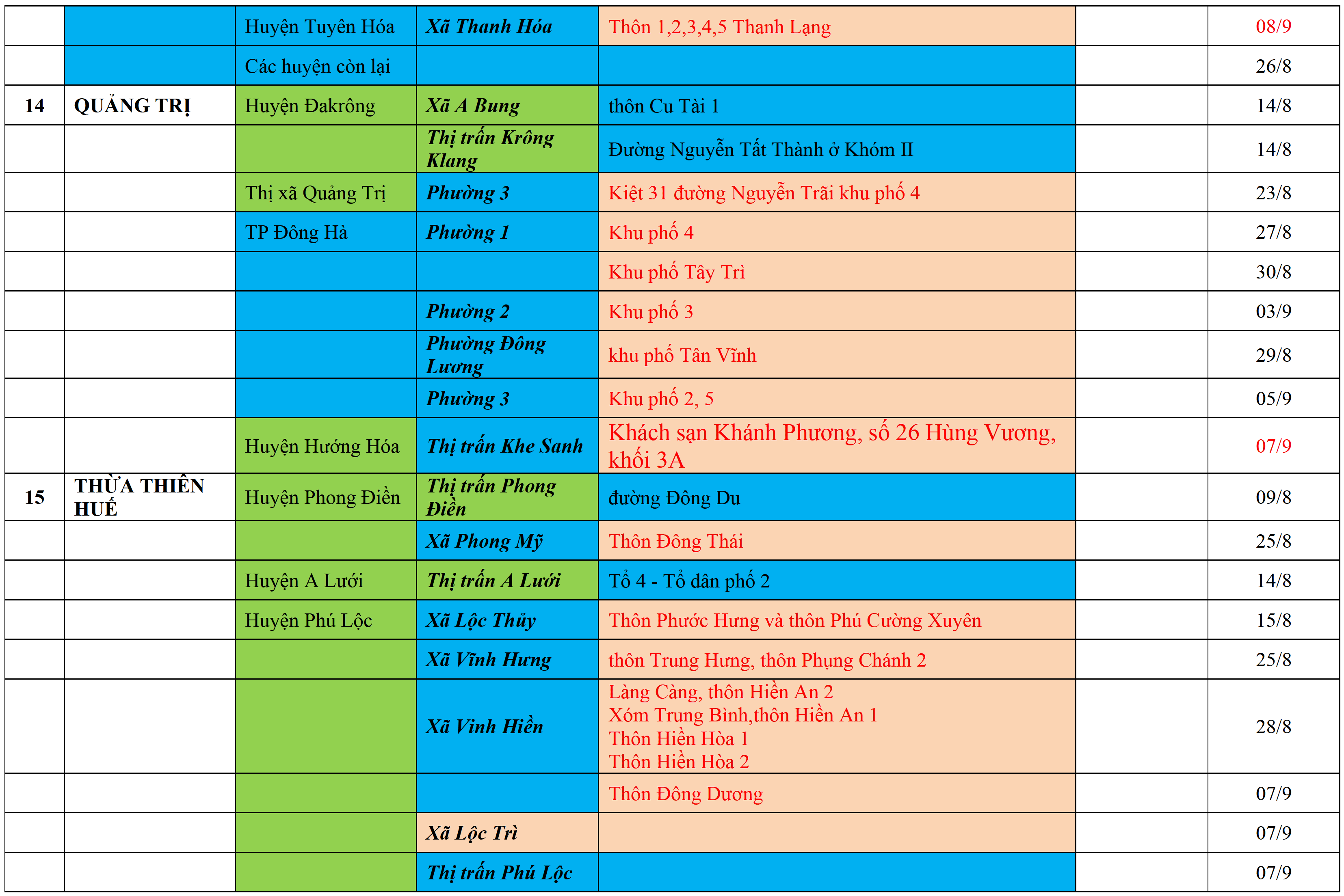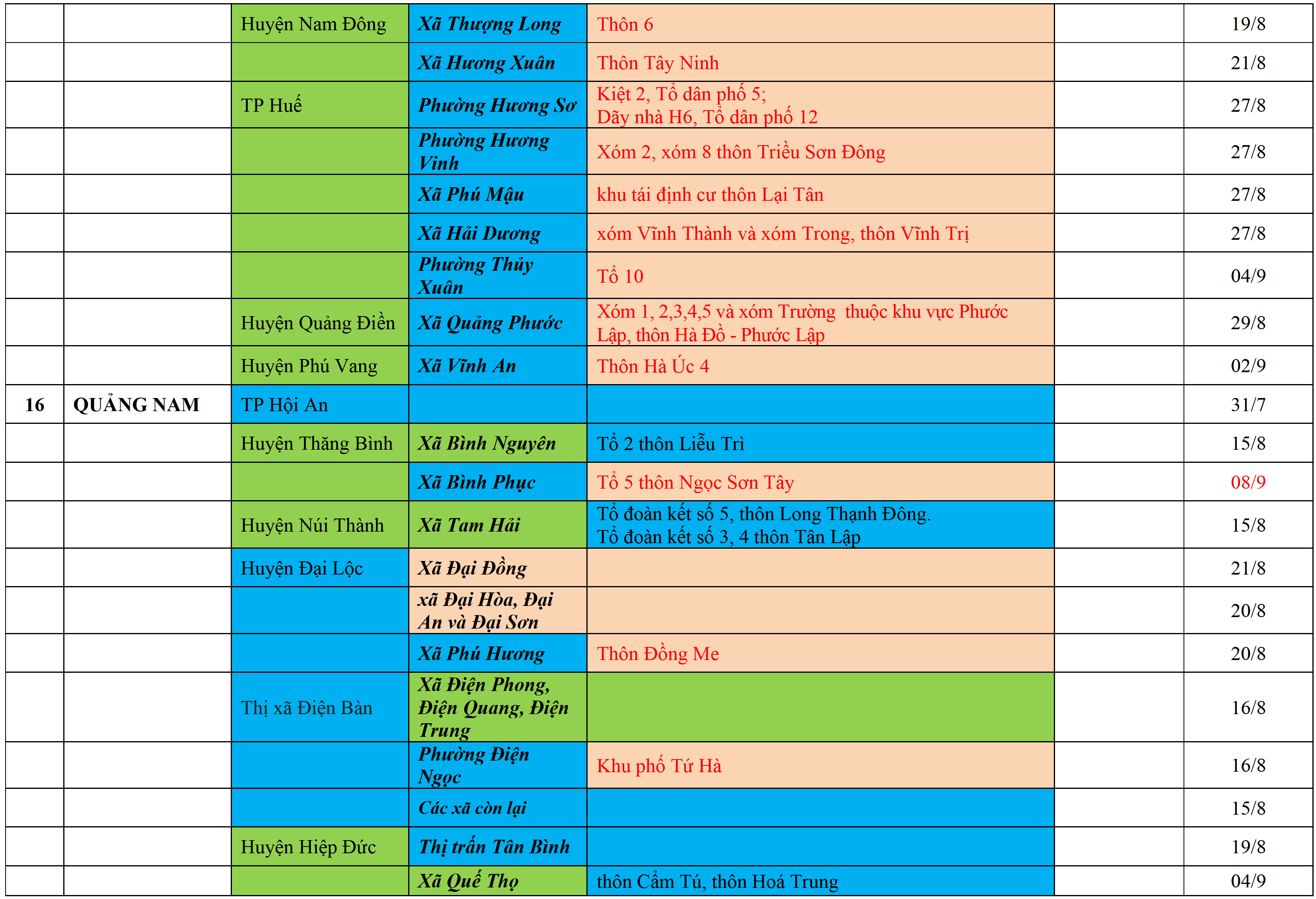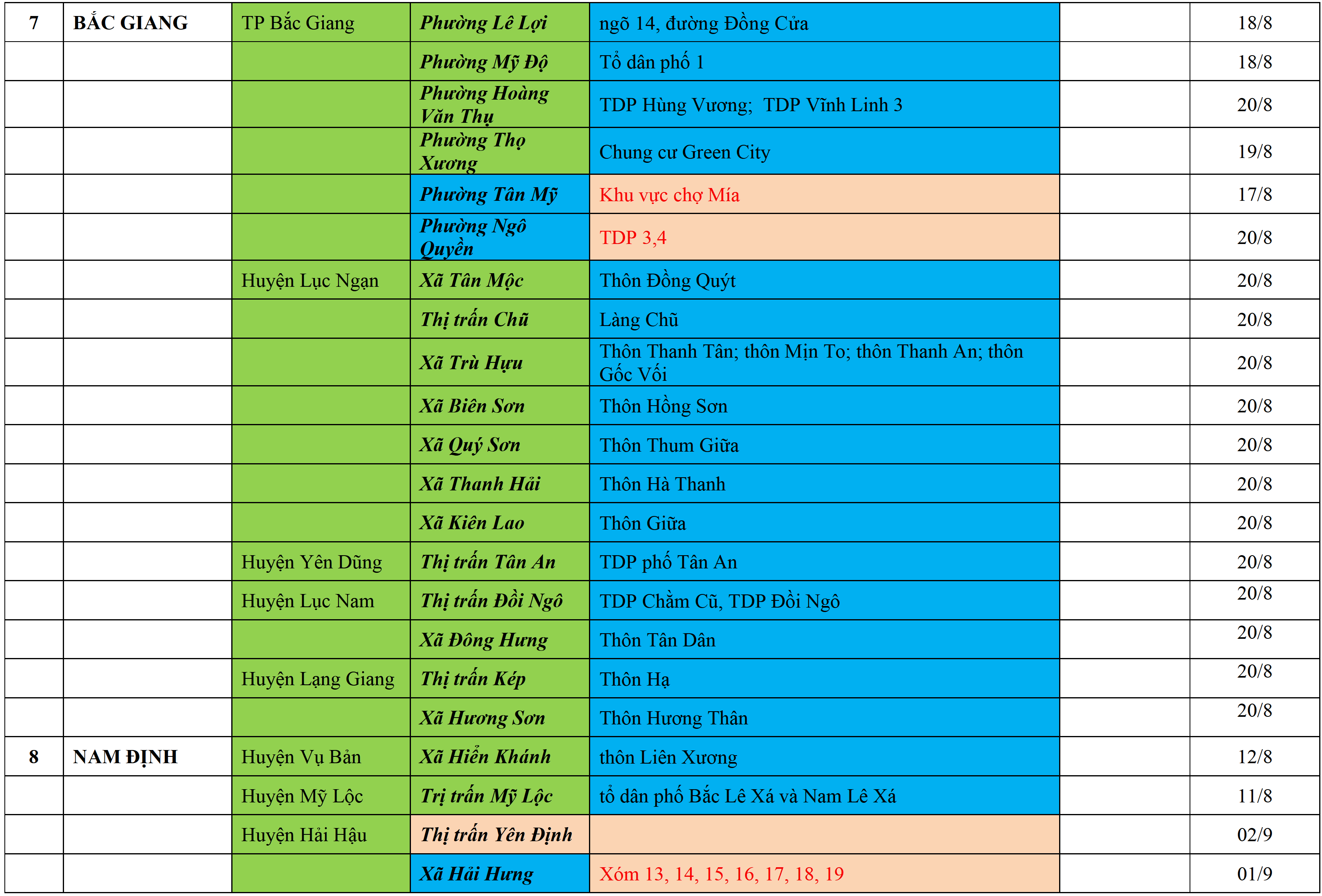 Màu nâu: TẠM DỪNG TIẾP NHẬN; Màu cam: CÁCH LY TẬP TRUNG 14 NGÀY; Màu xanh nước biển: CÁCH LY TẠI NHÀ 14 NGÀY; Màu xanh mạ: KHAI BÁO, GIÁM SÁT Y TẾ; Màu trắng: KHAI BÁO Y TẾ VÀ THỰC HIỆN 5K.