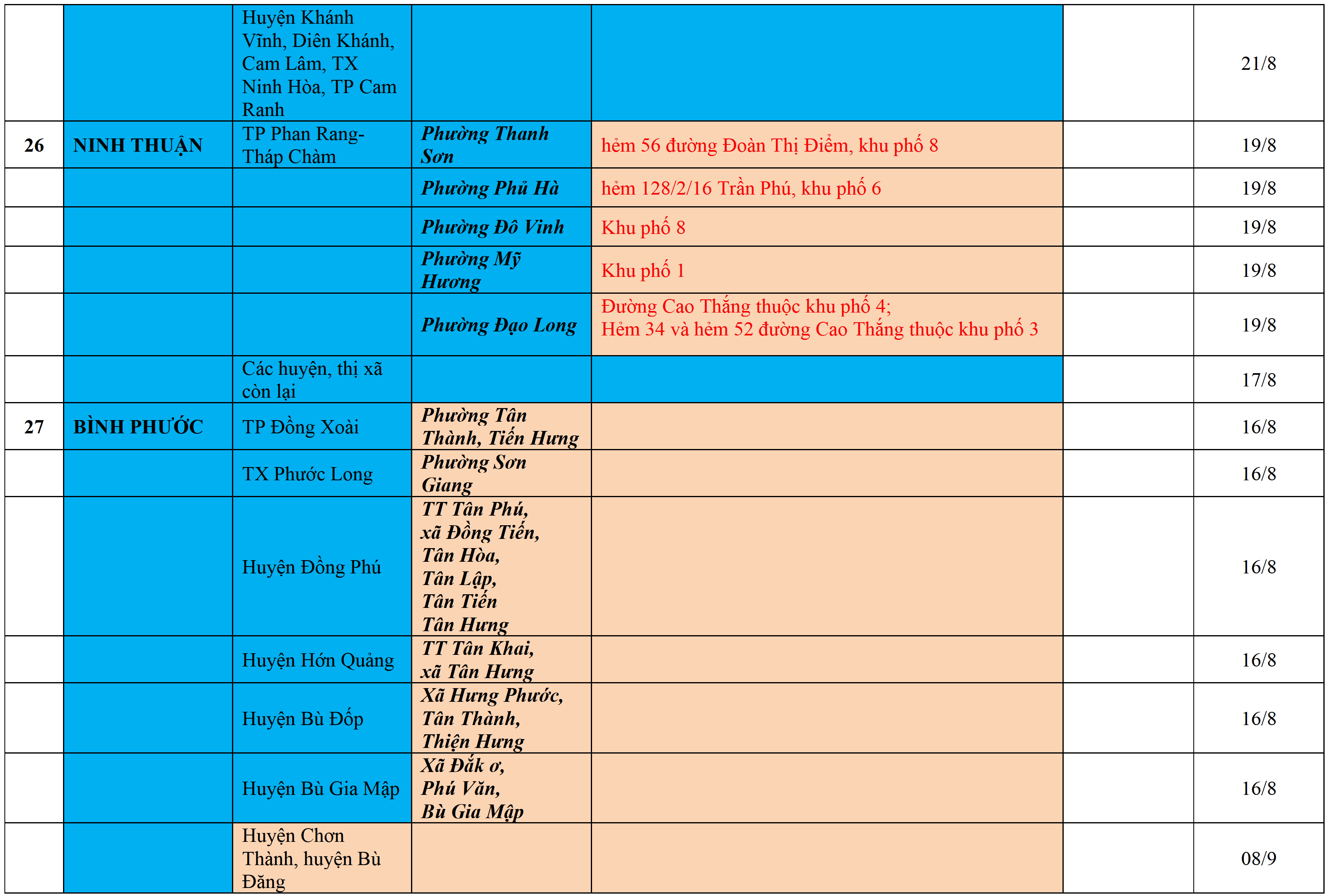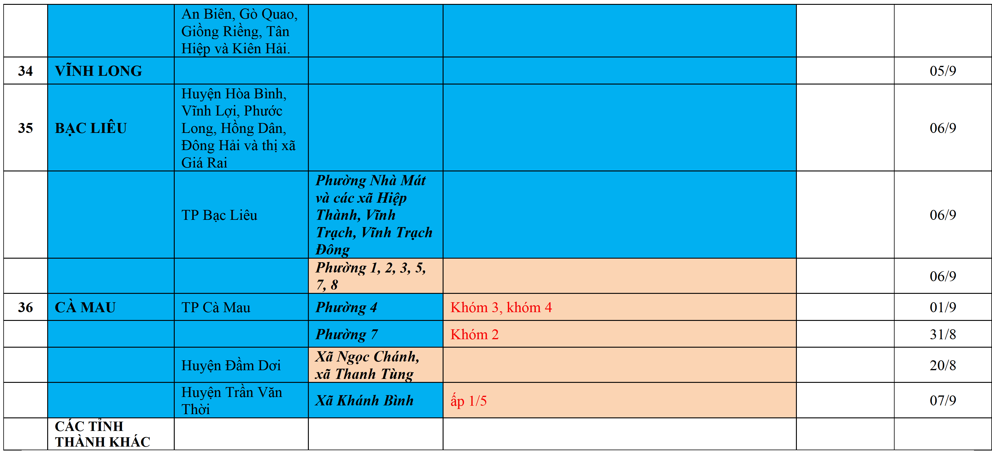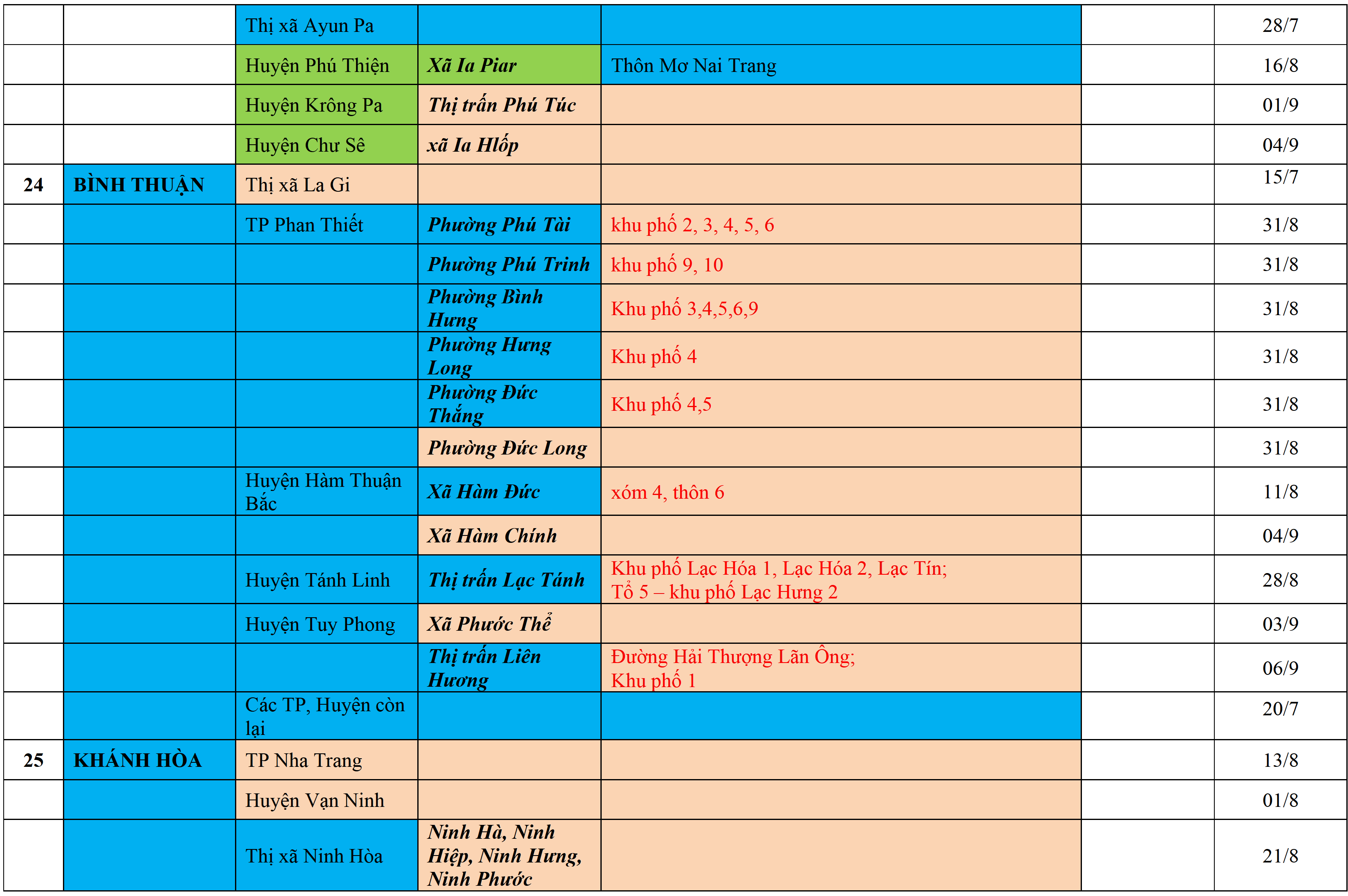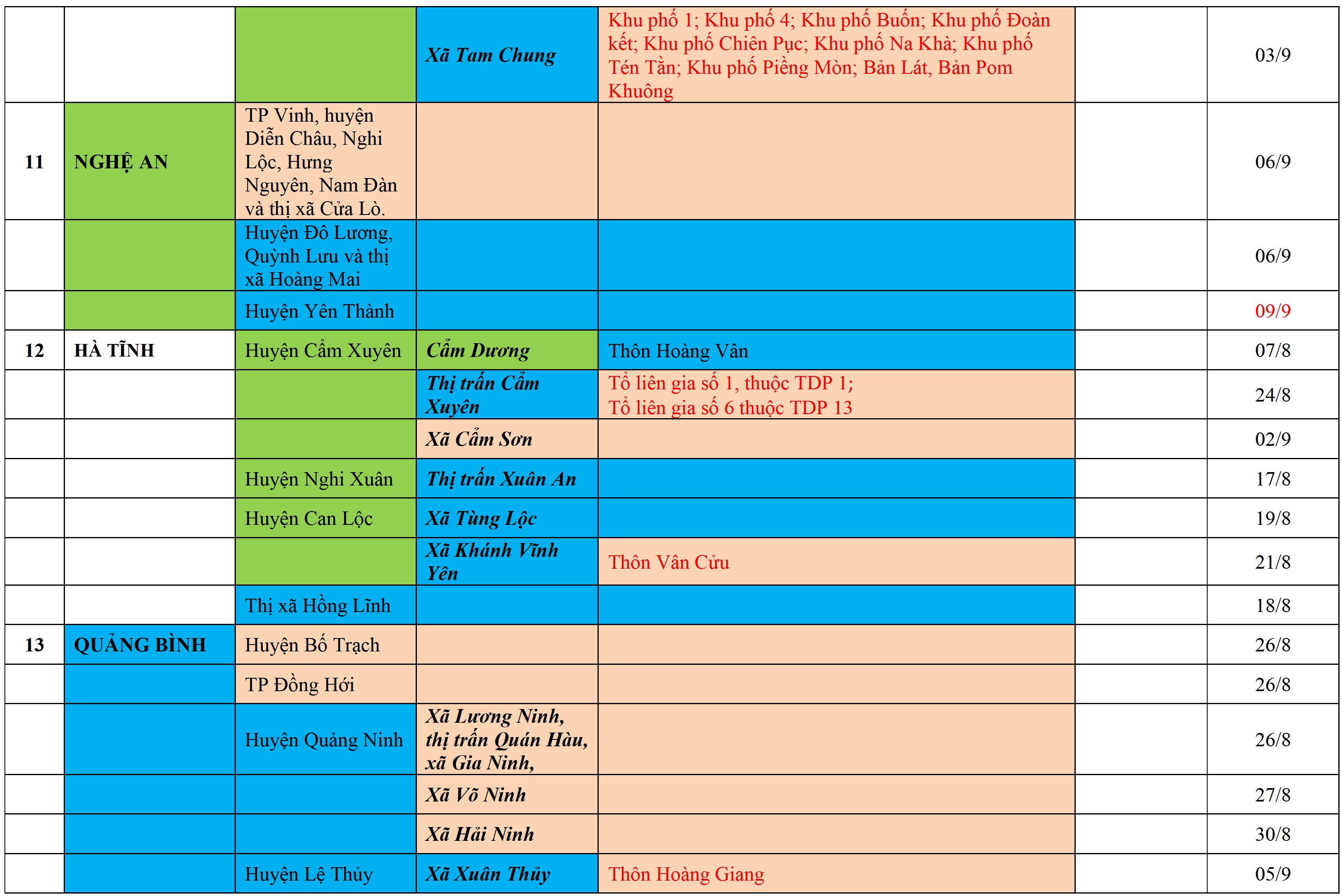 Màu nâu: TẠM DỪNG TIẾP NHẬN; Màu cam: CÁCH LY TẬP TRUNG 14 NGÀY; Màu xanh nước biển: CÁCH LY TẠI NHÀ 14 NGÀY; Màu xanh mạ: KHAI BÁO, GIÁM SÁT Y TẾ; Màu trắng: KHAI BÁO Y TẾ VÀ THỰC HIỆN 5K.