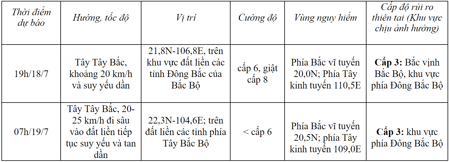 Từ 18/7 đến ngày 19/7, ở khu vực Đông Bắc, Việt Bắc có mưa to đến rất to với lượng mưa phổ biến 200-300mm, cục bộ có nơi trên 350mm; khu vực Tây Bắc, vùng đồng bằng Bắc Bộ, Thanh Hóa và Nghệ An có mưa vừa, mưa to, có nơi mưa rất to với lượng mưa phổ biến 70-150mm. Đề phòng mưa với cường suất lớn gây ngập úng đô thị. Cảnh báo nguy cơ cao lũ quét, sạt lở đất tại các tỉnh Quảng Ninh, Lạng Sơn, Cao Bằng, Hà Giang, Lào Cai, Yên Bái.