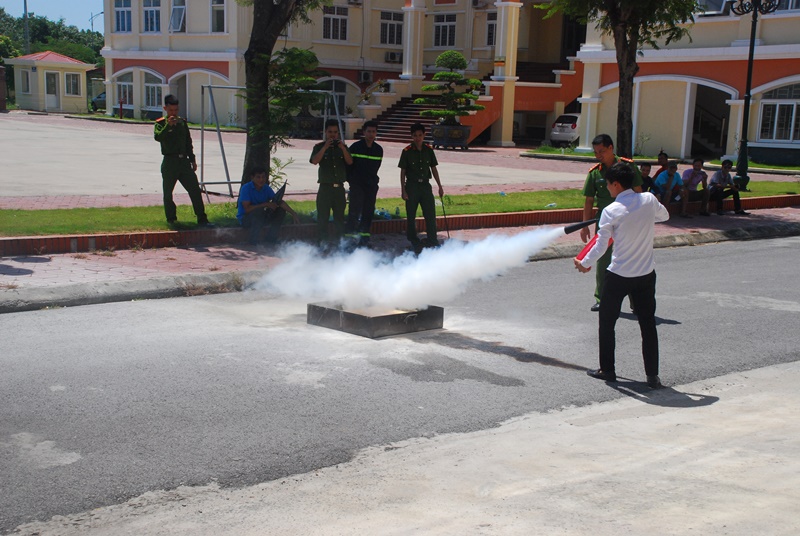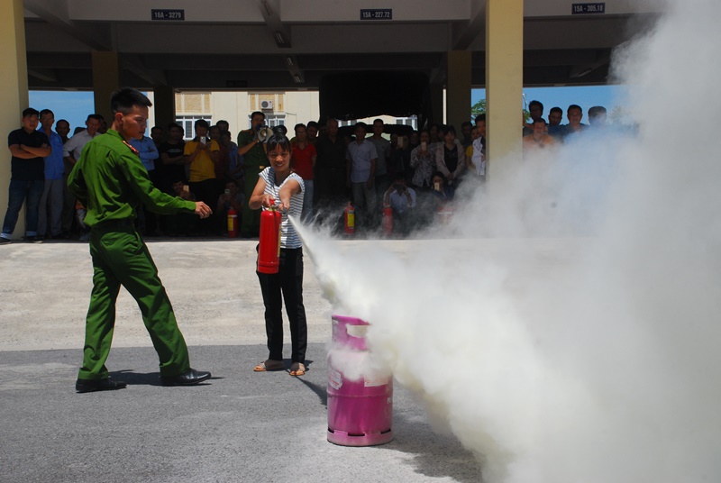 Ngay sau đó, các học viên được thực hành thao tác sử dụng bình bột dập tắt khay xăng đang cháy; sử dụng bình khí CO2 dập tắt khay xăng và sử dụng các phương tiện chữa cháy thông dụng được trang bị tại cơ sở, khu dân cư và gia đình.