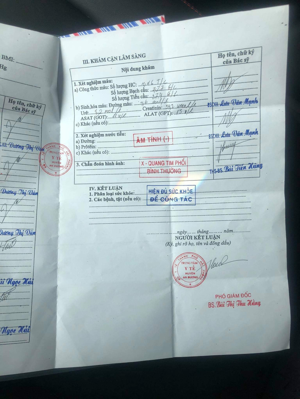 Tiến hành xác minh tại Bệnh viện Đa khoa quốc tế Hải Phòng, bệnh viên xác nhận các mẫu giấy khám sức khoẻ mà Cơ quan CSĐT – CAQ Kiến An thu giữ được không phải là do bệnh viện phát hành; tên 7/7 vị bác sĩ ghi trong 7 dấu vuông chức danh thu giữ của đối tượng Thoa bệnh viện không có…