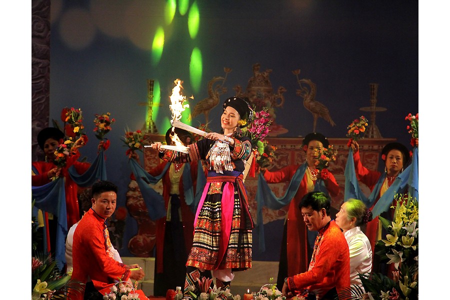 Giá hầu “Cô bé Sapa” thanh đồng Đào Thị Hương tham gia diễn xướng Chầu văn kỷ niệm 2 năm UNESCO vinh danh “Tín ngưỡng thờ Mẫu, Tam phủ người Việt”.