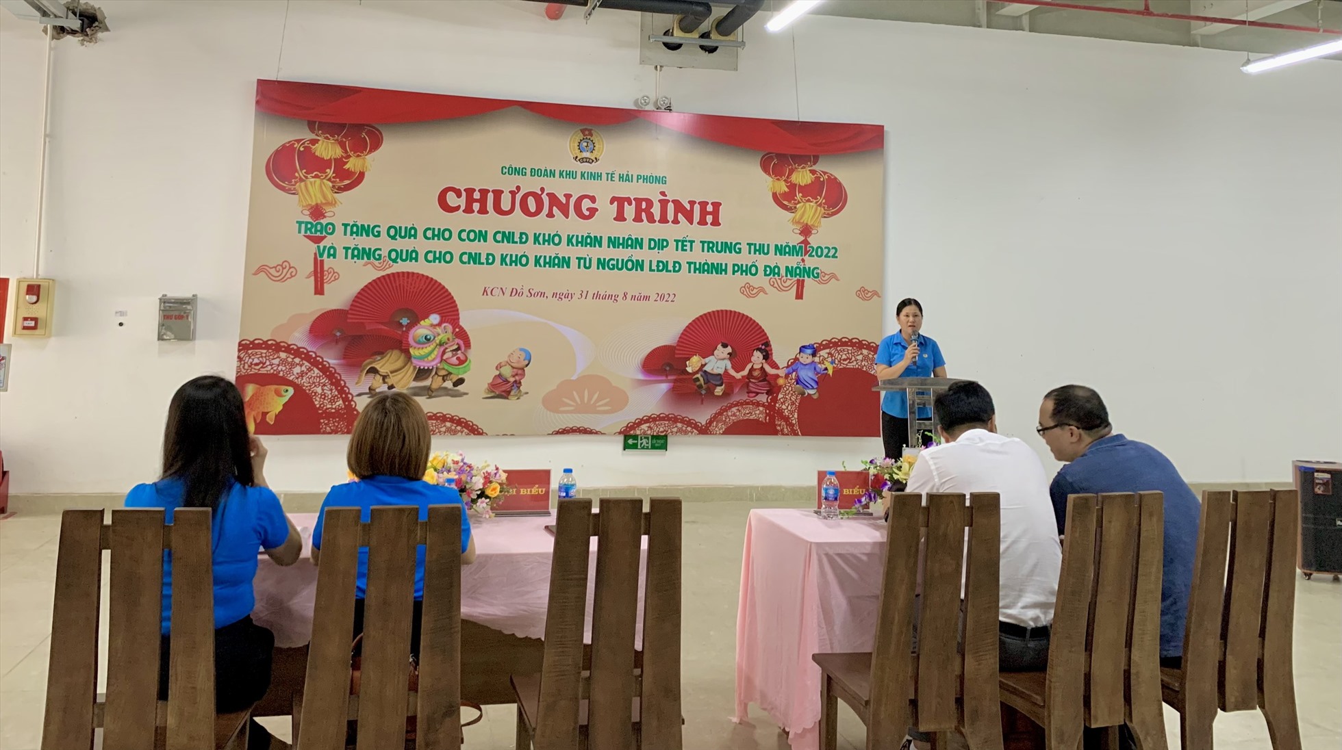 Phát biểu tại buổi lễ, bà Đinh Thị Thúy Hà, Uỷ viên ban thường vụ LĐLĐ TP, Chủ tịch Công đoàn khu kinh tế Hải Phòng nhấn mạnh, nhân dịp Tết Trung thu năm 2022, các Công đoàn cơ sở chung tay cùng với doanh nghiệp chăm lo cho NLĐ thông qua việc tặng quà cho NLĐ, tổng suất quà dự kiến sẽ được trao trong đợt này là 6.200 suất quà với tổng giá trị hơn 1 tỉ đồng, trong đó có nhiều doanh nghiệp tặng quà cho NLĐ mỗi suất là 500.000 đồng và 1 triệu đồng/suất. Đây là những việc làm thiết thực quan tâm chăm lo đến người lao động, góp phần thực hiện có hiệu quả chính sách an sinh xã hội trong các Khu kinh tế, Khu công nghiệp.