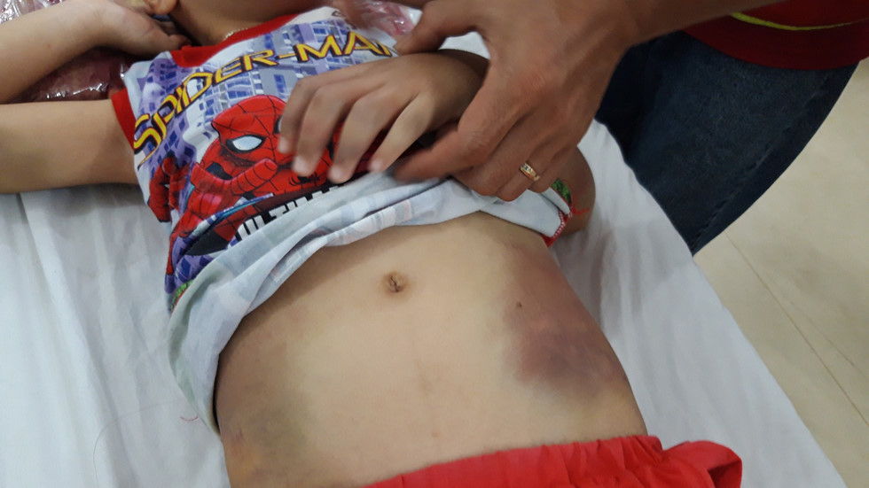 Ngay lập tức, lực lượng chức năng đã có mặt tại nhà trọ trên để giải cứu cháu bé và đưa cháu đến bệnh viện Đa khoa tỉnh Tây Ninh để kiểm tra. Kết quả, hai bên bụng của bé trai có hai mảng bầm xanh tím, lưng cũng xuất hiện các vết bầm, cánh tay, các ngón tay cũng bị sưng to, tím đen.