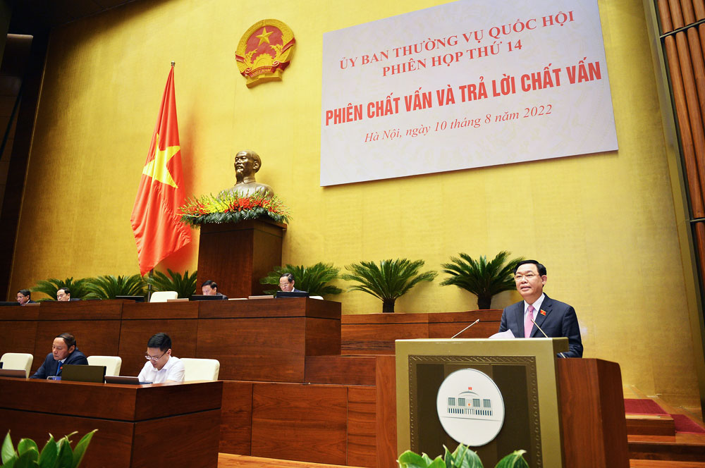 Ngày 10/8, tiếp tục chương trình Phiên họp thứ 14, Ủy ban Thường vụ Quốc hội tổ chức hoạt động chất vấn tại Phòng Diên Hồng, Nhà Quốc hội và kết nối truyền hình trực tuyến với 62 Đoàn đại biểu Quốc hội (ĐBQH) tại các tỉnh, thành phố trực thuộc trung ương. Phiên chất vấn do đồng chí Vương Đình Huệ, Ủy viên Bộ Chính trị, Chủ tịch Quốc hội chủ trì.
