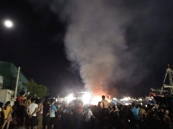 Đang neo đậu trong khu vực cảng, một chiếc tàu của ngư dân tại huyện Quỳnh Lưu (Nghệ An) bôc cháy dữ dội.