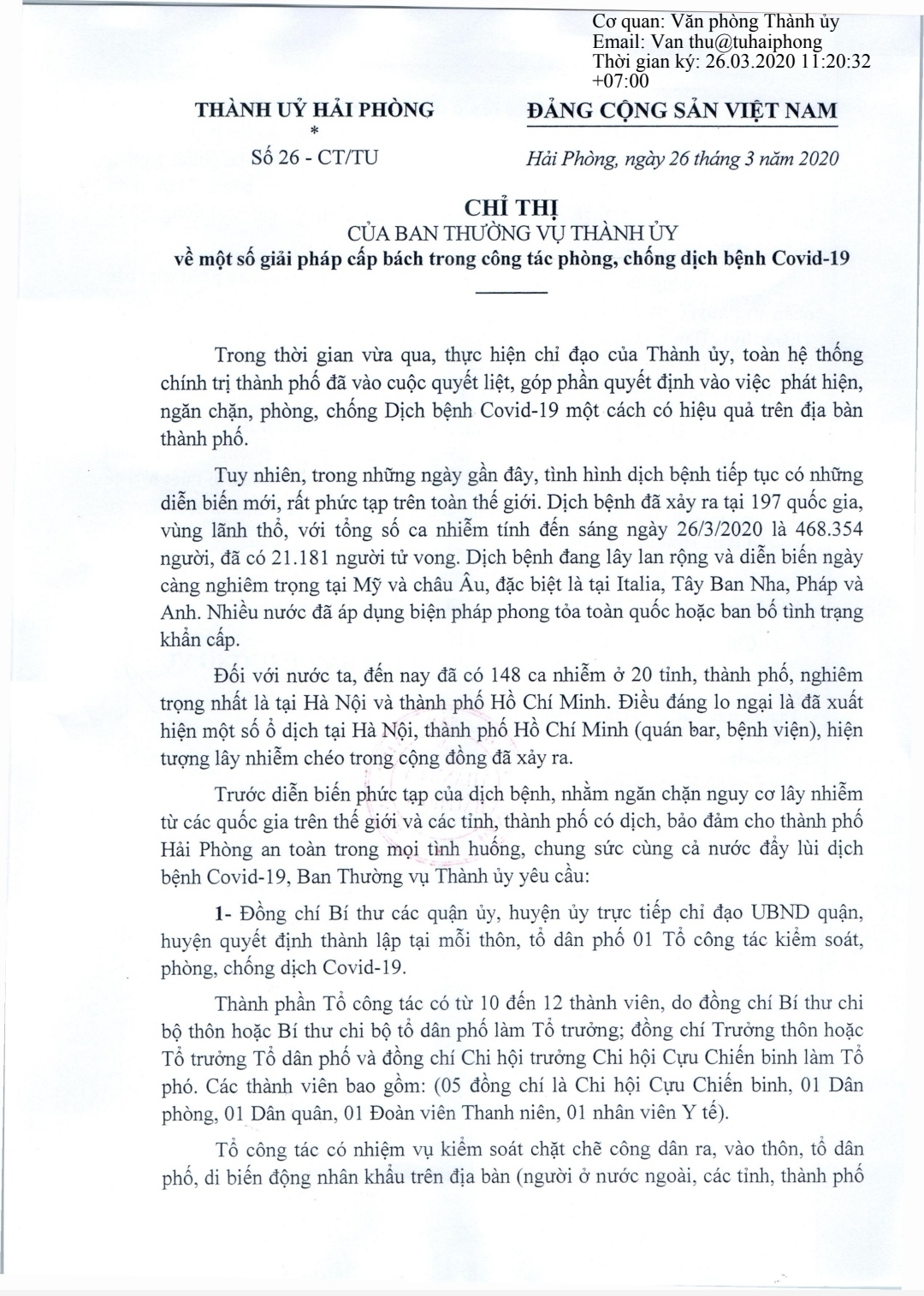 Trước diễn biến phức tạp của dịch bệnh, nhằm ngăn chặn nguy cơ lây nhiêm từ các quốc gia trên thế giới và các tỉnh, thành phố có dịch, bảo đảm cho thành phố Hải Phòng an toàn trong mọi tình huống, chung sức cùng cả nước đẩy lùi dịch bệnh Covid-19, Ban Thường vụ Thành ủy yêu cầu: