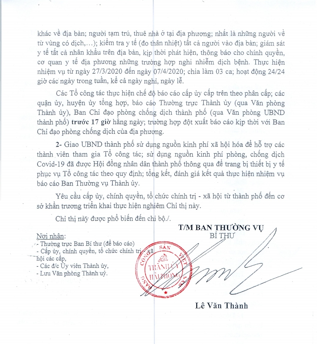 1. Đồng chí Bí thư các quận ủy, huyện ủy trực tiếp chỉ đạo UBND quận, huyện quyết định thành lập tại mỗi thôn, tổ dân phố 01 Tổ công tác kiểm soát, phòng, chống dịch Covid-19.