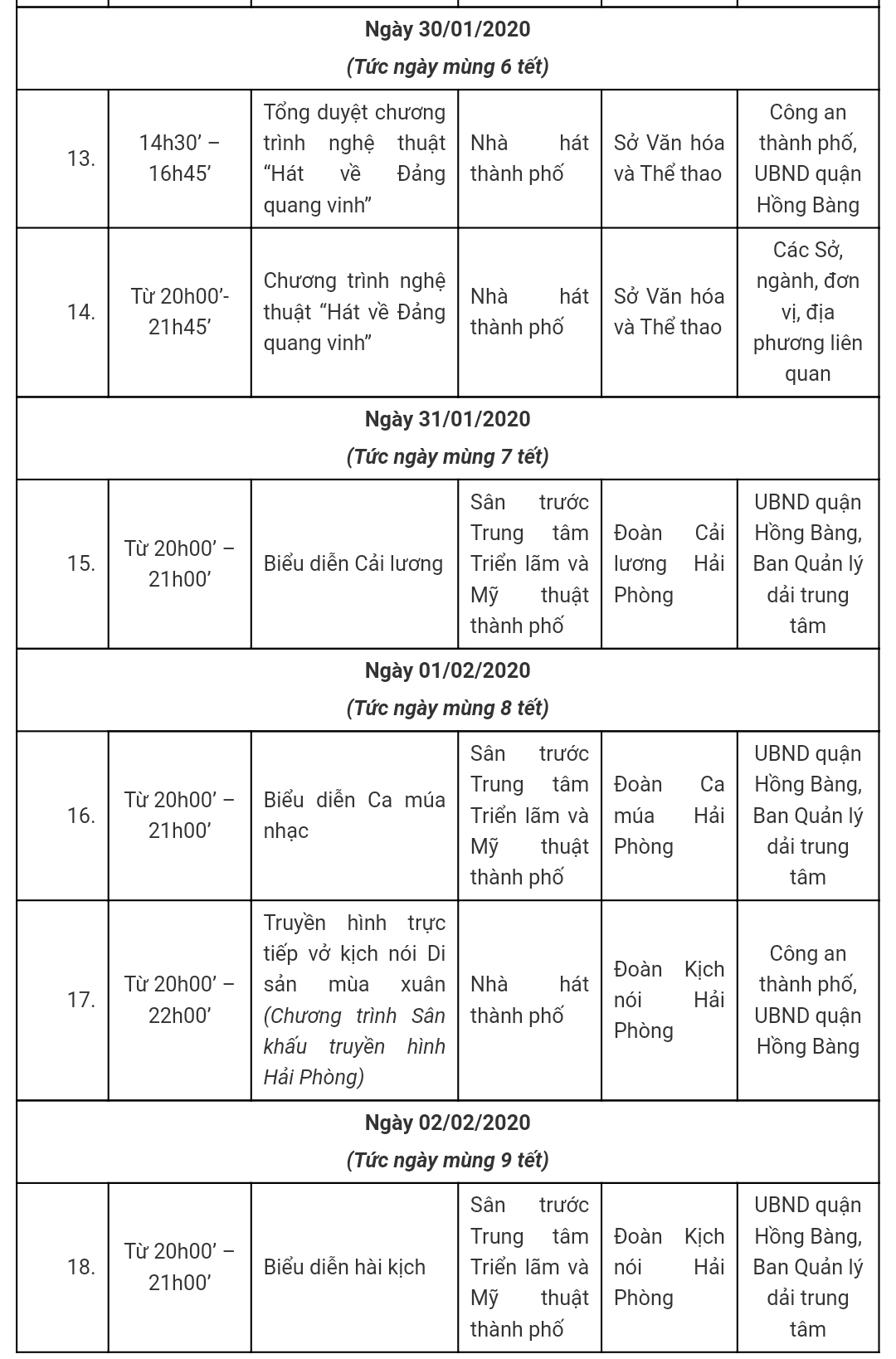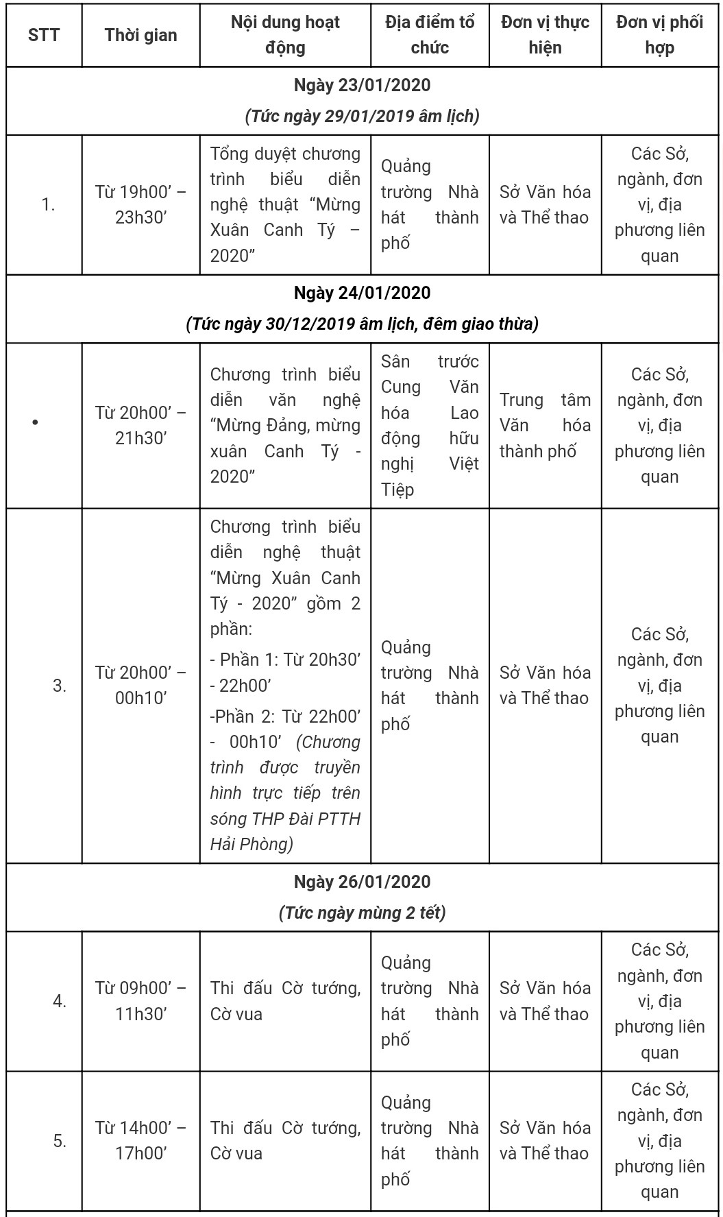 Ủy ban nhân dân thành phố tổ chức các chương trình nghệ thuật “Mừng xuân Canh Tý 2020” tại Quảng trường Nhà hát thành phố và Quảng trường Cung Văn hoá Lao động hữu nghị Việt Tiệp Hải Phòng, các chương trình biểu diễn nghệ thuật chào năm mới 2020 và hưởng ứng chào mừng kỷ niệm 90 năm Ngày thành lập Đảng Cộng sản Việt Nam, chương trình nghệ thuật “Hát về Đảng quang vinh”.