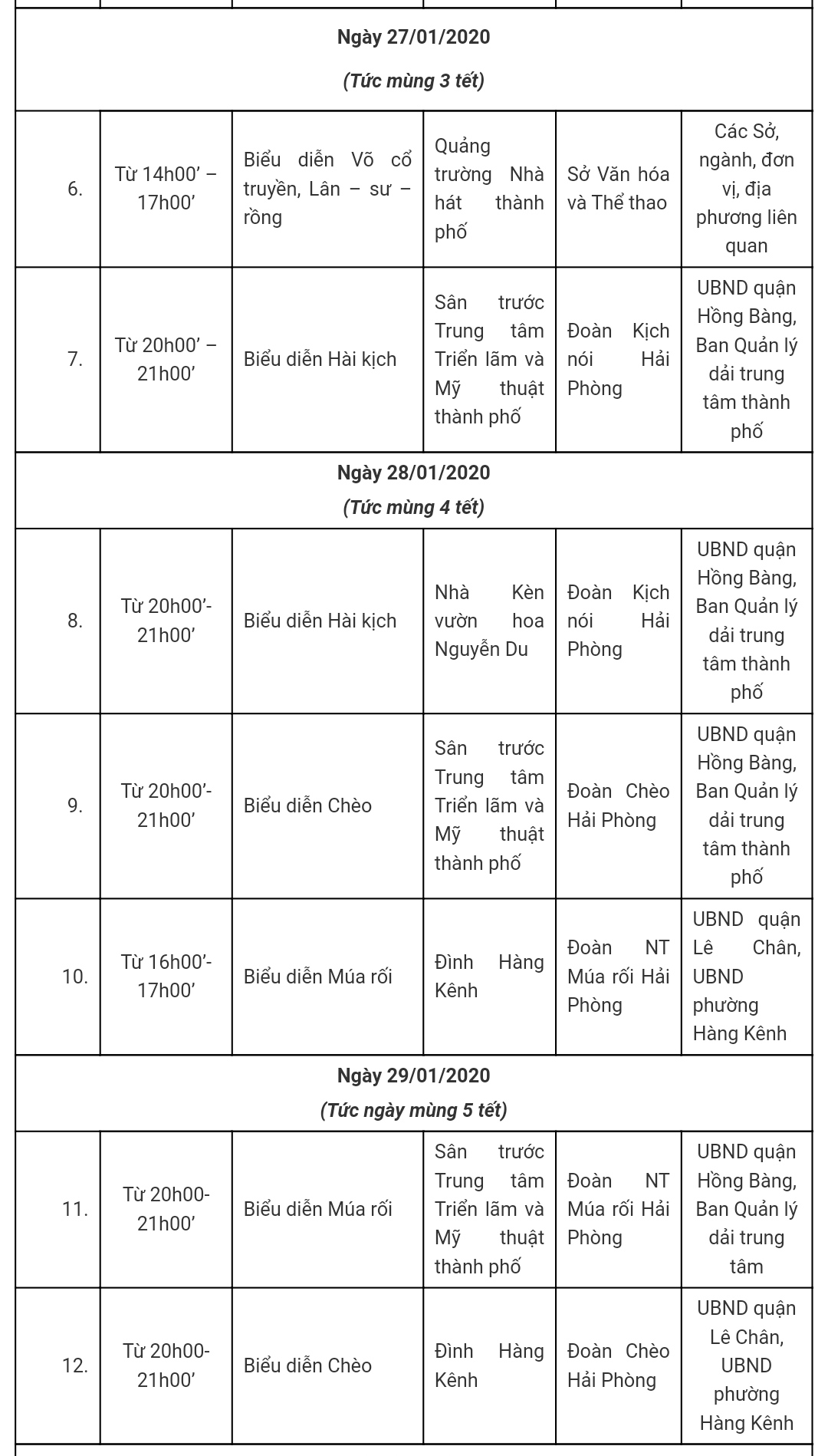 Dưới đây là nội dung chương trình chi tiết các hoạt động biểu diễn nghệ thuật, thể dục thể thao phục vụ nhân dân trong dịp Tết Nguyên đán Canh Tý 2020: