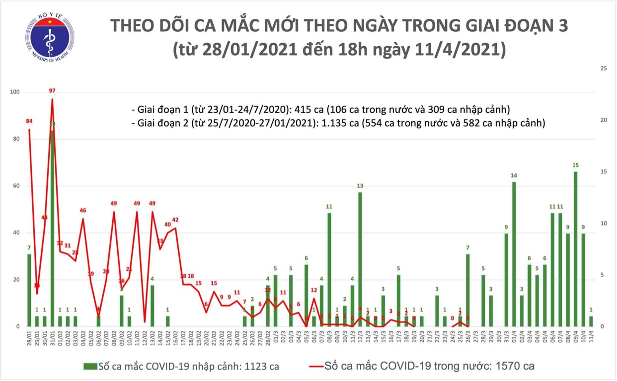 – Tính từ 6h đến 18h ngày 11/4: 01 ca mắc mới được cách ly ngay sau khi nhập cảnh.