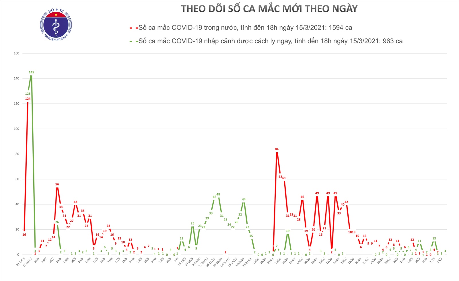 – Tính đến 18h ngày 15/3: Việt Nam có tổng cộng 1594 ca mắc COVID-19 do lây nhiễm trong nước, trong đó số lượng ca mắc mới tính từ ngày 27/1 đến nay: 901 ca.