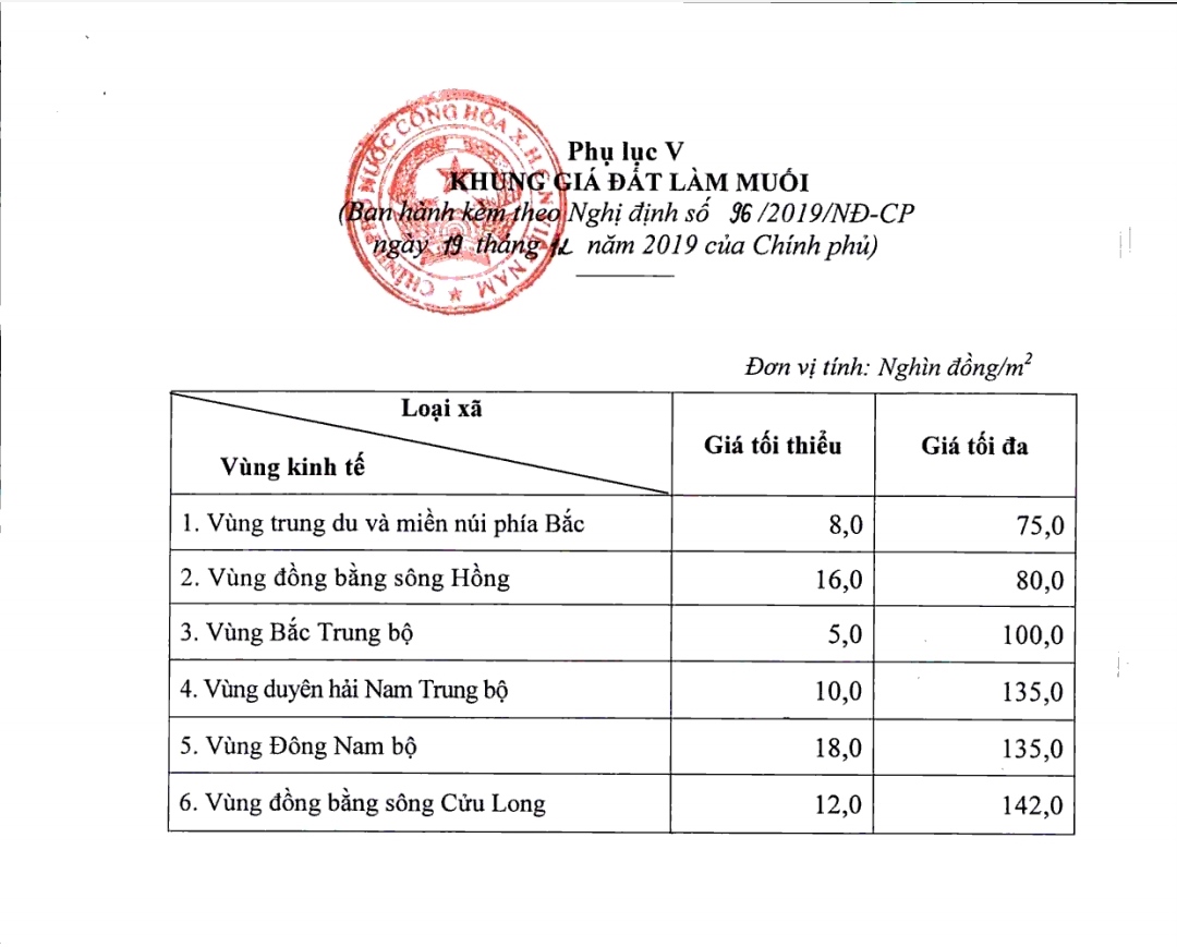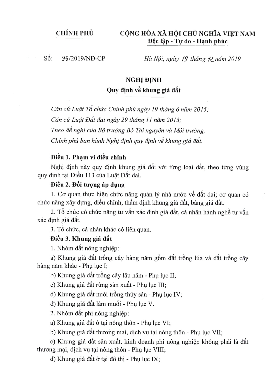 Chính phủ vừa ban hành Nghị định 96/2019/NĐ-CP quy định khung giá đất đối với từng loại đất, theo từng vùng quy định tại Điều 113 Luật Đất đai 2013.