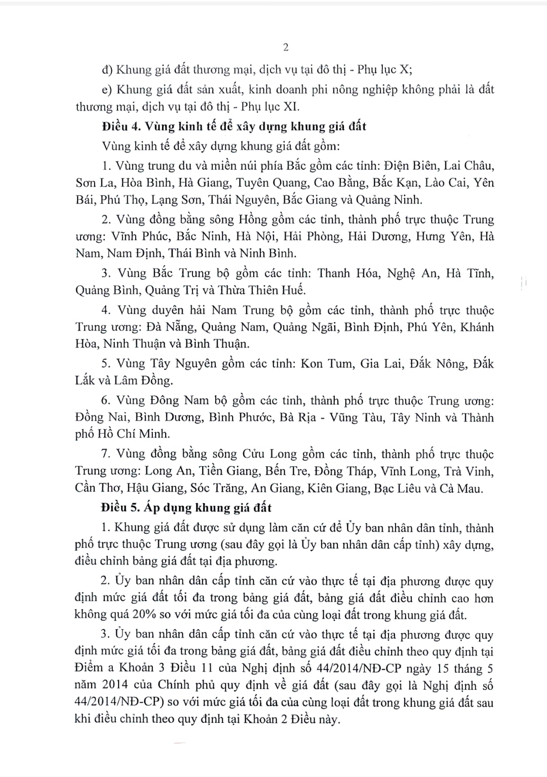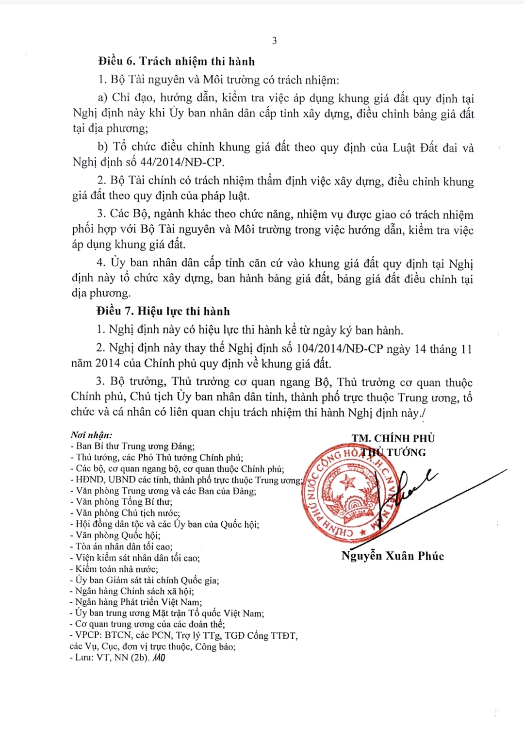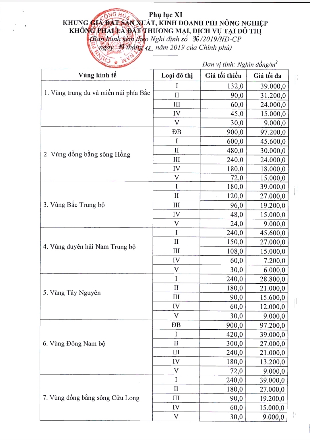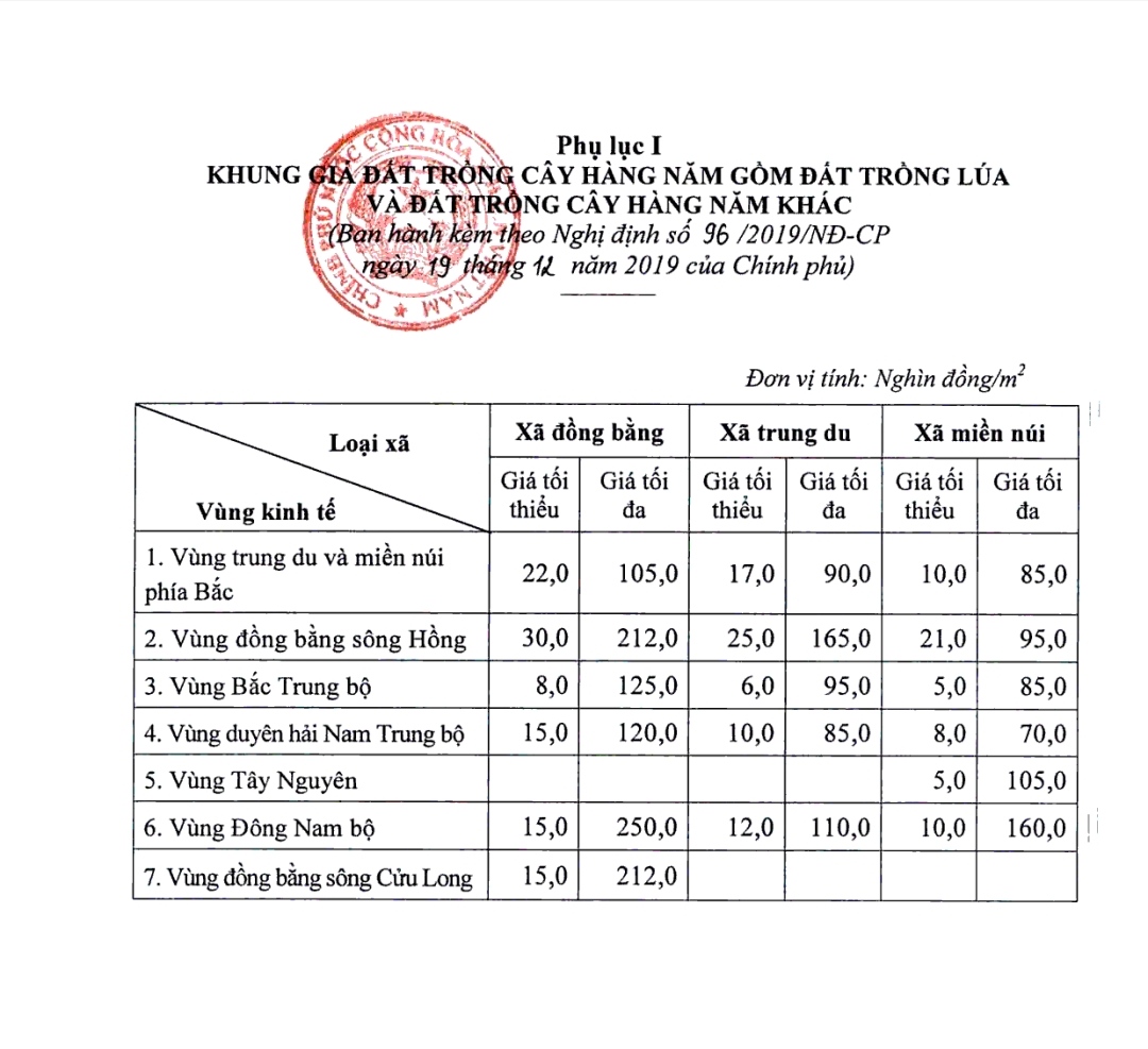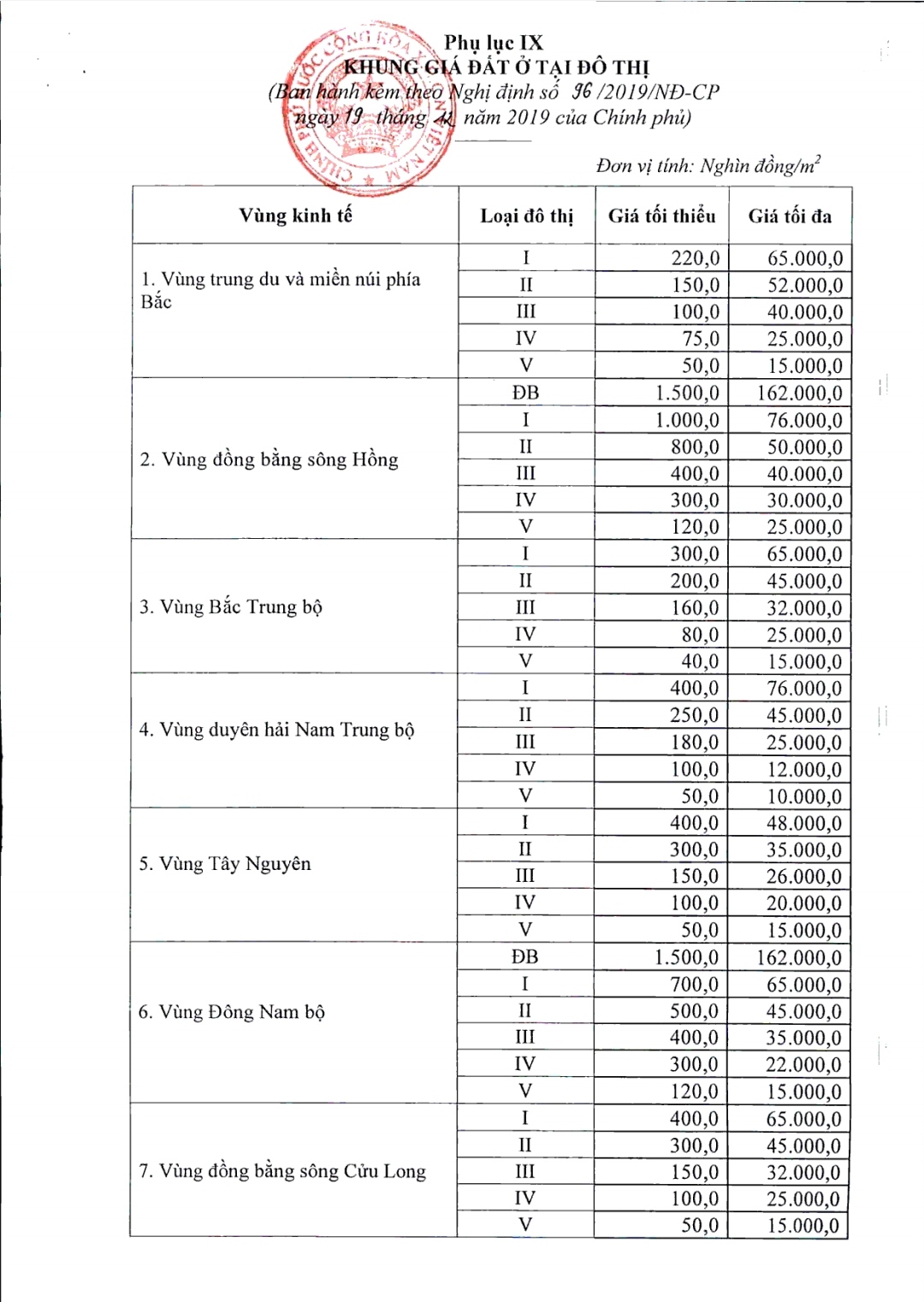 Theo quy định tại Nghị định này, có hiệu lực kể từ ngày ký, khung giá đất giai đoạn 2020-2024 quy định như sau: