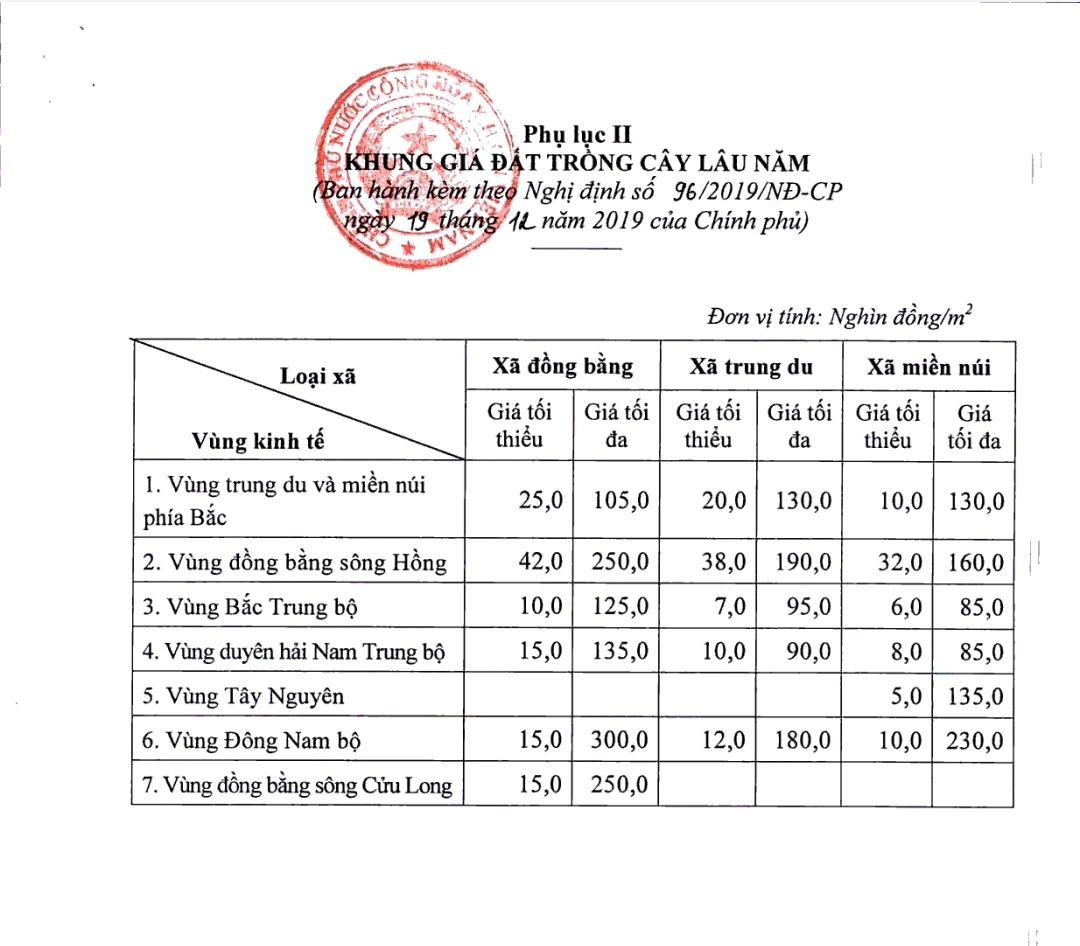 – Khung giá đất trồng cây lâu năm – Phụ lục II;