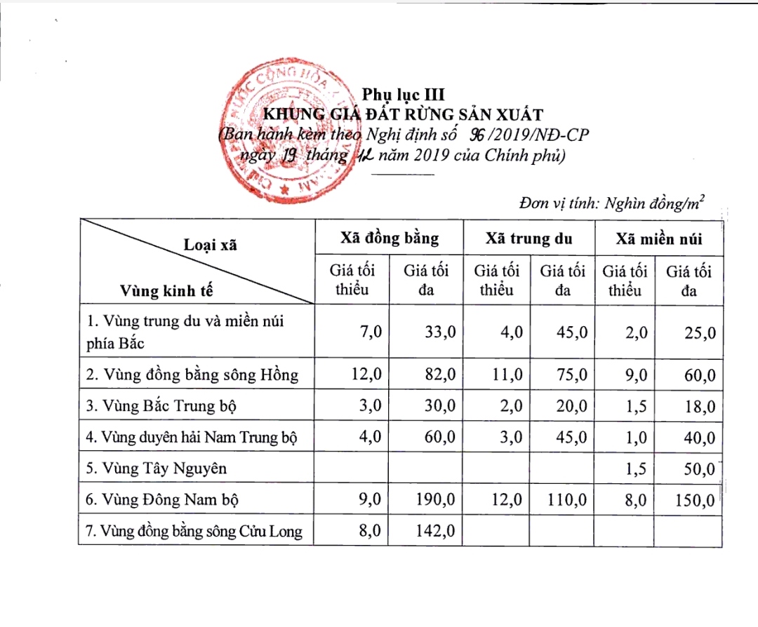 – Khung giá đất rừng sản xuất – Phụ lục III;