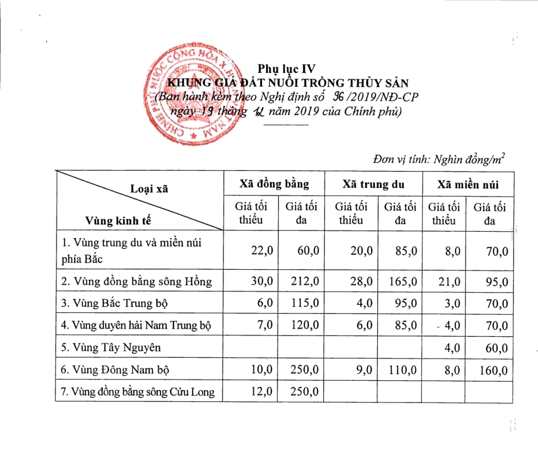 – Khung giá đất nuôi trồng thủy sản – Phụ lục IV;
