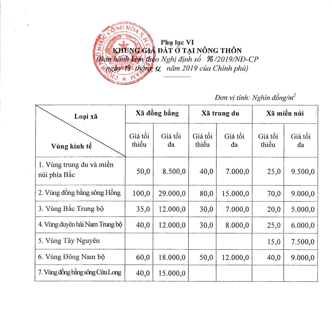 – Khung giá đất ở tại nông thôn – Phụ lục VI;