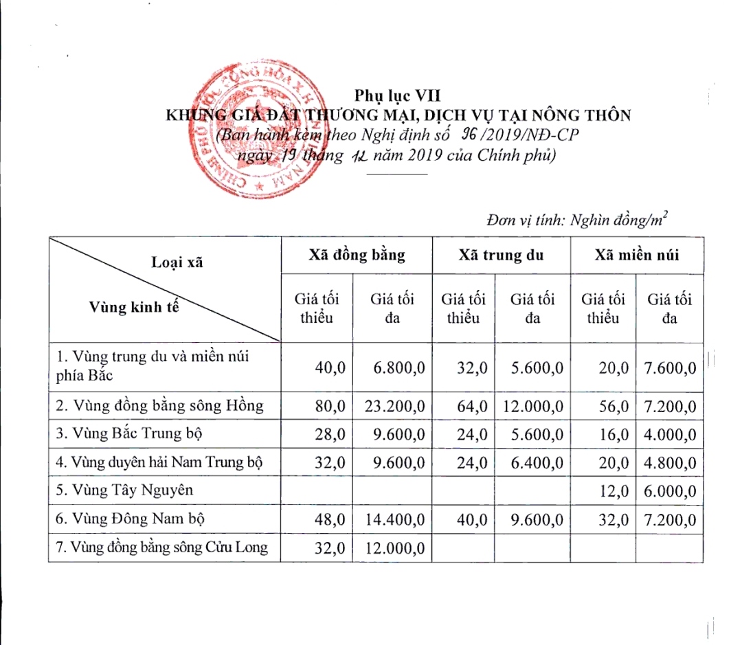 – Khung giá đất thương mại, dịch vụ tại nông thôn – Phụ lục VII;