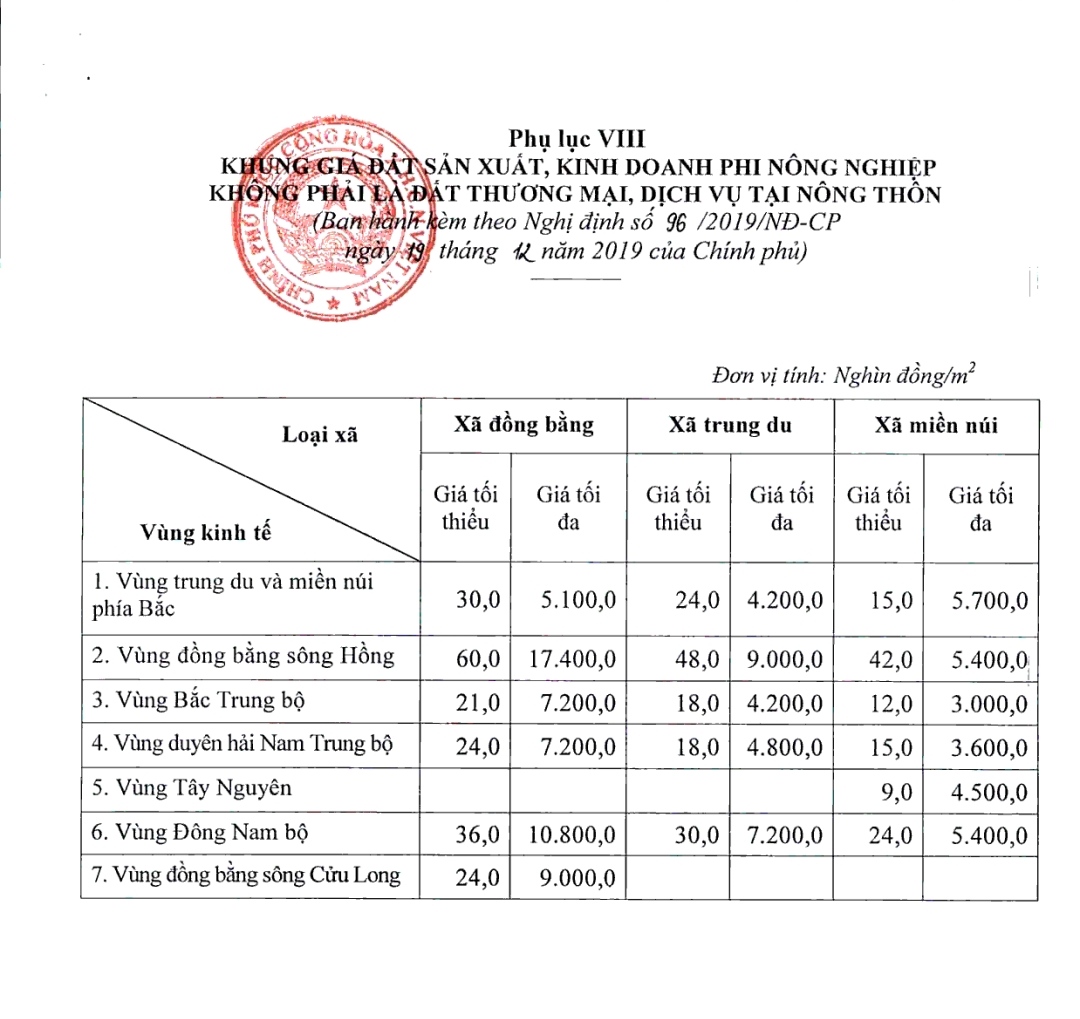 – Khung giá đất sản xuất, kinh doanh phi nông nghiệp không phải là đất thương mại, dịch vụ tại nông thôn – Phụ lục VIII;