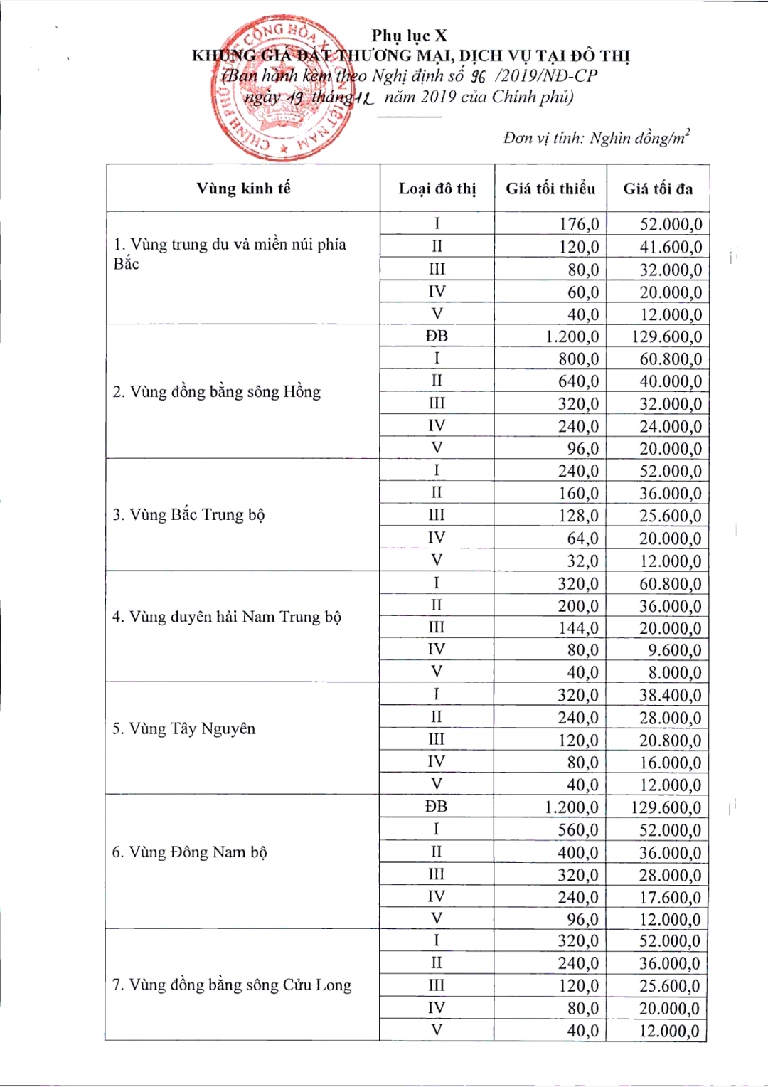 – Khung giá đất thương mại, dịch vụ tại đô thị – Phụ lục X;
