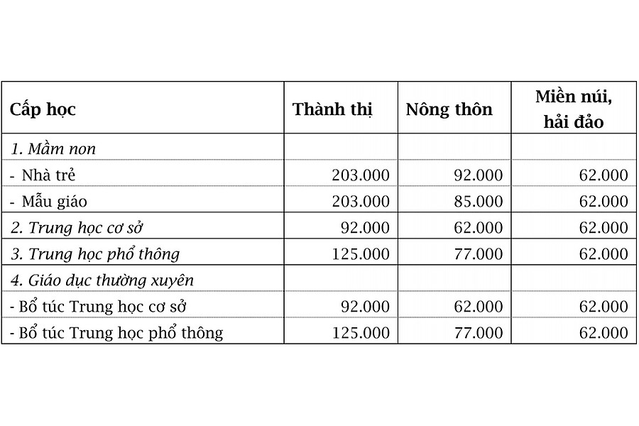 (Đơn vị: đồng/học sinh/tháng)