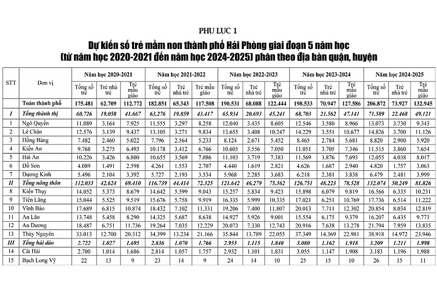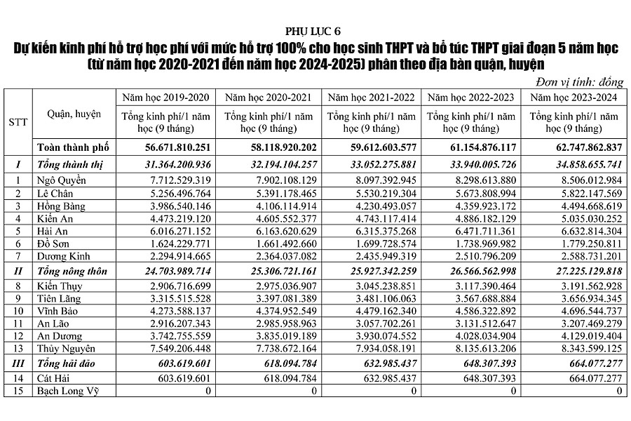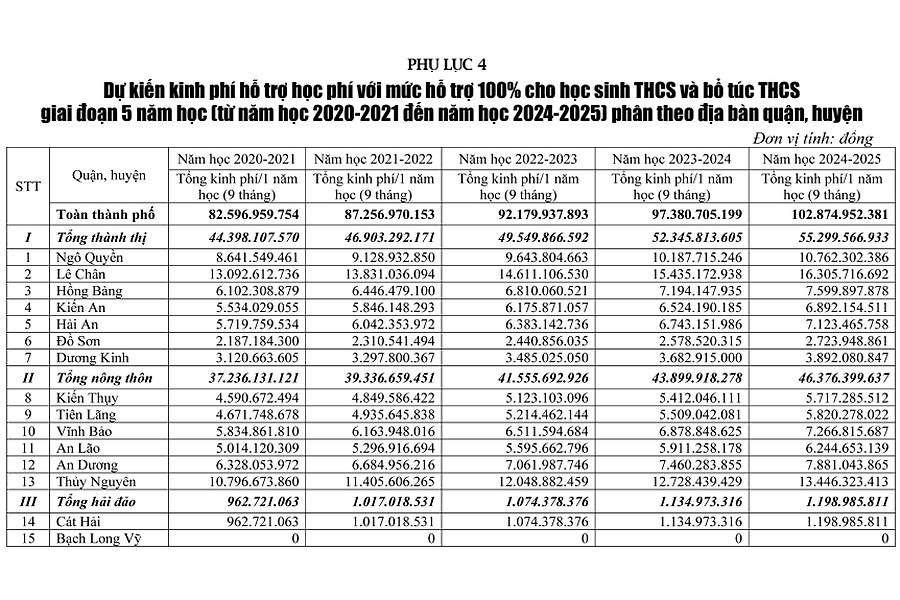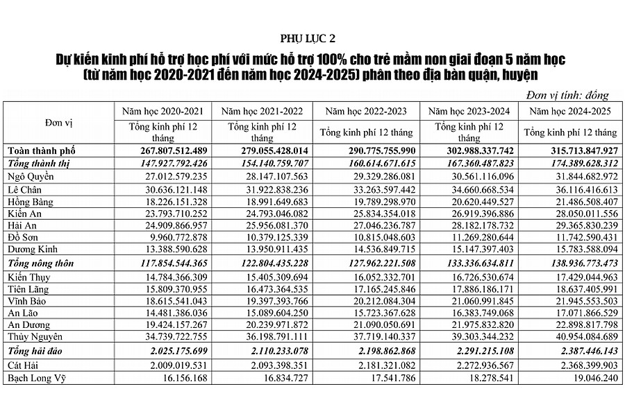 Ở giai đoạn 1, thực hiện hỗ trợ học phí cho trẻ mầm non, học sinh trung học cơ sở và bổ túc trung học cơ sở trên địa bàn thành phố Hải Phòng