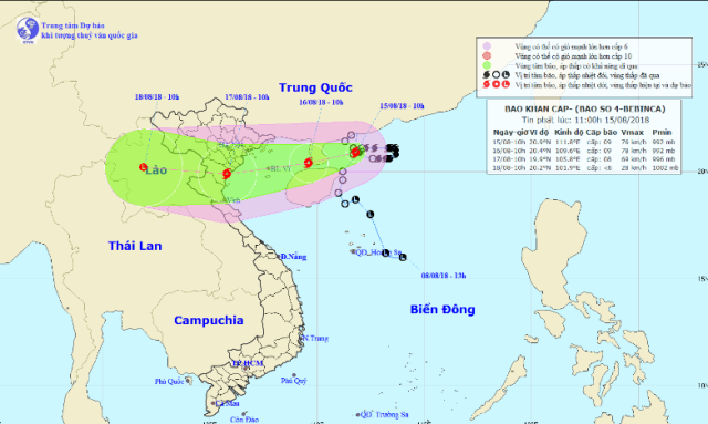 Hồi 10 giờ ngày 15/8, vị trí tâm bão ở vào khoảng 20,9 độ Vĩ Bắc; 111,9 độ Kinh Đông, trên vùng biển phía Nam tỉnh Quảng Đông (Trung Quốc), cách Móng Cái 450km, cách Thái Bình 570km, cách Vinh 700km. Sức gió mạnh nhất vùng gần tâm bão mạnh cấp 9 (75-90km/giờ), giật cấp 11. Phạm vi gió mạnh cấp 6, giật cấp 8 khoảng 110km tính từ tâm bão.